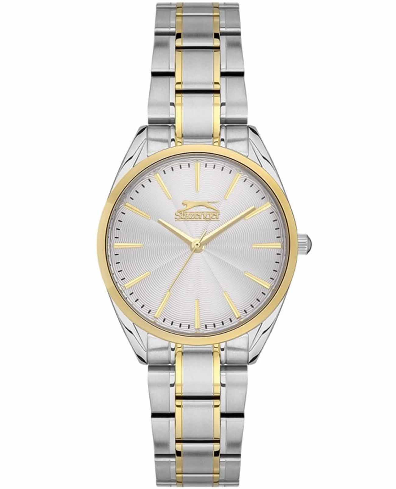Эти стильные женские часы Slazenger SL.09.2155.3.03 идеально подчеркивают утонченный вкус своей обладательницы. Они оснащены надежным кварцевым механизмом, который обеспечивает точность хода. Корпус выполнен из качественного суперметалла, а безельБезельВнешний ободок, закрепляющий стекло. В спортивных часах так называется поворотное кольцо с делениями на циферблате, выполняет роль таймера – замеряет отрезки времени на шкале. Неподвижный безель – элемент декора. Однонаправленно вращающийся безель на дайверских часах позволяет фиксировать моменты погружения и выныривания на поверхность. с золотистым IP-покрытиемIP-покрытиеМетод ионного напыления. Демонстрирует повышенную устойчивость к истиранию, окислению и химическим веществам. Под воздействием высокого давления и температуры около 1500°C молекулы металла надёжно соединяются с частицами корпуса часов. придаёт аксессуару современный вид и дополнительную прочность. Минеральное стеклоМинеральное стеклоМинеральное стекло представляет собой искусственно выращенный минерал кварца. Такое стекло отличается особой устойчивостью к повреждениям и царапинам. Уступает по некоторым качествам сапфировому стеклу. надежно защищает циферблат от возможных повреждений. Серебристый циферблат выполнен по технологии Sunray, что создает эффект солнечных лучей и придает часам особую изысканность. Металлический браслет с частичным золотистым IP-покрытиемIP-покрытиеМетод ионного напыления. Демонстрирует повышенную устойчивость к истиранию, окислению и химическим веществам. Под воздействием высокого давления и температуры около 1500°C молекулы металла надёжно соединяются с частицами корпуса часов. и с раскладной застёжкойРаскладная застёжкаТакой тип застёжки используется только на браслетах из металла. Она никогда не раскрывается полностью, происходит разделение на 2 и более частей. Раскладывающая застёжка снизит вероятность потери часов к минимуму. обеспечивает комфортное и надежное прилегание к запястью. Диаметр корпуса составляет 32 мм, а толщина — всего 9 мм, что придаёт часам изящность и элегантность. Водозащита уровня WR 30 позволяет не беспокоиться о небольших брызгах, которые могут возникнуть в повседневной жизни. Вес часов составляет 78 грамм, что делает их легкими и удобными для ежедневного ношения. Эти часы станут идеальным аксессуаром, подчеркивающим стиль и индивидуальность современной женщины.