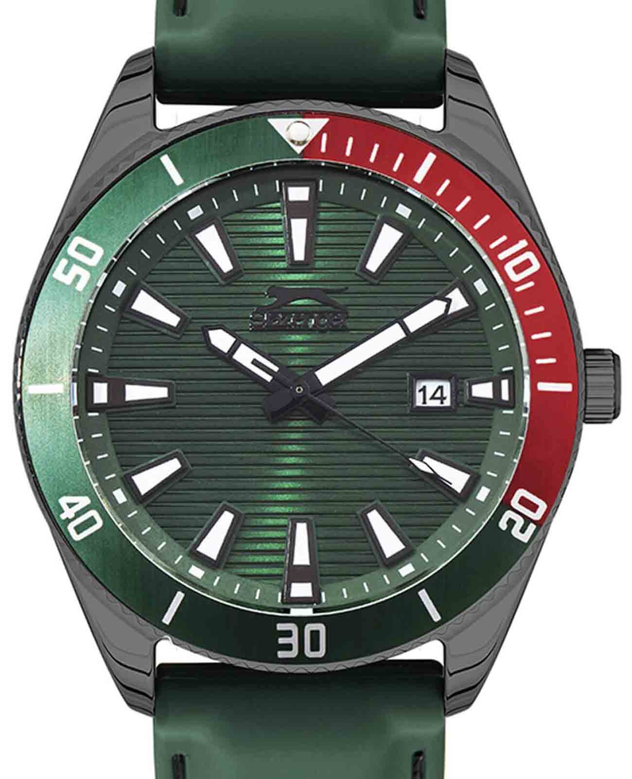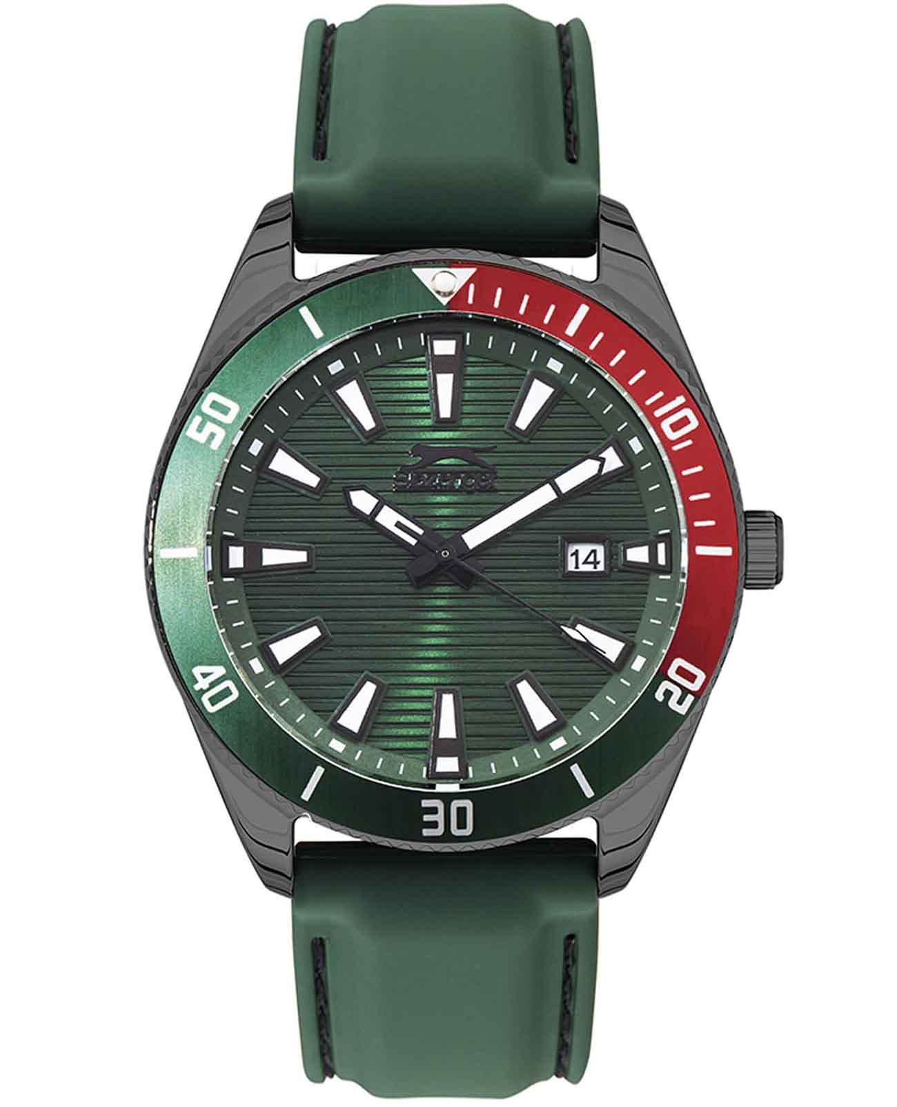 Мужские наручные часы Slazenger SL.09.2174.2.03 — стильный аксессуар с ярко выраженными спортивными чертами, который станет надежным спутником в повседневной жизни. Эти часы оснащены кварцевым механизмом, обеспечивающим высокую точность хода. Металлический корпус с черным IP-покрытиемIP-покрытиеМетод ионного напыления. Демонстрирует повышенную устойчивость к истиранию, окислению и химическим веществам. Под воздействием высокого давления и температуры около 1500°C молекулы металла надёжно соединяются с частицами корпуса часов. в сочетании с зеленым силиконовый ремешком на классической застежке шириной 22 мм создает гармоничный и современный образ. Диаметр корпуса составляет 44 мм, а толщина — 14 мм, что придает часам стильный и выразительный вид. Вращающийся безельБезельВнешний ободок, закрепляющий стекло. В спортивных часах так называется поворотное кольцо с делениями на циферблате, выполняет роль таймера – замеряет отрезки времени на шкале. Неподвижный безель – элемент декора. Однонаправленно вращающийся безель на дайверских часах позволяет фиксировать моменты погружения и выныривания на поверхность. с зеленым и красным IP-покрытиемIP-покрытиеМетод ионного напыления. Демонстрирует повышенную устойчивость к истиранию, окислению и химическим веществам. Под воздействием высокого давления и температуры около 1500°C молекулы металла надёжно соединяются с частицами корпуса часов., что придает ему дополнительную прочность и устойчивость к износу. Минеральное стеклоМинеральное стеклоМинеральное стекло представляет собой искусственно выращенный минерал кварца. Такое стекло отличается особой устойчивостью к повреждениям и царапинам. Уступает по некоторым качествам сапфировому стеклу. защищает циферблат от царапин и внешних воздействий, а водозащита уровня WR 50 позволяет не беспокоиться о случайных контактах с водой, будь то дождь или мытье рук. Часы также оснащены функцией отображения даты в отдельном окошке, что добавляет удобства в ежедневном использовании. Люминесцентное покрытиеЛюминесцентное покрытиеПозволяет считывать показания времени в темноте. Производители наносят на стрелки, часовые индексы, безель или поверхность циферблата светонакопительный состав, дающий холодное свечение. на стрелках и метках обеспечивает отличную видимость в темноте.