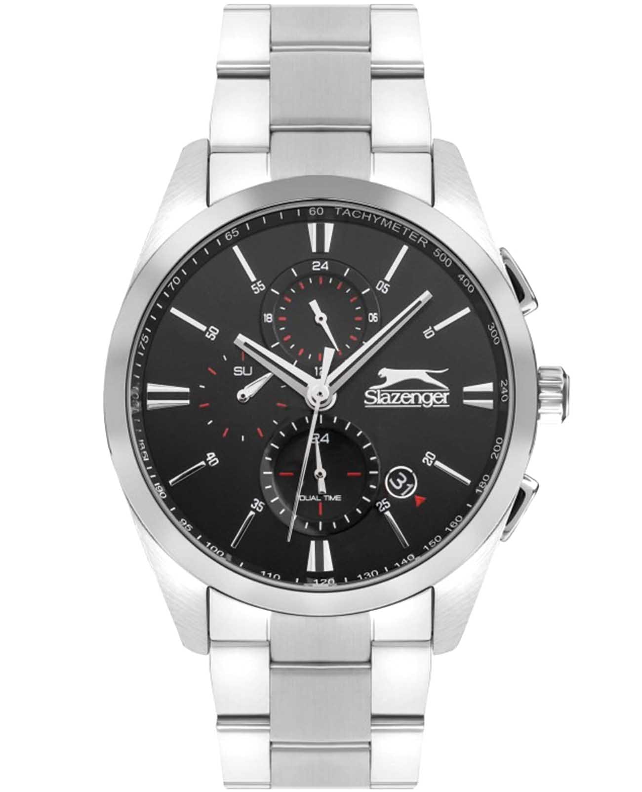 Часы Slazenger SL.09.2215.2.02 представляют собой стильные мужские наручные часы, которые сочетают в себе элегантный дизайн и функциональность. Изготовленные в Англии, эти кварцевые часы оснащены прочным металлическим корпусом и металлическим браслетом с раскладной застёжкойРаскладная застёжкаТакой тип застёжки используется только на браслетах из металла. Она никогда не раскрывается полностью, происходит разделение на 2 и более частей. Раскладывающая застёжка снизит вероятность потери часов к минимуму., который обеспечивает надежную фиксацию на запястье. Минеральное стеклоМинеральное стеклоМинеральное стекло представляет собой искусственно выращенный минерал кварца. Такое стекло отличается особой устойчивостью к повреждениям и царапинам. Уступает по некоторым качествам сапфировому стеклу. защищает черный циферблат от царапин, а водозащита WR 50 позволяет использовать их в условиях повышенной влажности. Диаметр корпуса составляет 43 мм, а толщина — 14 мм, что делает часы удобными для ежедневного ношения. Ширина ремешка — 22 мм, что обеспечивает комфорт и стильный вид на руке. Дополнительные функции включают отображение второго часового поясаВторой часовой поясФункция, позволяющая отображать время двух часовых поясов одновременно., дня недели и текущего времени в 24-часовом формате, а также наличие окошка даты для удобства пользователя. Стрелки снабжены люминесцентным покрытиемЛюминесцентное покрытиеПозволяет считывать показания времени в темноте. Производители наносят на стрелки, часовые индексы, безель или поверхность циферблата светонакопительный состав, дающий холодное свечение., что позволяет легко считывать время в темноте. Часы также оснащены тахиметромТахиметрРазмеченная шкала, располагается на ободке или безеле часов. Тахиметр позволяет рассчитать скорость на определённом участке пути, расстояние измеряется в километрах или милях., что добавляет им функциональности и может быть полезно для измерения скорости.