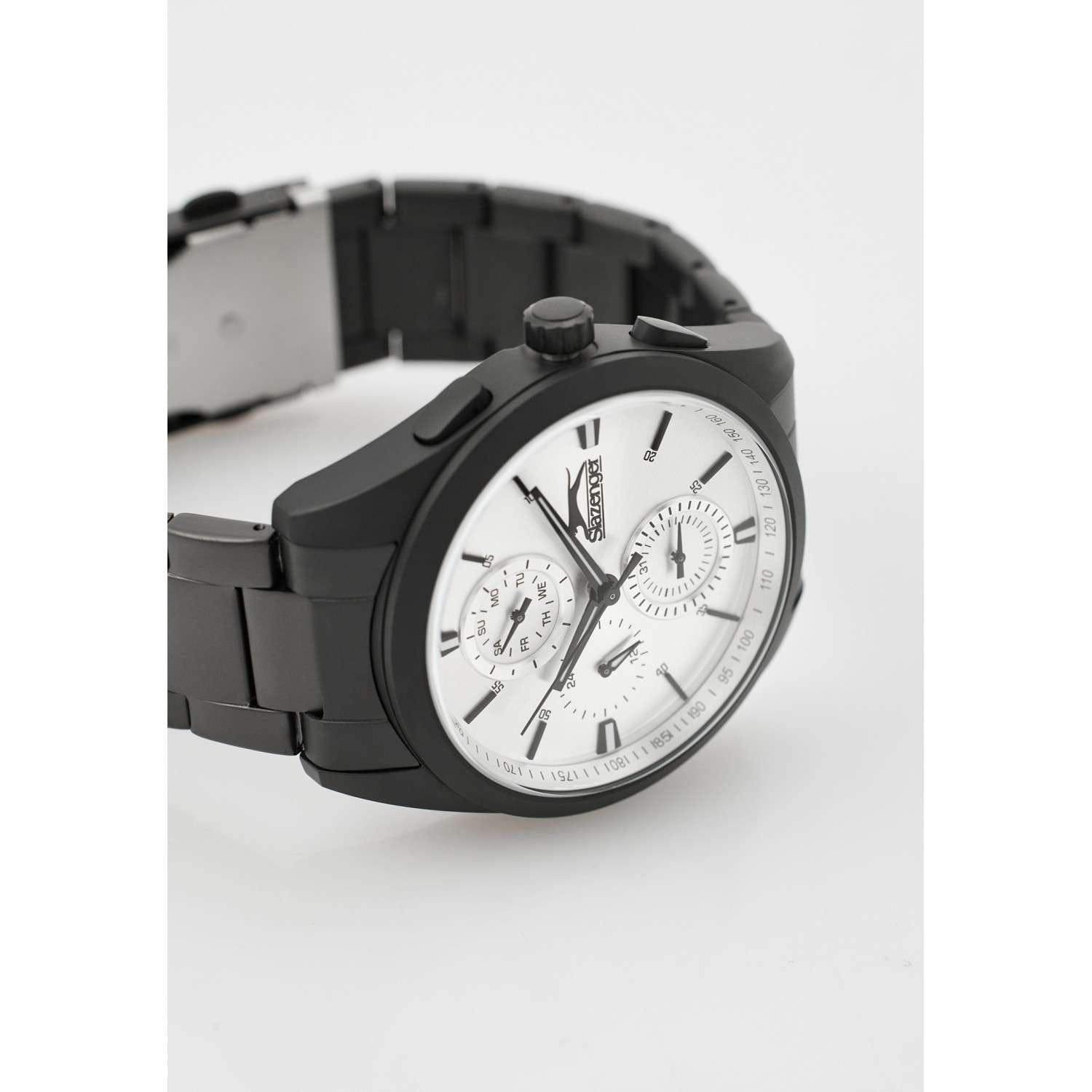 Часы Slazenger SL.09.2215.2.06 представляют собой стильные мужские наручные часы, которые сочетают в себе элегантный дизайн и функциональность. Изготовленные в Англии, эти кварцевые часы оснащены прочным металлическим корпусом и черным металлическим браслетом с раскладной застёжкойРаскладная застёжкаТакой тип застёжки используется только на браслетах из металла. Она никогда не раскрывается полностью, происходит разделение на 2 и более частей. Раскладывающая застёжка снизит вероятность потери часов к минимуму., который обеспечивает надежную фиксацию на запястье, также на них нанесено IP-покрытиеIP-покрытиеМетод ионного напыления. Демонстрирует повышенную устойчивость к истиранию, окислению и химическим веществам. Под воздействием высокого давления и температуры около 1500°C молекулы металла надёжно соединяются с частицами корпуса часов.. Минеральное стеклоМинеральное стеклоМинеральное стекло представляет собой искусственно выращенный минерал кварца. Такое стекло отличается особой устойчивостью к повреждениям и царапинам. Уступает по некоторым качествам сапфировому стеклу. защищает серебристый циферблат от царапин, а водозащита WR 50 позволяет использовать их в условиях повышенной влажности. Диаметр корпуса составляет 43 мм, а толщина — 14 мм, что делает часы удобными для ежедневного ношения. Ширина ремешка — 22 мм, что обеспечивает комфорт и стильный вид на руке. Дополнительные функции включают отображение второго часового поясаВторой часовой поясФункция, позволяющая отображать время двух часовых поясов одновременно., дня недели и текущего времени в 24-часовом формате, а также наличие окошка даты для удобства пользователя. Стрелки снабжены люминесцентным покрытиемЛюминесцентное покрытиеПозволяет считывать показания времени в темноте. Производители наносят на стрелки, часовые индексы, безель или поверхность циферблата светонакопительный состав, дающий холодное свечение., что позволяет легко считывать время в темноте. Часы также оснащены тахиметромТахиметрРазмеченная шкала, располагается на ободке или безеле часов. Тахиметр позволяет рассчитать скорость на определённом участке пути, расстояние измеряется в километрах или милях., что добавляет им функциональности и может быть полезно для измерения скорости.