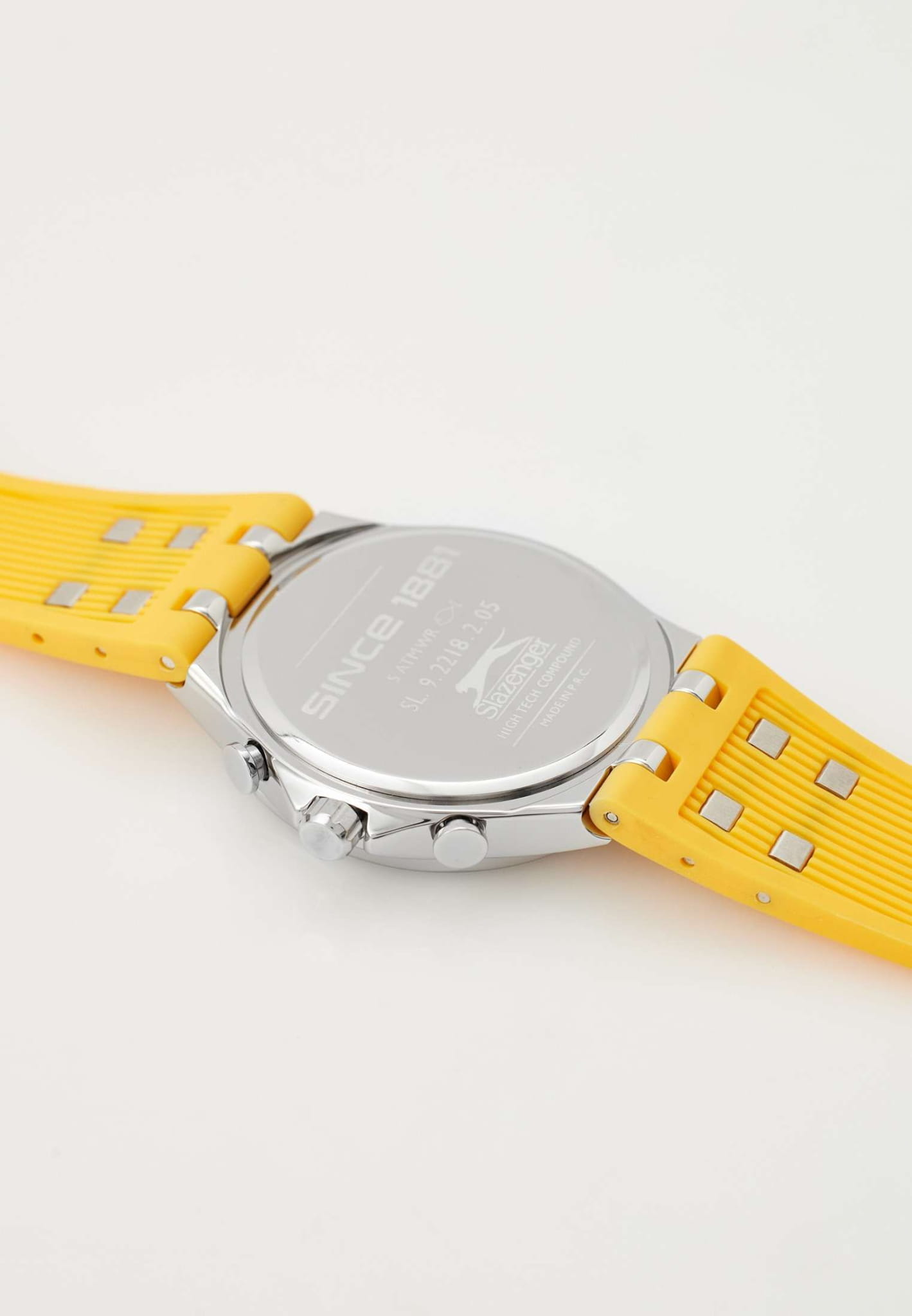Мужские наручные часы Slazenger SL.09.2218.2.05 — идеальный аксессуар для тех, кто ценит стиль и функциональность. Эти часы, созданные известным британским брендом, отличаются высоким качеством и надежностью. Оснащенные кварцевым механизмом, они гарантируют точность хода и долгий срок службы. Корпус часов выполнен из прочного металла, а черный циферблат защищен минеральным стекломМинеральное стеклоМинеральное стекло представляет собой искусственно выращенный минерал кварца. Такое стекло отличается особой устойчивостью к повреждениям и царапинам. Уступает по некоторым качествам сапфировому стеклу., устойчивым к царапинам и повреждениям. Желтый резиновый ремешок с металлическими вставками и классической застежкой обеспечивает комфортное ношение и надежную фиксацию на запястье. Диаметр корпуса составляет 46 мм, а толщина — 12 мм, что придает часам современный и стильный вид. Благодаря водозащите уровня WR 50, вы можете не беспокоиться о случайных попаданиях влаги, что делает эти часы идеальными для повседневного использования. Стрелки снабжены люминесцентным покрытиемЛюминесцентное покрытиеПозволяет считывать показания времени в темноте. Производители наносят на стрелки, часовые индексы, безель или поверхность циферблата светонакопительный состав, дающий холодное свечение., что позволяет легко считывать время в темноте. Функциональность модели включает в себя отображение даты, дня недели и времени в 24-часовом формате на дополнительных малых циферблатах, что делает часы не только стильными, но и практичными.