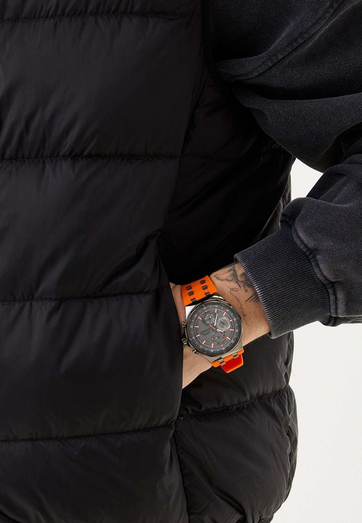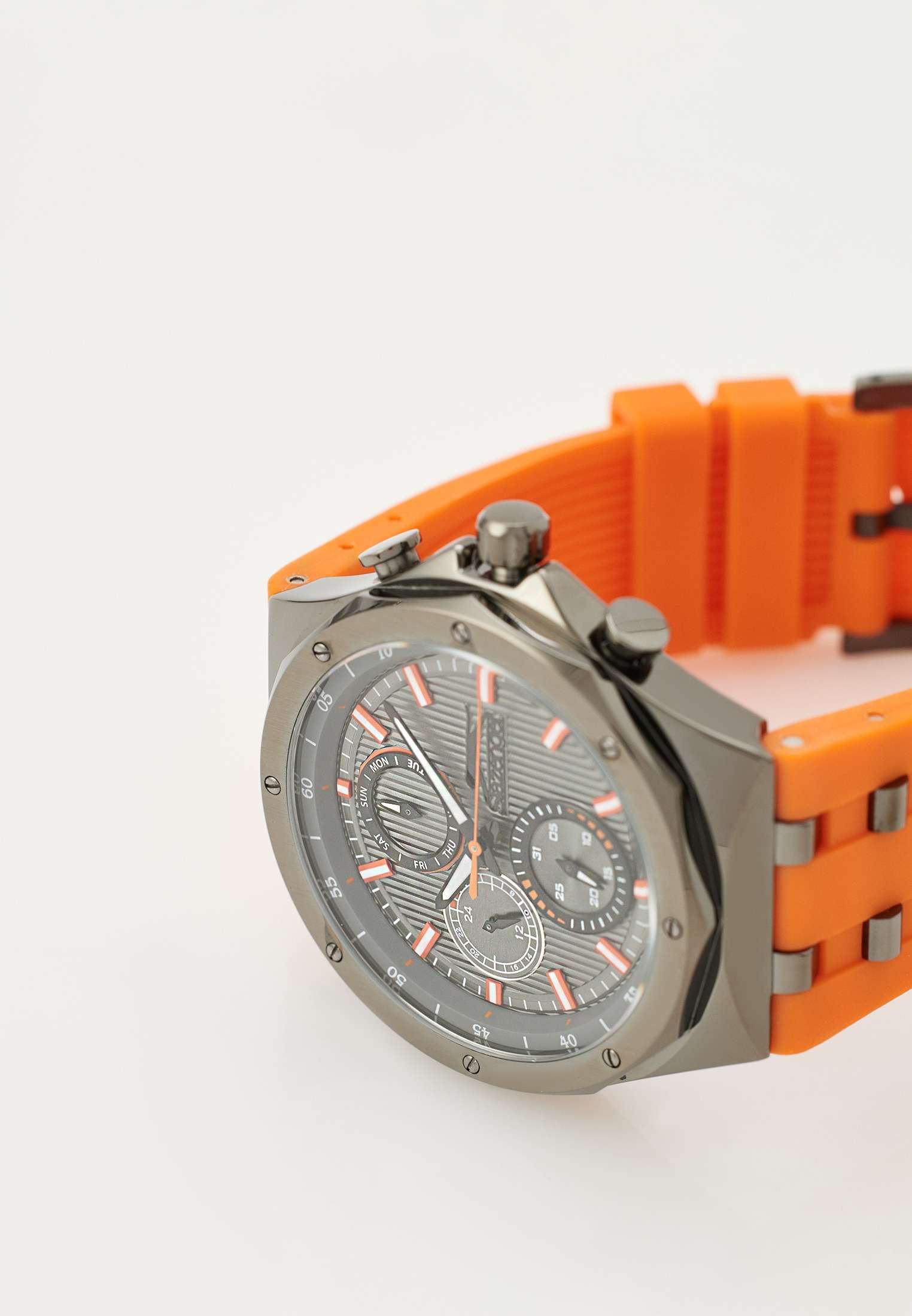 Мужские наручные часы Slazenger SL.09.2218.2.07 — идеальный аксессуар для тех, кто ценит стиль и функциональность. Эти часы, созданные известным британским брендом, отличаются высоким качеством и надежностью. Оснащенные кварцевым механизмом, они гарантируют точность хода и долгий срок службы. Корпус часов выполнен из прочного металла с серым IP-покрытиемIP-покрытиеМетод ионного напыления. Демонстрирует повышенную устойчивость к истиранию, окислению и химическим веществам. Под воздействием высокого давления и температуры около 1500°C молекулы металла надёжно соединяются с частицами корпуса часов., а такой же серый циферблат защищен минеральным стекломМинеральное стеклоМинеральное стекло представляет собой искусственно выращенный минерал кварца. Такое стекло отличается особой устойчивостью к повреждениям и царапинам. Уступает по некоторым качествам сапфировому стеклу., устойчивым к царапинам и повреждениям. Оранжевый резиновый ремешок с металлическими вставками с серым IP-покрытиемIP-покрытиеМетод ионного напыления. Демонстрирует повышенную устойчивость к истиранию, окислению и химическим веществам. Под воздействием высокого давления и температуры около 1500°C молекулы металла надёжно соединяются с частицами корпуса часов. и классической застежкой обеспечивает комфортное ношение и надежную фиксацию на запястье. Диаметр корпуса составляет 46 мм, а толщина — 12 мм, что придает часам современный и стильный вид. Благодаря водозащите уровня WR 50, вы можете не беспокоиться о случайных попаданиях влаги, что делает эти часы идеальными для повседневного использования. Стрелки снабжены люминесцентным покрытиемЛюминесцентное покрытиеПозволяет считывать показания времени в темноте. Производители наносят на стрелки, часовые индексы, безель или поверхность циферблата светонакопительный состав, дающий холодное свечение., что позволяет легко считывать время в темноте. Функциональность модели включает в себя отображение даты, дня недели и времени в 24-часовом формате на дополнительных малых циферблатах, что делает часы не только стильными, но и практичными.