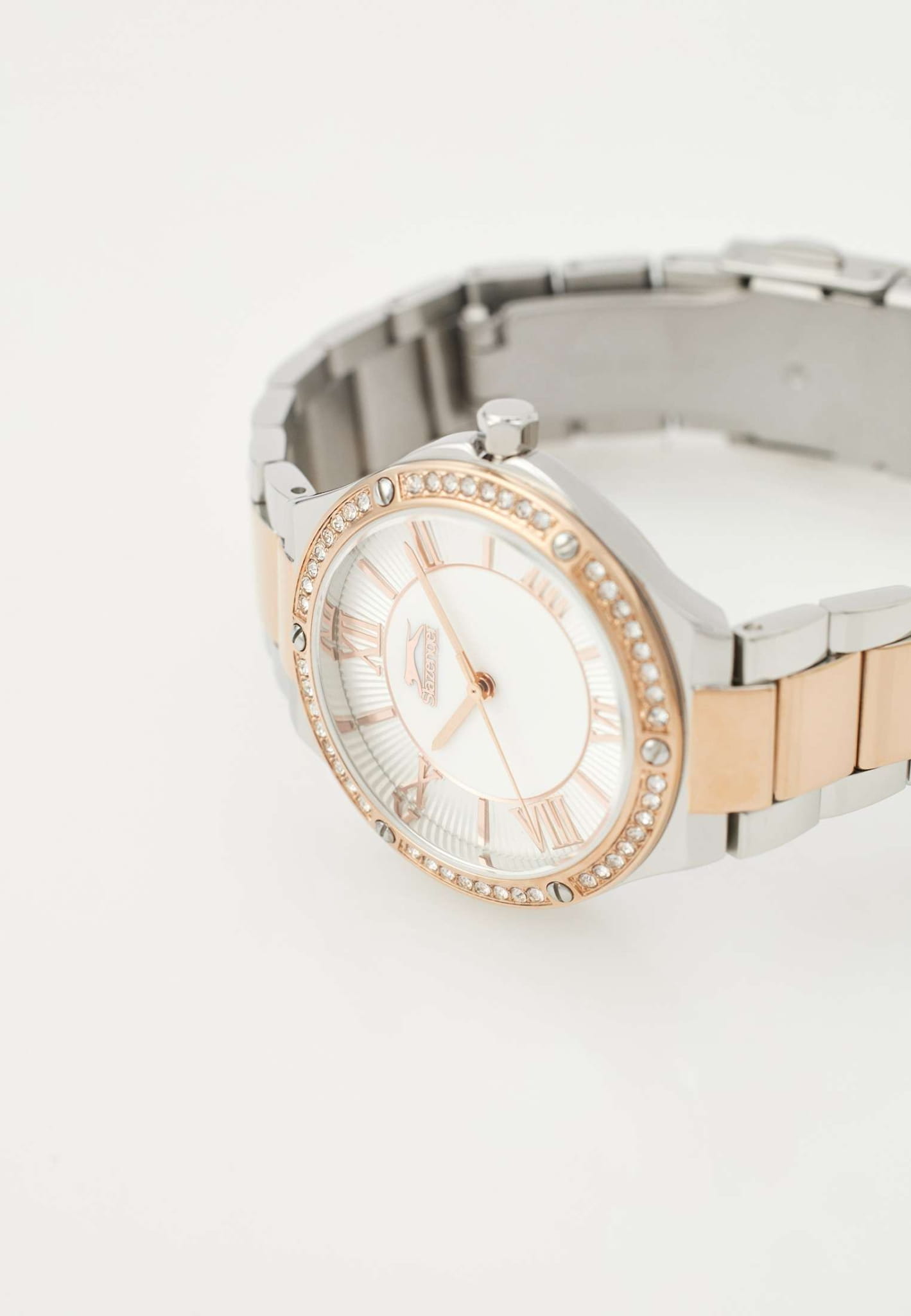 Часы Slazenger SL.09.2225.3.02 — это изысканный аксессуар, который подчеркнёт ваш стиль и индивидуальность. Модель оснащена надёжным кварцевым механизмом, обеспечивающим точность хода. Корпус из прочного металла диаметром 35 мм, а безельБезельВнешний ободок, закрепляющий стекло. В спортивных часах так называется поворотное кольцо с делениями на циферблате, выполняет роль таймера – замеряет отрезки времени на шкале. Неподвижный безель – элемент декора. Однонаправленно вращающийся безель на дайверских часах позволяет фиксировать моменты погружения и выныривания на поверхность. с розово-золотистым IP-покрытиемIP-покрытиеМетод ионного напыления. Демонстрирует повышенную устойчивость к истиранию, окислению и химическим веществам. Под воздействием высокого давления и температуры около 1500°C молекулы металла надёжно соединяются с частицами корпуса часов. украшен сияющими кристаллами. Перламутровый циферблат придаёт часам особый шарм. Металлический серебристый браслет с частичным розово-золотистым  IP-покрытиемIP-покрытиеМетод ионного напыления. Демонстрирует повышенную устойчивость к истиранию, окислению и химическим веществам. Под воздействием высокого давления и температуры около 1500°C молекулы металла надёжно соединяются с частицами корпуса часов. с удобной раскладной застёжкойРаскладная застёжкаТакой тип застёжки используется только на браслетах из металла. Она никогда не раскрывается полностью, происходит разделение на 2 и более частей. Раскладывающая застёжка снизит вероятность потери часов к минимуму. гармонично дополняет изящный дизайн. Минеральное стеклоМинеральное стеклоМинеральное стекло представляет собой искусственно выращенный минерал кварца. Такое стекло отличается особой устойчивостью к повреждениям и царапинам. Уступает по некоторым качествам сапфировому стеклу. защищает циферблат от царапин, а водозащита уровня WR 30 позволяет не беспокоиться о случайных каплях воды. Заводная головка оснащена специальной защитой. Эти часы станут прекрасным выбором для тех, кто ценит сочетание элегантности и функциональности.