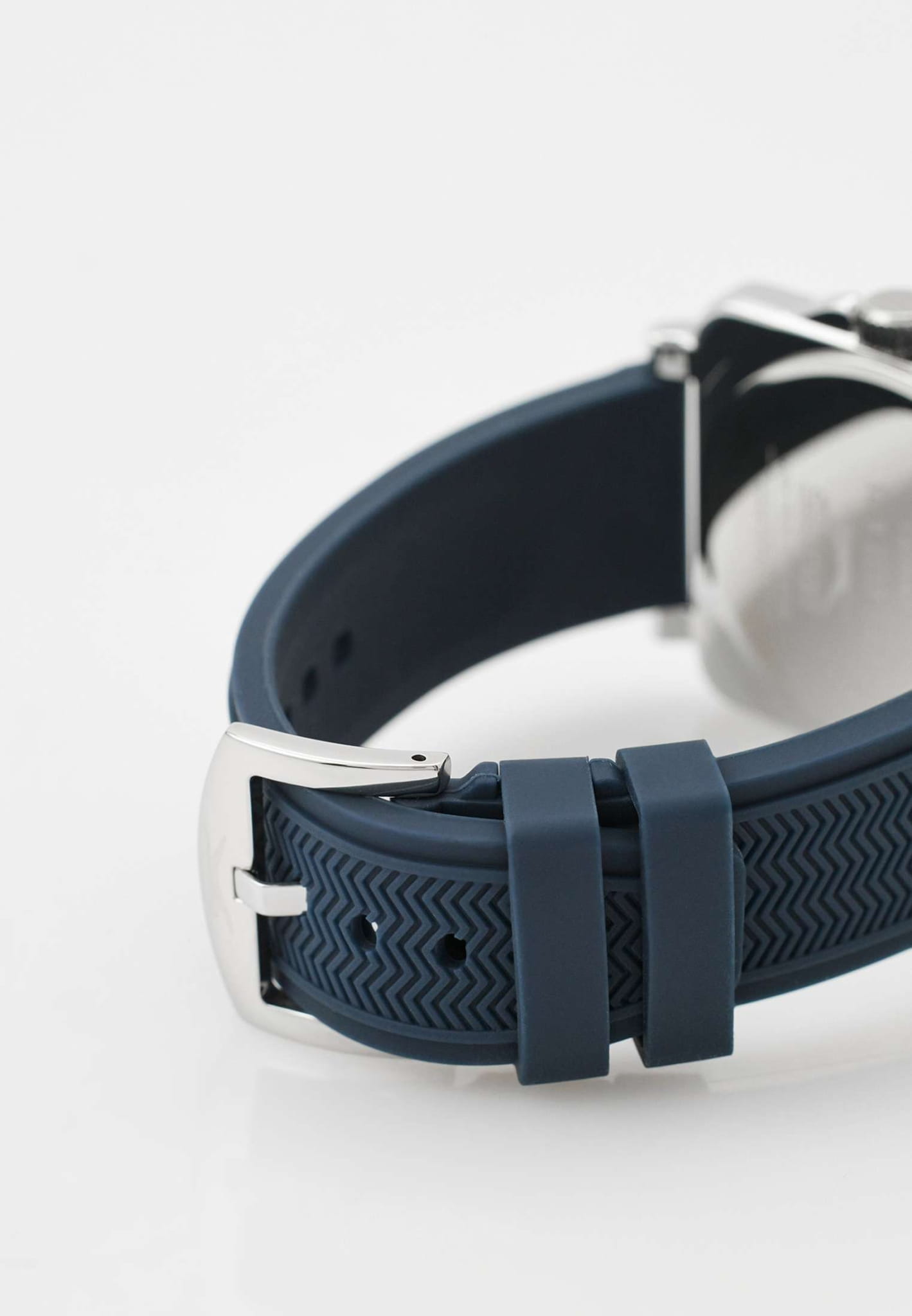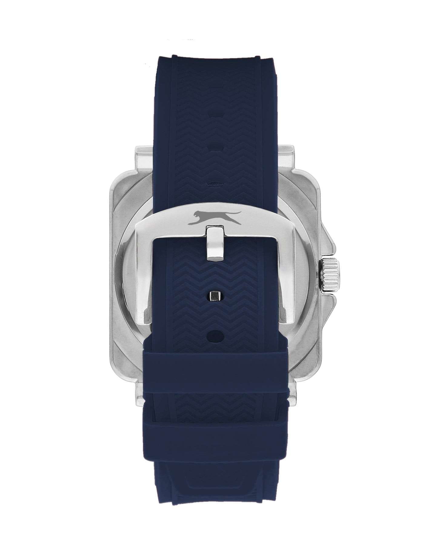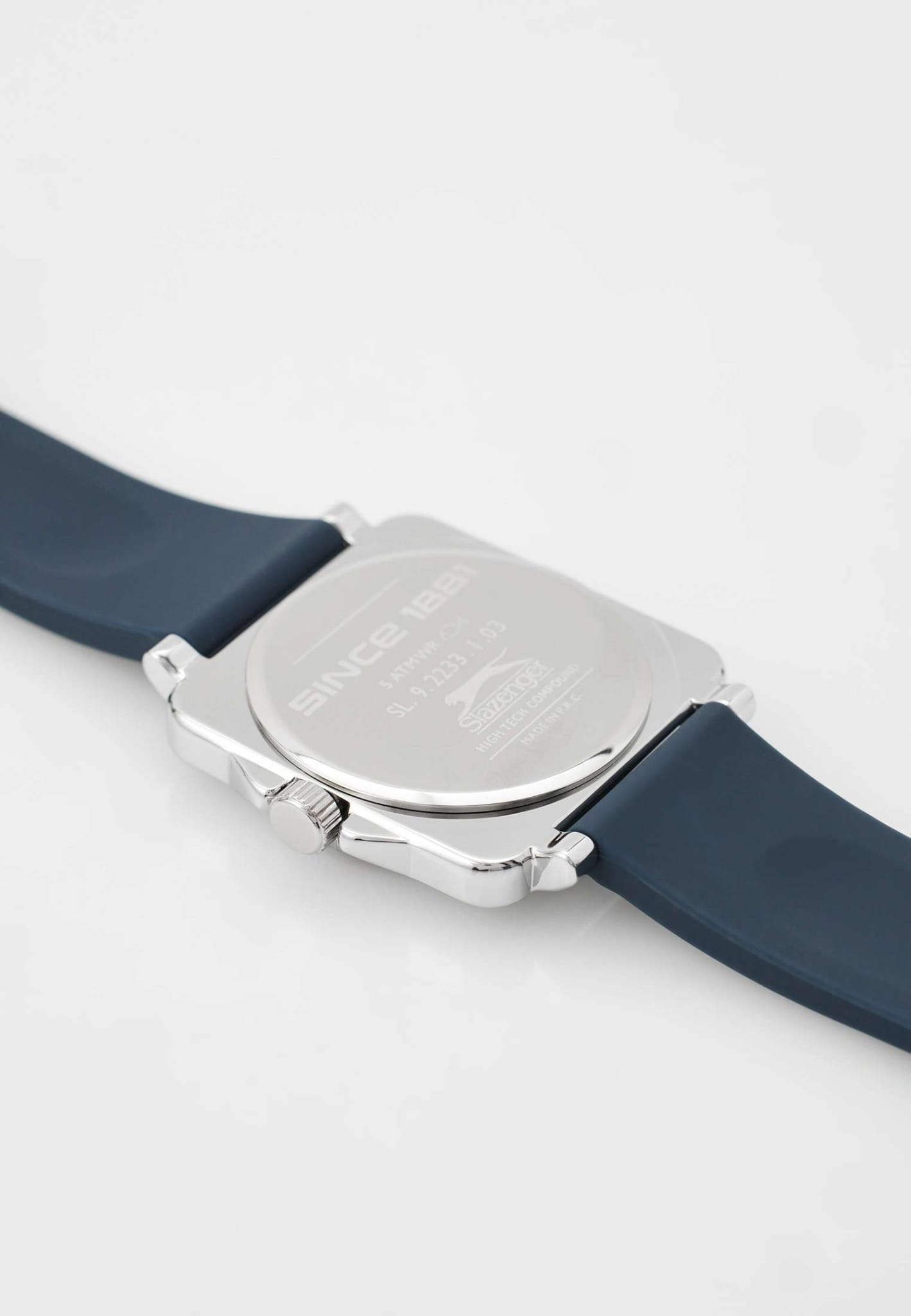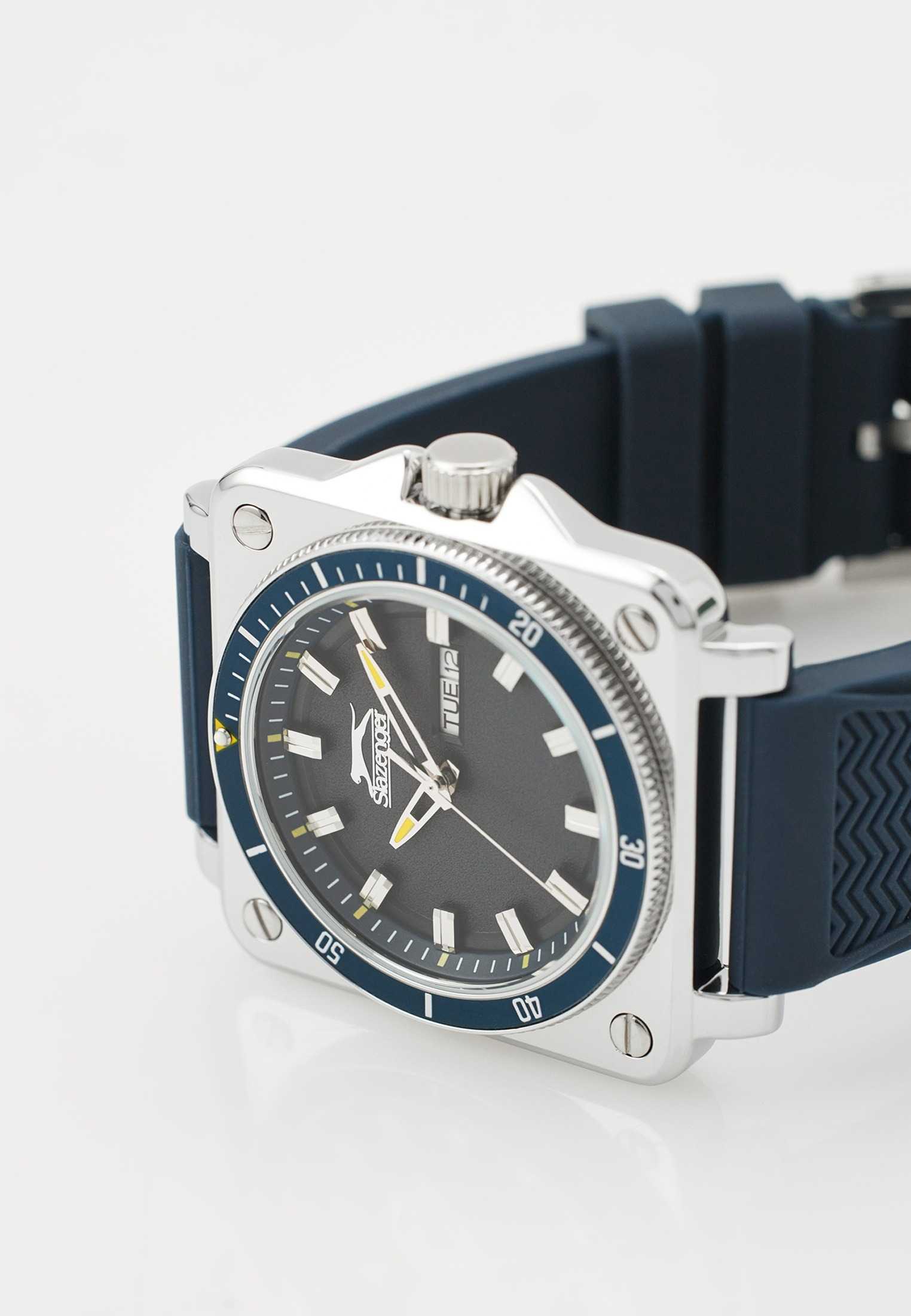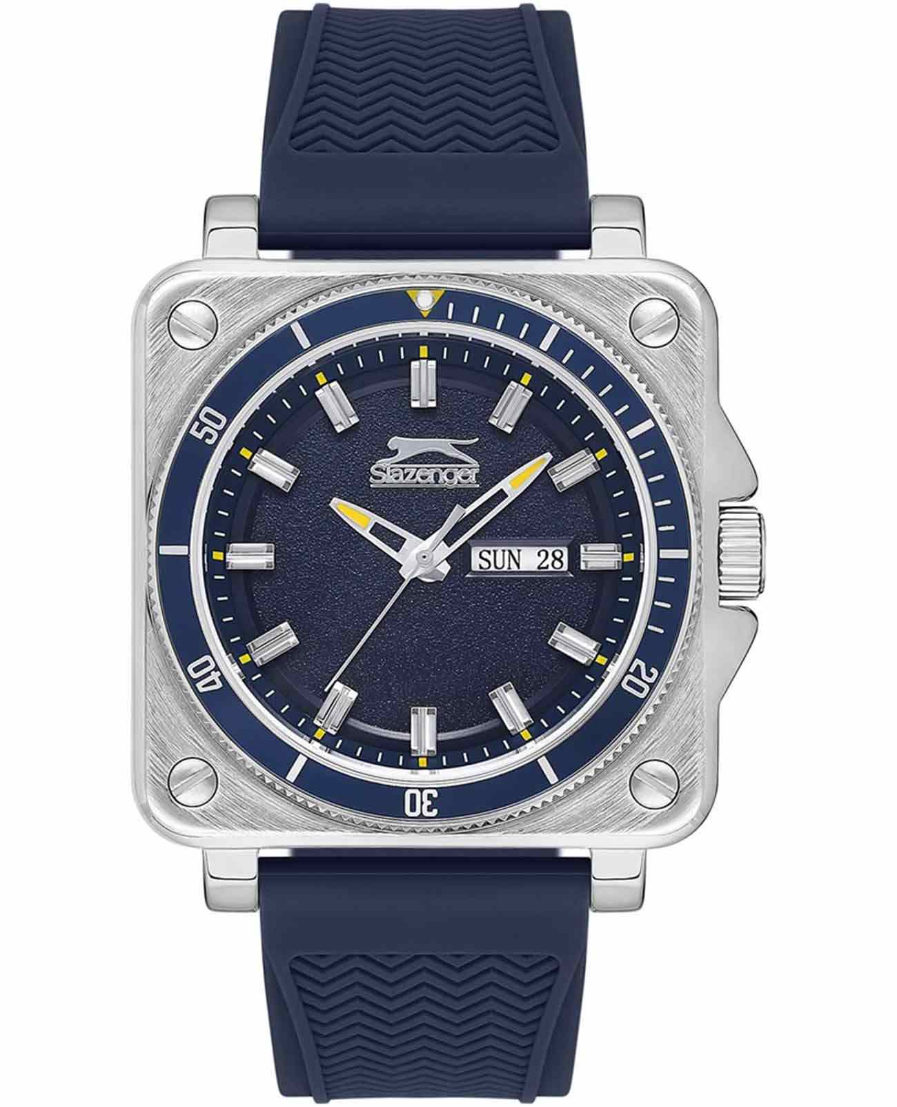 Часы Slazenger SL.09.2233.1.03 — это современная модель, сочетающая стиль и практичность. Корпус квадратной формы выполнен из прочного металла, а круглый синий циферблат придает дизайну особую выразительность. На вращающийся безельБезельВнешний ободок, закрепляющий стекло. В спортивных часах так называется поворотное кольцо с делениями на циферблате, выполняет роль таймера – замеряет отрезки времени на шкале. Неподвижный безель – элемент декора. Однонаправленно вращающийся безель на дайверских часах позволяет фиксировать моменты погружения и выныривания на поверхность. нанесено синее IP-покрытиеIP-покрытиеМетод ионного напыления. Демонстрирует повышенную устойчивость к истиранию, окислению и химическим веществам. Под воздействием высокого давления и температуры около 1500°C молекулы металла надёжно соединяются с частицами корпуса часов.. Резиновый синий ремешок с классической застежкой обеспечивает удобство при повседневном ношении. Модель оснащена кварцевым механизмом, минеральное стеклоМинеральное стеклоМинеральное стекло представляет собой искусственно выращенный минерал кварца. Такое стекло отличается особой устойчивостью к повреждениям и царапинам. Уступает по некоторым качествам сапфировому стеклу., защищающим от случайных повреждений, и водозащитой уровня WR 50, позволяющей не бояться контакта с водой в повседневных ситуациях. На циферблате расположены окошки даты и дня недели. Для удобства использования в темное время суток предусмотрено люминесцентное покрытиеЛюминесцентное покрытиеПозволяет считывать показания времени в темноте. Производители наносят на стрелки, часовые индексы, безель или поверхность циферблата светонакопительный состав, дающий холодное свечение. стрелок. Заводная головка дополнительно защищена от случайных нажатий. Габариты корпуса составляют 43 на 43 мм, толщина — 11 мм.