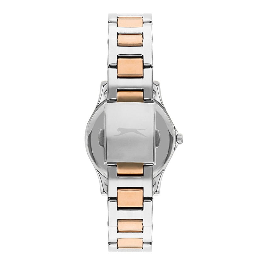 Женские наручные часы Slazenger SL.09.2235.3.02 сочетают в себе классический дизайн и надежность современных технологий. Модель обладает круглым корпусом диаметром 32 мм, изготовленным из прочного металла, что обеспечивает высокую устойчивость к внешним воздействиям. Индексы украшены фианитами. Браслет выполнен из металла с частичным розово-золотистым IP-покрытиемIP-покрытиеМетод ионного напыления. Демонстрирует повышенную устойчивость к истиранию, окислению и химическим веществам. Под воздействием высокого давления и температуры около 1500°C молекулы металла надёжно соединяются с частицами корпуса часов. и с раскладной застёжкойРаскладная застёжкаТакой тип застёжки используется только на браслетах из металла. Она никогда не раскрывается полностью, происходит разделение на 2 и более частей. Раскладывающая застёжка снизит вероятность потери часов к минимуму., гарантирующей комфортное ношение и безопасность. Циферблат перламутрового белого цвета декорирован золотистыми стрелками и индексами. Для защиты используется минеральное стеклоМинеральное стеклоМинеральное стекло представляет собой искусственно выращенный минерал кварца. Такое стекло отличается особой устойчивостью к повреждениям и царапинам. Уступает по некоторым качествам сапфировому стеклу., обеспечивающее прочную защиту от царапин. Часы работают на кварцевом механизме, что гарантирует точное время без необходимости подзаводки. Водонепроницаемость часов достигает 3 атмосфер, что позволяет использовать их при мытье рук или хождении под мелким дождем, однако не рекомендуется для плавания или других водных видов спорта. Вес модели составляет 72 грамма.