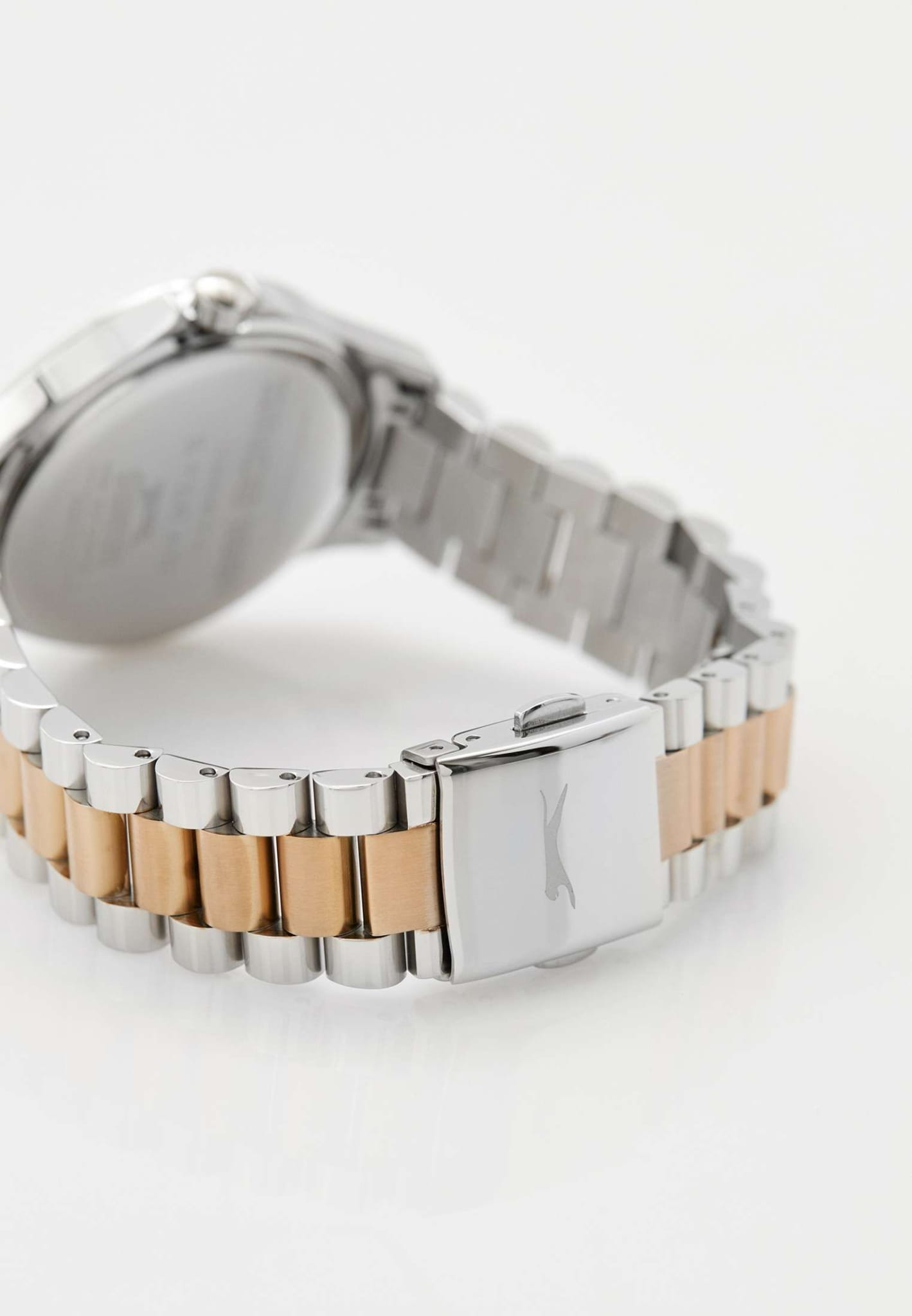 Эти женские часы Slazenger SL.09.2241.4.03 выполнены в современном стиле и станет элегантным дополнением к любому образу. Корпус и браслет изготовлены из прочного металла серебристого цвета, безельБезельВнешний ободок, закрепляющий стекло. В спортивных часах так называется поворотное кольцо с делениями на циферблате, выполняет роль таймера – замеряет отрезки времени на шкале. Неподвижный безель – элемент декора. Однонаправленно вращающийся безель на дайверских часах позволяет фиксировать моменты погружения и выныривания на поверхность. украшен изящными кристаллами, которые придают часам особую привлекательность. На циферблате расположены дополнительные малые циферблаты для отображения даты, дня недели и времени в 24-часовом формате, что делает их функциональными и удобными для ежедневного использования. Минеральное стеклоМинеральное стеклоМинеральное стекло представляет собой искусственно выращенный минерал кварца. Такое стекло отличается особой устойчивостью к повреждениям и царапинам. Уступает по некоторым качествам сапфировому стеклу. надежно защищает циферблат от царапин, а водозащита уровня WR 30 предохраняет механизм от случайных брызг воды. Заводная головка оснащена защитой, а стрелки имеют подсветку для легкого считывания времени в темноте. Диаметр корпуса составляет 34 мм, ширина браслета — 16 мм, толщина корпуса — 9 мм. Часы фиксируются на руке с помощью браслета из металла с частичным золотистым IP-покрытиемIP-покрытиеМетод ионного напыления. Демонстрирует повышенную устойчивость к истиранию, окислению и химическим веществам. Под воздействием высокого давления и температуры около 1500°C молекулы металла надёжно соединяются с частицами корпуса часов. удобной раскладной застёжкиРаскладная застёжкаТакой тип застёжки используется только на браслетах из металла. Она никогда не раскрывается полностью, происходит разделение на 2 и более частей. Раскладывающая застёжка снизит вероятность потери часов к минимуму.. Вес изделия подобран для комфортной ежедневной носки. Для удобства использования в темное время суток предусмотрено люминесцентное покрытиеЛюминесцентное покрытиеПозволяет считывать показания времени в темноте. Производители наносят на стрелки, часовые индексы, безель или поверхность циферблата светонакопительный состав, дающий холодное свечение. стрелок.