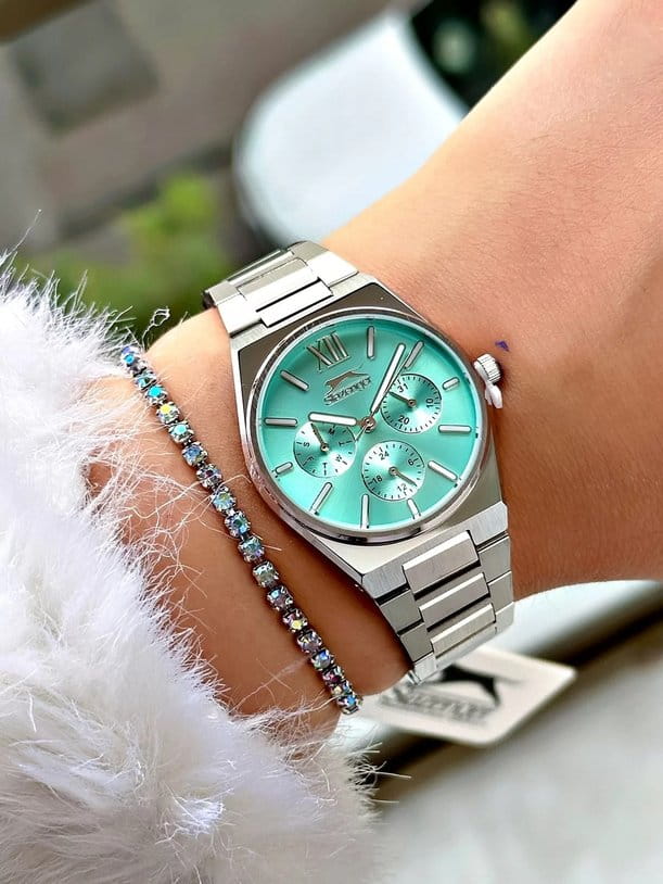 Часы Slazenger SL.09.2243.4.05 сочетают в себе элегантный дизайн и практичность для повседневного использования. Модель выполнена в изысканном серебряном цвете, корпус и браслет изготовлены из прочного металла, что обеспечивает надежность и долговечность изделия. Кварцевый механизм гарантирует точность хода, а минеральное стеклоМинеральное стеклоМинеральное стекло представляет собой искусственно выращенный минерал кварца. Такое стекло отличается особой устойчивостью к повреждениям и царапинам. Уступает по некоторым качествам сапфировому стеклу. защищает бирюзовый циферблат от механических повреждений. Диаметр корпуса составляет 34 мм, толщина — 9 мм, ширина ремешка — 20 мм, а общий вес часов — всего 87 грамм, что делает их легкими и комфортными на руке. Уровень водозащиты WR 30 позволяет не беспокоиться о случайных брызгах. Для удобства использования в темное время суток предусмотрено люминесцентное покрытиеЛюминесцентное покрытиеПозволяет считывать показания времени в темноте. Производители наносят на стрелки, часовые индексы, безель или поверхность циферблата светонакопительный состав, дающий холодное свечение. стрелок и меток. Дополнительные малые циферблаты отображают дату, день недели и время в 24-часовом формате. Часы оснащены металлическим браслетом с надежной раскладной застёжкойРаскладная застёжкаТакой тип застёжки используется только на браслетах из металла. Она никогда не раскрывается полностью, происходит разделение на 2 и более частей. Раскладывающая застёжка снизит вероятность потери часов к минимуму..