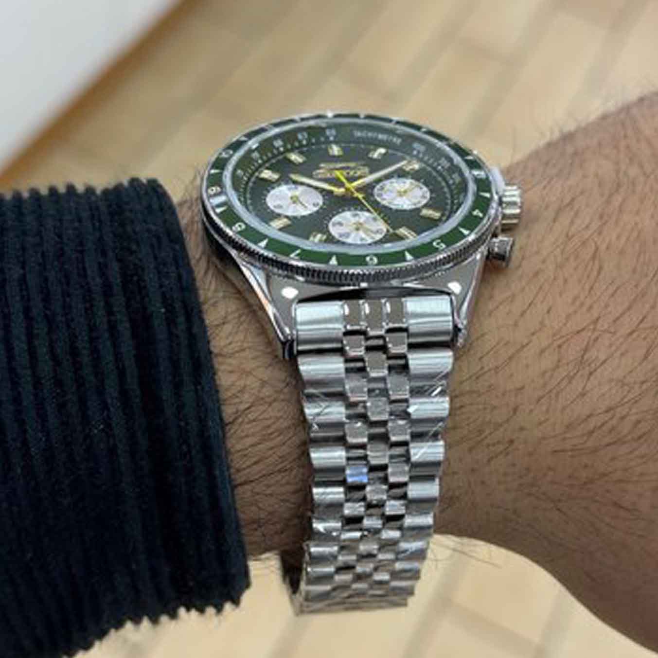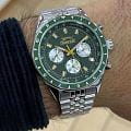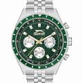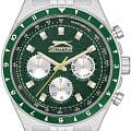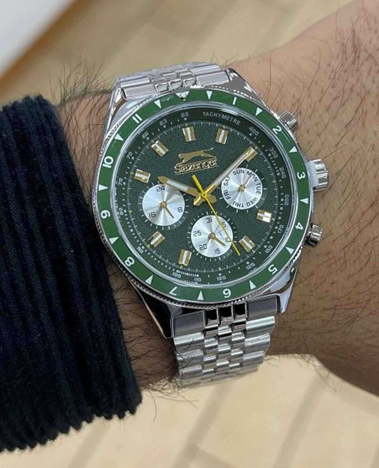 Часы Slazenger SL.09.2248.2.06 — это современная модель с выразительным спортивным характером, идеально подходящая для активного образа жизни. Корпус выполнен из прочного металла, зеленый циферблат защищён минеральным стекломМинеральное стеклоМинеральное стекло представляет собой искусственно выращенный минерал кварца. Такое стекло отличается особой устойчивостью к повреждениям и царапинам. Уступает по некоторым качествам сапфировому стеклу., устойчивым к царапинам. Часы также оснащены шкалой тахиметраТахиметрРазмеченная шкала, располагается на ободке или безеле часов. Тахиметр позволяет рассчитать скорость на определённом участке пути, расстояние измеряется в километрах или милях., что добавляет им функциональности и может быть полезно для измерения скорости.  На безельБезельВнешний ободок, закрепляющий стекло. В спортивных часах так называется поворотное кольцо с делениями на циферблате, выполняет роль таймера – замеряет отрезки времени на шкале. Неподвижный безель – элемент декора. Однонаправленно вращающийся безель на дайверских часах позволяет фиксировать моменты погружения и выныривания на поверхность. нанесено зеленое IP-покрытиеIP-покрытиеМетод ионного напыления. Демонстрирует повышенную устойчивость к истиранию, окислению и химическим веществам. Под воздействием высокого давления и температуры около 1500°C молекулы металла надёжно соединяются с частицами корпуса часов..  Диаметр корпуса составляет 46 мм, толщина — 11 мм, а ширина браслета — 22 мм.  Часы оснащены металлическим браслетом с надежной раскладной застёжкойРаскладная застёжкаТакой тип застёжки используется только на браслетах из металла. Она никогда не раскрывается полностью, происходит разделение на 2 и более частей. Раскладывающая застёжка снизит вероятность потери часов к минимуму., благодаря чему часы удобно сидят на руке и не вызывают дискомфорта даже при длительном ношении. Вес модели составляет 130 грамм. Надёжный кварцевый механизм обеспечивает точность времени, а уровень водозащиты WR 50 позволяет использовать часы в повседневных условиях, не опасаясь случайных брызг или дождя. Для удобства использования в темное время суток предусмотрено люминесцентное покрытиеЛюминесцентное покрытиеПозволяет считывать показания времени в темноте. Производители наносят на стрелки, часовые индексы, безель или поверхность циферблата светонакопительный состав, дающий холодное свечение. стрелок и меток. Дополнительные малые циферблаты показывают дату, день недели и текущее время в 24-часовом формате, что делает использование часов ещё более удобным и функциональным.