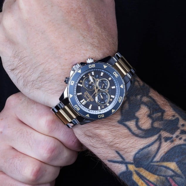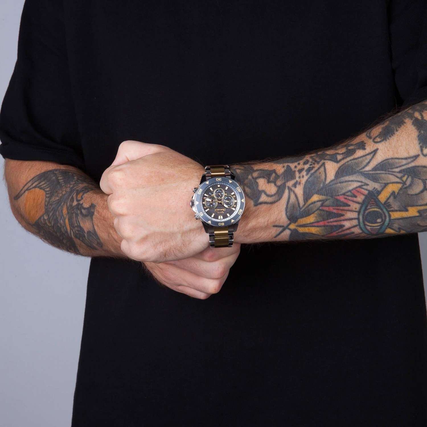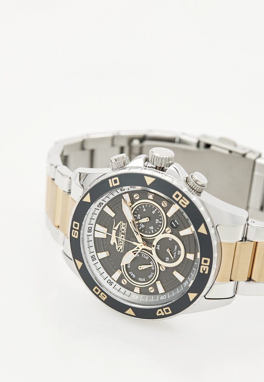 Часы Slazenger SL.09.2250.2.05 — это стильная и практичная модель, выполненная в элегантном серебристом цвете. Корпус изготовлен из металла, а на металлический браслет нанесено частичное золотистое IP-покрытиеIP-покрытиеМетод ионного напыления. Демонстрирует повышенную устойчивость к истиранию, окислению и химическим веществам. Под воздействием высокого давления и температуры около 1500°C молекулы металла надёжно соединяются с частицами корпуса часов., что обеспечивает прочность и долговечность. На безельБезельВнешний ободок, закрепляющий стекло. В спортивных часах так называется поворотное кольцо с делениями на циферблате, выполняет роль таймера – замеряет отрезки времени на шкале. Неподвижный безель – элемент декора. Однонаправленно вращающийся безель на дайверских часах позволяет фиксировать моменты погружения и выныривания на поверхность. нанесено черное IP-покрытиеIP-покрытиеМетод ионного напыления. Демонстрирует повышенную устойчивость к истиранию, окислению и химическим веществам. Под воздействием высокого давления и температуры около 1500°C молекулы металла надёжно соединяются с частицами корпуса часов.. Минеральное стеклоМинеральное стеклоМинеральное стекло представляет собой искусственно выращенный минерал кварца. Такое стекло отличается особой устойчивостью к повреждениям и царапинам. Уступает по некоторым качествам сапфировому стеклу. надежно защищает синий циферблат от царапин и повреждений. Диаметр корпуса составляет 44 мм, а толщина — 11 мм, благодаря чему часы смотрятся солидно и современно. Модель оснащена кварцевым механизмом, отличающимся точностью и надежностью. На циферблате представлены дополнительные малые циферблаты для отображения второго часового поясаВторой часовой поясФункция, позволяющая отображать время двух часовых поясов одновременно., дня недели и времени в 24-часовом формате, а также имеется отдельное окошко даты. Для удобства использования в темное время суток предусмотрено люминесцентное покрытиеЛюминесцентное покрытиеПозволяет считывать показания времени в темноте. Производители наносят на стрелки, часовые индексы, безель или поверхность циферблата светонакопительный состав, дающий холодное свечение. стрелок и меток. Удобный металлический браслет шириной 22 мм снабжен раскладной застёжкойРаскладная застёжкаТакой тип застёжки используется только на браслетах из металла. Она никогда не раскрывается полностью, происходит разделение на 2 и более частей. Раскладывающая застёжка снизит вероятность потери часов к минимуму., обеспечивающей надежную фиксацию на запястье. Заводная головка оснащена защитой. Водозащита уровня WR 50 позволяет не снимать часы при мытье рук или попадании под дождь. Вес модели составляет 152 грамм.