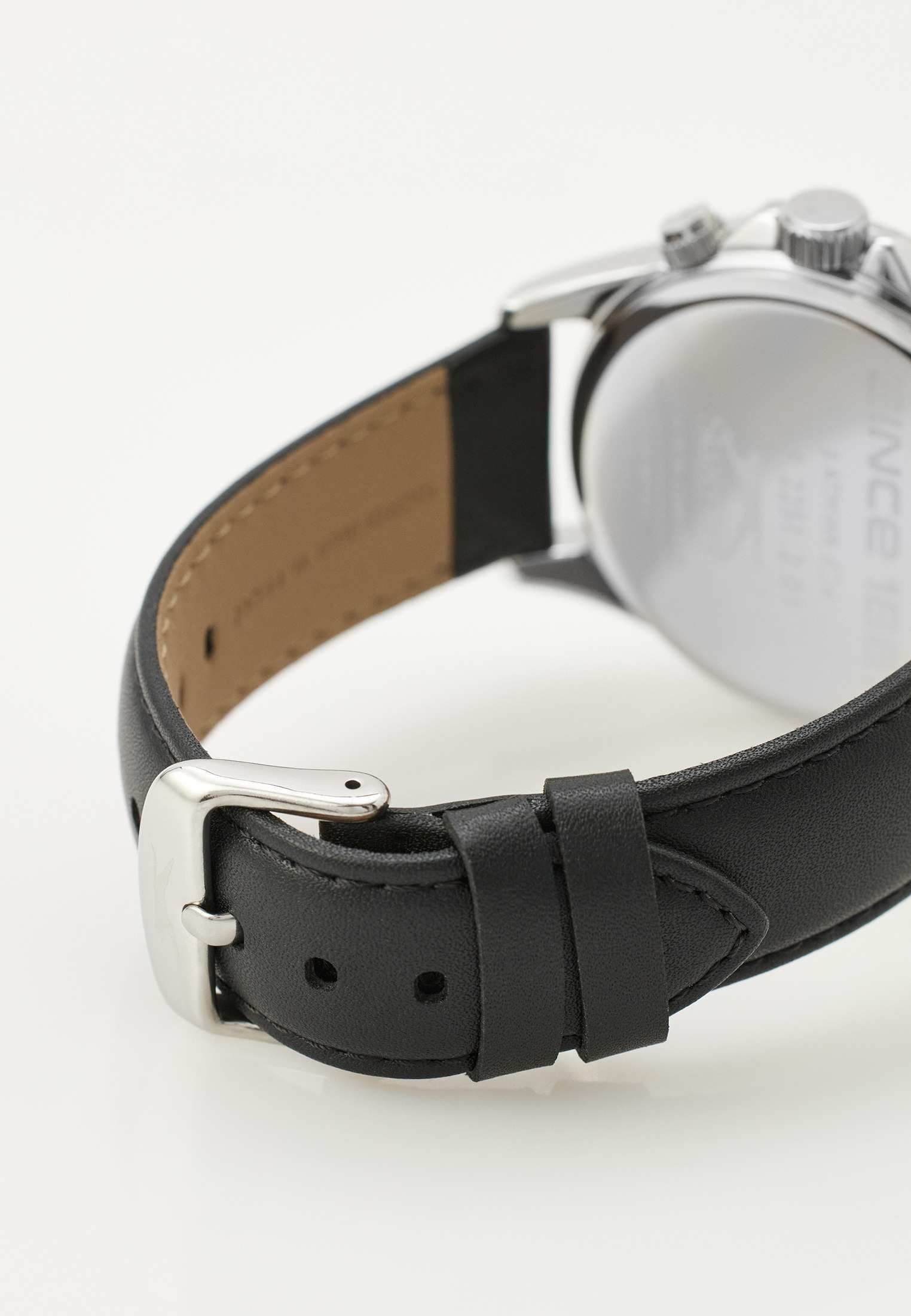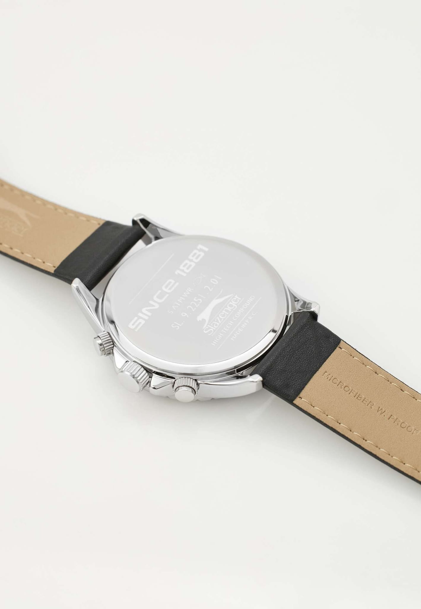 Часы Slazenger SL.09.2251.2.01 — это стильная и практичная модель, выполненная в элегантном серебристом цвете. Корпус изготовлен из металла, что обеспечивает прочность и долговечность. На безельБезельВнешний ободок, закрепляющий стекло. В спортивных часах так называется поворотное кольцо с делениями на циферблате, выполняет роль таймера – замеряет отрезки времени на шкале. Неподвижный безель – элемент декора. Однонаправленно вращающийся безель на дайверских часах позволяет фиксировать моменты погружения и выныривания на поверхность. нанесено черное IP-покрытиеIP-покрытиеМетод ионного напыления. Демонстрирует повышенную устойчивость к истиранию, окислению и химическим веществам. Под воздействием высокого давления и температуры около 1500°C молекулы металла надёжно соединяются с частицами корпуса часов.. Минеральное стеклоМинеральное стеклоМинеральное стекло представляет собой искусственно выращенный минерал кварца. Такое стекло отличается особой устойчивостью к повреждениям и царапинам. Уступает по некоторым качествам сапфировому стеклу. надежно защищает черный циферблат от царапин и повреждений. Классический кожаный ремешок черного цвета шириной 22 мм удобно фиксируется на запястье с помощью классической застежки. Диаметр корпуса составляет 44 мм, а толщина — 12 мм, благодаря чему часы смотрятся солидно и современно. Модель оснащена кварцевым механизмом, отличающимся точностью и надежностью. На циферблате представлены дополнительные малые циферблаты для отображения второго часового поясаВторой часовой поясФункция, позволяющая отображать время двух часовых поясов одновременно., дня недели и времени в 24-часовом формате, а также имеется отдельное окошко даты. Для удобства использования в темное время суток предусмотрено люминесцентное покрытиеЛюминесцентное покрытиеПозволяет считывать показания времени в темноте. Производители наносят на стрелки, часовые индексы, безель или поверхность циферблата светонакопительный состав, дающий холодное свечение. стрелок и меток. Заводная головка оснащена защитой. Водозащита уровня WR 50 позволяет не снимать часы при мытье рук или попадании под дождь. Вес модели составляет 70 грамм.