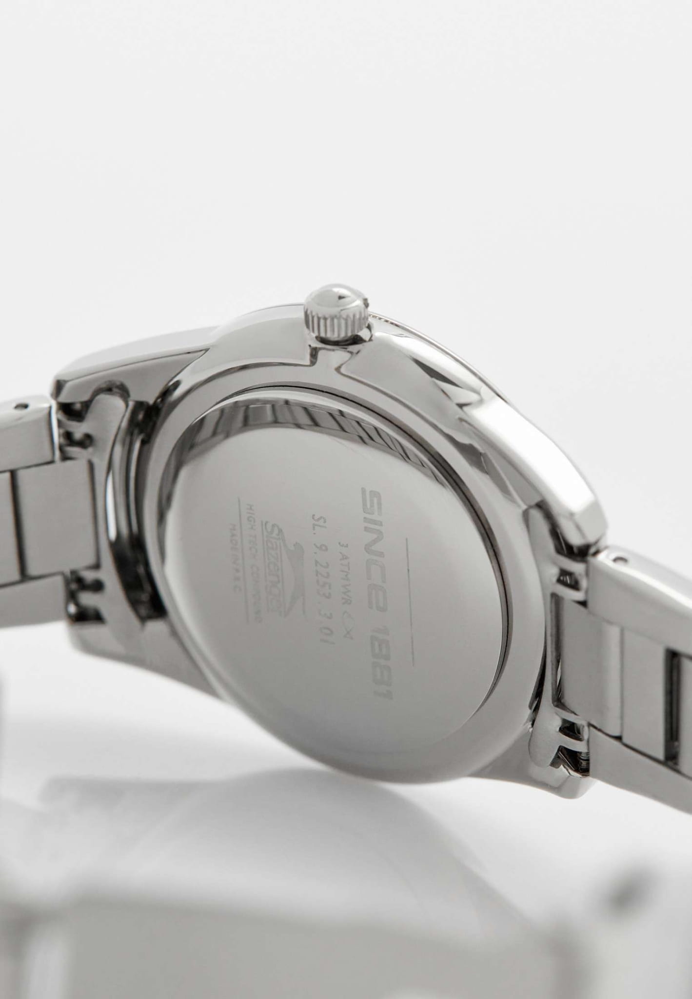 Часы Slazenger SL.09.2253.3.01 — это стильная и элегантная модель, созданная для тех, кто ценит утонченность и надежность. Корпус выполнен из прочного металла, а изящный серебристый браслет оснащён удобной раскладной застёжкойРаскладная застёжкаТакой тип застёжки используется только на браслетах из металла. Она никогда не раскрывается полностью, происходит разделение на 2 и более частей. Раскладывающая застёжка снизит вероятность потери часов к минимуму.. Минеральное стеклоМинеральное стеклоМинеральное стекло представляет собой искусственно выращенный минерал кварца. Такое стекло отличается особой устойчивостью к повреждениям и царапинам. Уступает по некоторым качествам сапфировому стеклу. защищает бордовый циферблат, украшенный сияющими кристаллами, придающими аксессуару особый шарм. Кварцевый механизм обеспечивает точность хода, а водозащита класса WR 30 позволяет не беспокоиться о случайных брызгах. Диаметр корпуса составляет 33 мм, ширина браслета — 16 мм, толщина корпуса — 8 мм, что делает эти часы аккуратными и комфортными для повседневной носки. Модель весит 70 грамм. Часы прекрасно дополнят как деловой, так и повседневный образ, подчеркивая индивидуальность своей обладательницы.