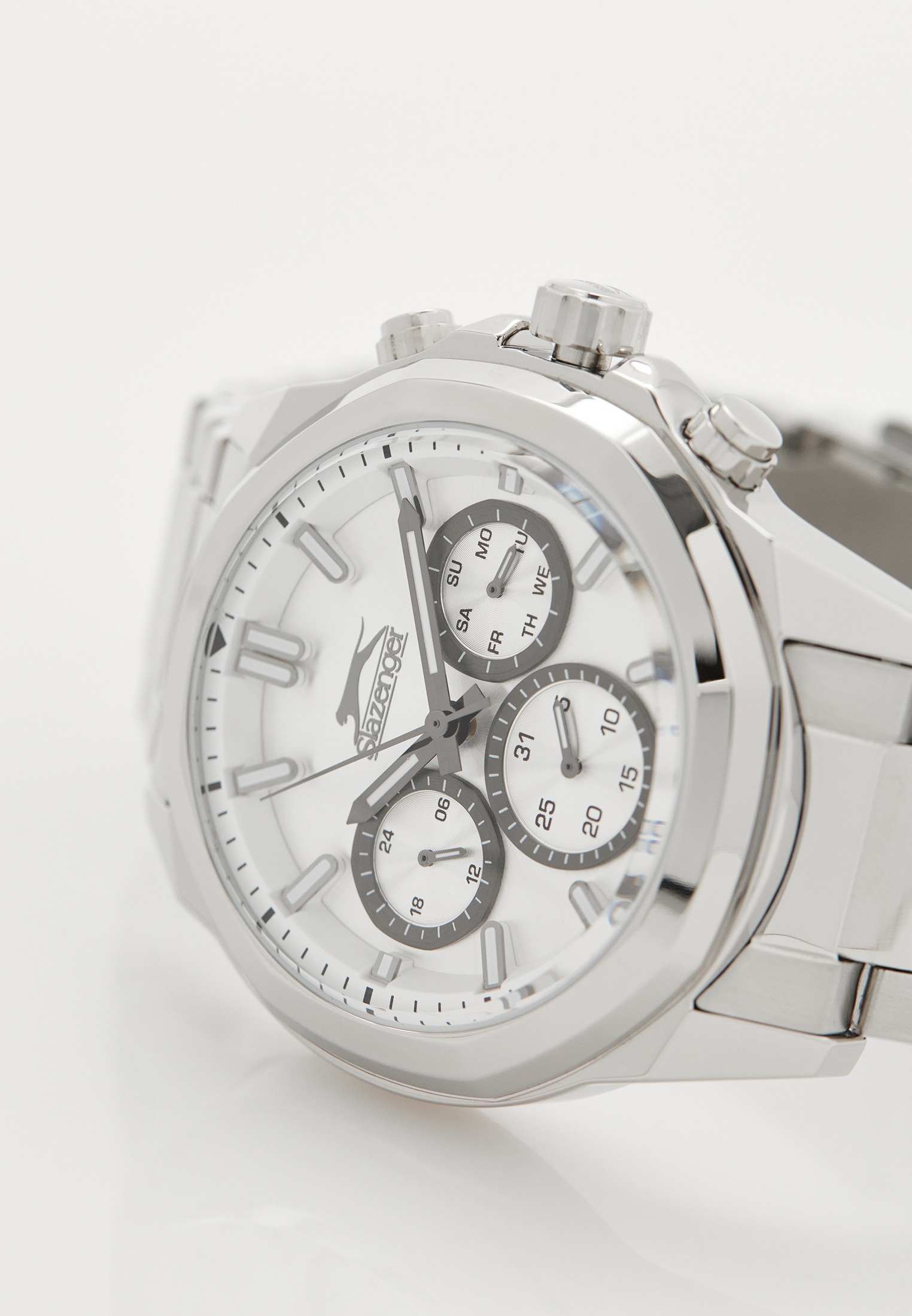 Часы Slazenger SL.09.2289.2.04 — это сочетание современного дизайна и функциональности, идеально подходящее для тех, кто ценит стиль и надежность. Корпус и браслет выполнены из прочного суперметалла, что придаёт модели солидный и эффектный вид. Серебристый циферблат с лаконичными отметками и фирменным логотипом защищён устойчивым к царапинам минеральным стекломМинеральное стеклоМинеральное стекло представляет собой искусственно выращенный минерал кварца. Такое стекло отличается особой устойчивостью к повреждениям и царапинам. Уступает по некоторым качествам сапфировому стеклу.. Дополнительные функции включают отображение даты и дня недели, а также 12- и 24-часовой формат времени на отдельных мини-циферблатах, что делает использование часов максимально удобным. Заводная головка оснащена защитой, а надёжная раскладная застёжкаРаскладная застёжкаТакой тип застёжки используется только на браслетах из металла. Она никогда не раскрывается полностью, происходит разделение на 2 и более частей. Раскладывающая застёжка снизит вероятность потери часов к минимуму. обеспечивает комфортную посадку на запястье. Особое внимание привлекает восьмигранный безельБезельВнешний ободок, закрепляющий стекло. В спортивных часах так называется поворотное кольцо с делениями на циферблате, выполняет роль таймера – замеряет отрезки времени на шкале. Неподвижный безель – элемент декора. Однонаправленно вращающийся безель на дайверских часах позволяет фиксировать моменты погружения и выныривания на поверхность.. Циферблат оснащён люминесцентным покрытиемЛюминесцентное покрытиеПозволяет считывать показания времени в темноте. Производители наносят на стрелки, часовые индексы, безель или поверхность циферблата светонакопительный состав, дающий холодное свечение. стрелок и меток, что позволяет легко определять время даже в условиях плохой освещенности. Водозащита 50WR позволяет не беспокоиться о случайных брызгах и дождевых каплях. Диаметр корпуса составляет 46 мм, толщина — 14 мм, вес — 165 г, благодаря чему часы выглядят внушительно и подчёркивают индивидуальный стиль владельца. Эта модель станет отличным акцентом в вашем образе и подчеркнёт вашу уверенность в любой ситуации.