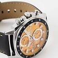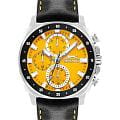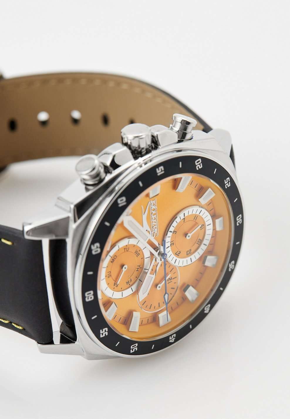 Slazenger SL.09.2293.2.05 — это стильные наручные часы, выполненные в современном дизайне и отлично подходящие для повседневного использования. Корпус диаметром 45 мм изготовлен из прочного металла и дополнен минеральным стекломМинеральное стеклоМинеральное стекло представляет собой искусственно выращенный минерал кварца. Такое стекло отличается особой устойчивостью к повреждениям и царапинам. Уступает по некоторым качествам сапфировому стеклу., которое защищает желтый циферблат. Черный кожаный ремешок шириной 24 мм оснащён надежной классической застежкой, которая обеспечивает комфортную посадку на руке. Кварцевый механизм гарантирует точный ход, а водозащита уровня WR 50 позволяет не снимать часы во время мытья рук или под дождём. Модель оснащена люминесцентным покрытиемЛюминесцентное покрытиеПозволяет считывать показания времени в темноте. Производители наносят на стрелки, часовые индексы, безель или поверхность циферблата светонакопительный состав, дающий холодное свечение. стрелок и меток, что облегчает считывание времени в темноте. Дополнительные малые циферблаты отображают дату, день недели и текущее время в 24-часовом формате. Часы также оснащены заводной головкой с защитой и безелемБезельВнешний ободок, закрепляющий стекло. В спортивных часах так называется поворотное кольцо с делениями на циферблате, выполняет роль таймера – замеряет отрезки времени на шкале. Неподвижный безель – элемент декора. Однонаправленно вращающийся безель на дайверских часах позволяет фиксировать моменты погружения и выныривания на поверхность. с черным IP-покрытиемIP-покрытиеМетод ионного напыления. Демонстрирует повышенную устойчивость к истиранию, окислению и химическим веществам. Под воздействием высокого давления и температуры около 1500°C молекулы металла надёжно соединяются с частицами корпуса часов. и секундной разметкой. Вес изделия составляет 80 грамм.