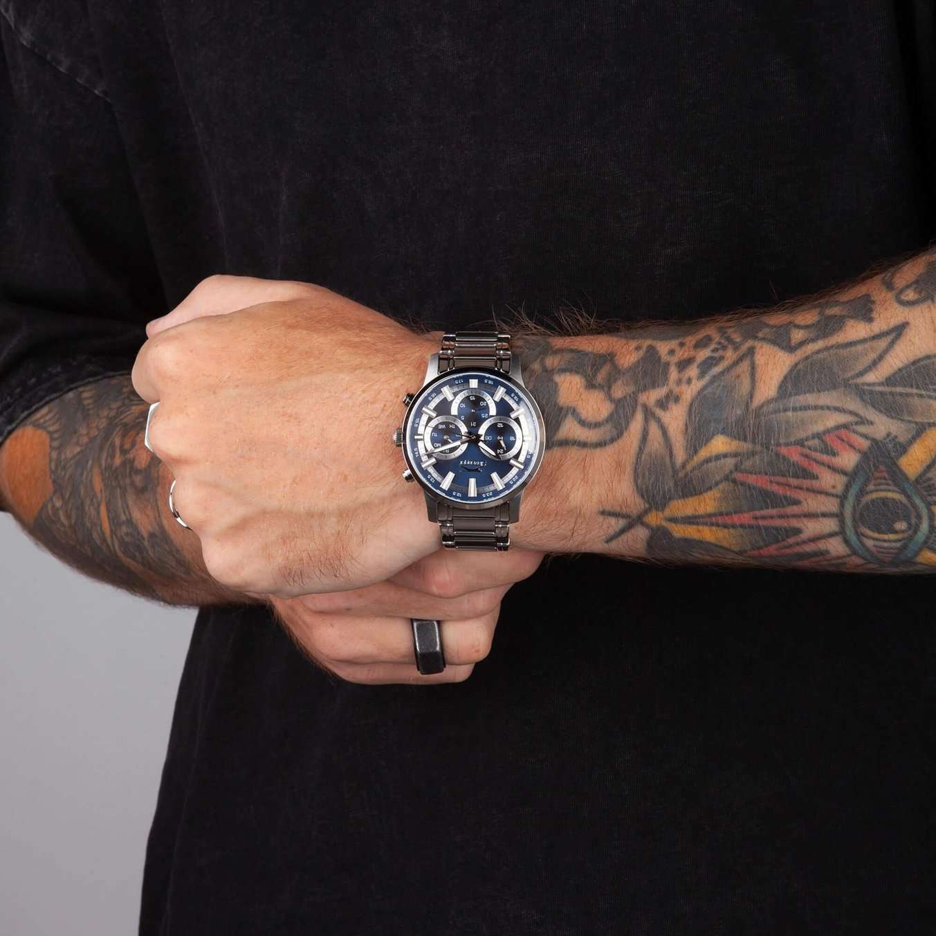 Мужские наручные часы Slazenger SL.09.2294.2.05 сочетают стильный современный дизайн и высокую функциональность. Корпус из прочного металла диаметром 44 мм и толщиной 13 мм защищён минеральным стекломМинеральное стеклоМинеральное стекло представляет собой искусственно выращенный минерал кварца. Такое стекло отличается особой устойчивостью к повреждениям и царапинам. Уступает по некоторым качествам сапфировому стеклу., устойчивым к царапинам. Серебристый металлический браслет шириной 22 мм оснащён надёжной раскладной застёжкойРаскладная застёжкаТакой тип застёжки используется только на браслетах из металла. Она никогда не раскрывается полностью, происходит разделение на 2 и более частей. Раскладывающая застёжка снизит вероятность потери часов к минимуму., обеспечивающей комфортное ношение. Кварцевый механизм гарантирует точность хода, а водозащита уровня WR 50 позволяет не снимать часы при мытье рук или во время дождя. Модель оснащена люминесцентным покрытиемЛюминесцентное покрытиеПозволяет считывать показания времени в темноте. Производители наносят на стрелки, часовые индексы, безель или поверхность циферблата светонакопительный состав, дающий холодное свечение. стрелок и меток, что облегчает считывание времени в темноте. На малых циферблатах отображаются дата, день недели и текущее время в 24-часовом формате, что делает модель особенно удобной для повседневного использования. Циферблат часов изысканного синего цвета. Заводная головка с защитой и завинчивающаяся задняя крышка обеспечивают дополнительную надежность конструкции. Вес часов составляет 123 грамма.
