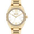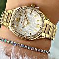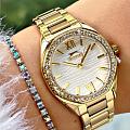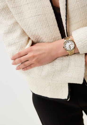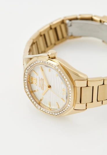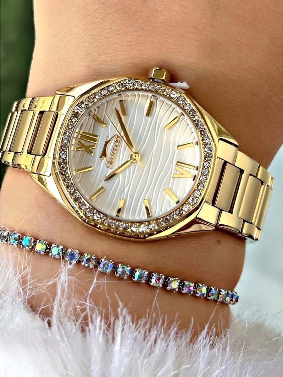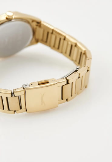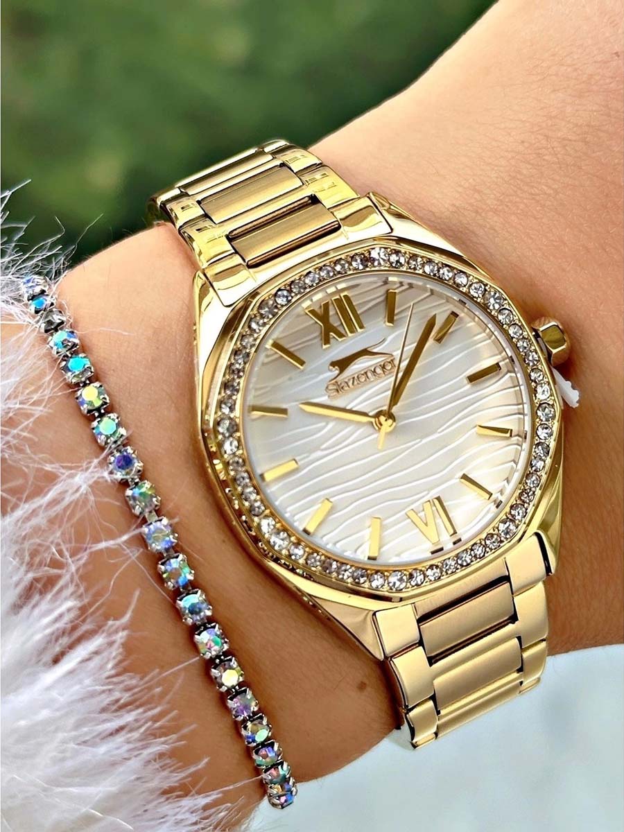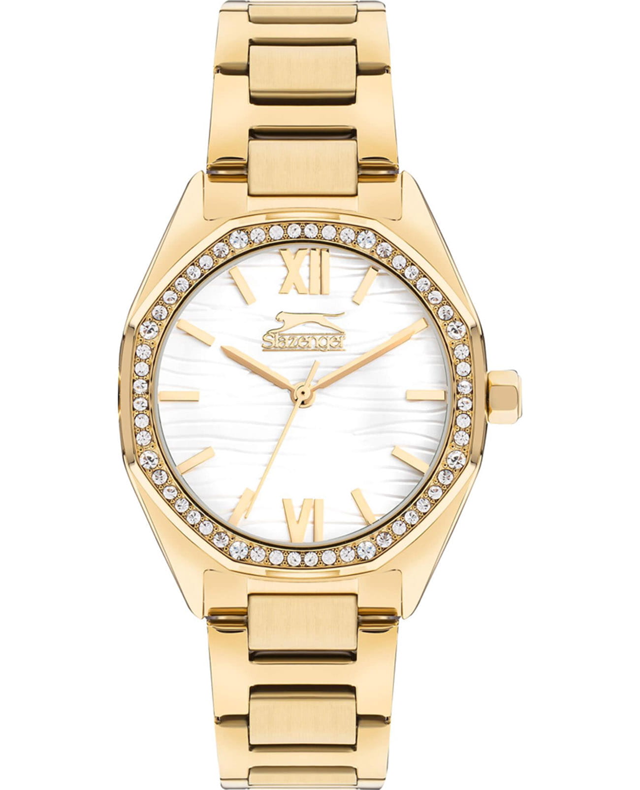 Женские кварцевые часы Slazenger SL.09.2301.3.08 — это элегантный и изысканный аксессуар, подчеркивающий стиль и утончённость. Корпус и браслет выполнены из суперметалла с IP-покрытиемIP-покрытиеМетод ионного напыления. Демонстрирует повышенную устойчивость к истиранию, окислению и химическим веществам. Под воздействием высокого давления и температуры около 1500°C молекулы металла надёжно соединяются с частицами корпуса часов., защищён минеральным стекломМинеральное стеклоМинеральное стекло представляет собой искусственно выращенный минерал кварца. Такое стекло отличается особой устойчивостью к повреждениям и царапинам. Уступает по некоторым качествам сапфировому стеклу.. Циферблат белого цвета с волнистым рельефным рисунком оформлен штриховыми метками и римскими цифрами VI и XII, дополнен логотипом бренда. Безель гранёный, украшен паве из фианитов, придающих модели изысканное сияние. Заводная головка — граненая, добавляющая детали дизайна. Браслет из суперметалла фиксируется на раскладной застёжкеРаскладная застёжкаТакой тип застёжки используется только на браслетах из металла. Она никогда не раскрывается полностью, происходит разделение на 2 и более частей. Раскладывающая застёжка снизит вероятность потери часов к минимуму., обеспечивая надёжность и комфорт ношения. Водонепроницаемость 30 м позволяет использовать часы в повседневных условиях, защищая от случайных брызг и капель дождя. Модель идеально подходит как для повседневного, так и для торжественного образа.