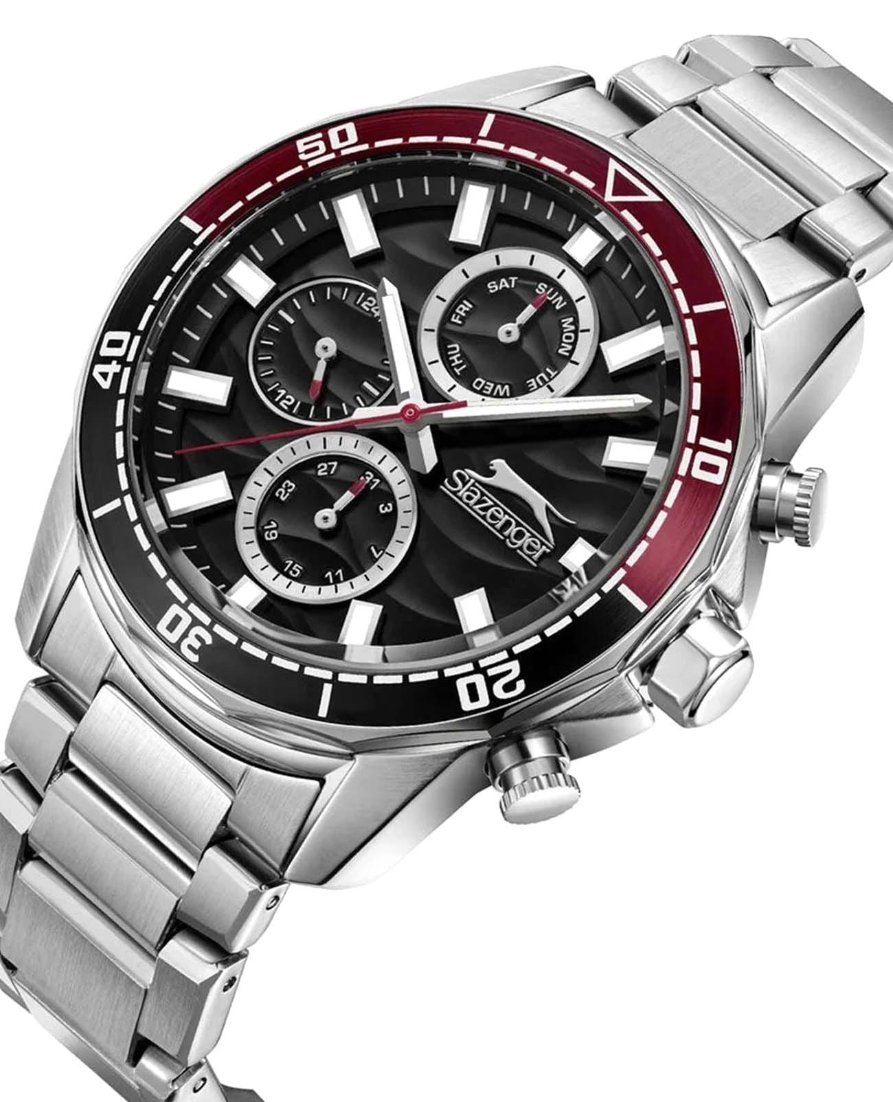 Мужские кварцевые часы Slazenger — это выразительный и функциональный аксессуар. Корпус диаметром 41,5 мм и толщиной 13 мм выполнен из суперметалла. Циферблат чёрного цвета оформлен индексами и стрелками. Циферблат защищён минеральным стекломМинеральное стеклоМинеральное стекло представляет собой искусственно выращенный минерал кварца. Такое стекло отличается особой устойчивостью к повреждениям и царапинам. Уступает по некоторым качествам сапфировому стеклу.. Механизм — кварцевый. Часы оснащены индикацией дня недели, даты и 12/24-часового формата времени. Стрелки и метки с люминесцентным покрытиемЛюминесцентное покрытиеПозволяет считывать показания времени в темноте. Производители наносят на стрелки, часовые индексы, безель или поверхность циферблата светонакопительный состав, дающий холодное свечение., обеспечивающим хорошую читаемость в темноте. Часы оснащены браслетом из суперметалла с раскладной застёжкойРаскладная застёжкаТакой тип застёжки используется только на браслетах из металла. Она никогда не раскрывается полностью, происходит разделение на 2 и более частей. Раскладывающая застёжка снизит вероятность потери часов к минимуму.. Водонепроницаемость 100 м позволяет использовать часы для плавания и повседневного ношения. Гарантия — 12 месяцев. Идеальный выбор для тех, кто ценит стиль, функциональность и качество.