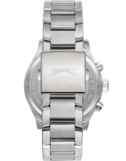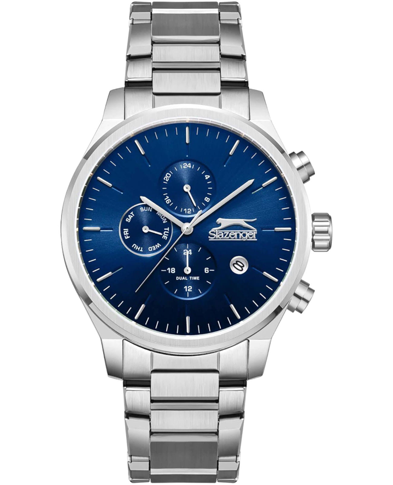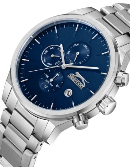 Мужские кварцевые часы Slazenger — это выразительный и функциональный аксессуар. Корпус диаметром 44 мм и толщиной 11 мм выполнен из нержавеющей стали 316L. Циферблат синего цвета оформлен индексами и стрелками. Циферблат защищён минеральным стекломМинеральное стеклоМинеральное стекло представляет собой искусственно выращенный минерал кварца. Такое стекло отличается особой устойчивостью к повреждениям и царапинам. Уступает по некоторым качествам сапфировому стеклу.. Механизм — кварцевый. Часы оснащены индикацией дня недели, даты, 12/24-часового формата времени и функцией второго часового пояса (GMT)Второй часовой поясФункция, позволяющая отображать время двух часовых поясов одновременно.. Окошко даты расположено между 4 и 5 часами. Часы оснащены стальным браслетом с раскладной застёжкойРаскладная застёжкаТакой тип застёжки используется только на браслетах из металла. Она никогда не раскрывается полностью, происходит разделение на 2 и более частей. Раскладывающая застёжка снизит вероятность потери часов к минимуму.. Водонепроницаемость 100 м позволяет использовать часы для плавания и повседневного ношения. Гарантия — 12 месяцев. Идеальный выбор для тех, кто ценит стиль, функциональность и качество.