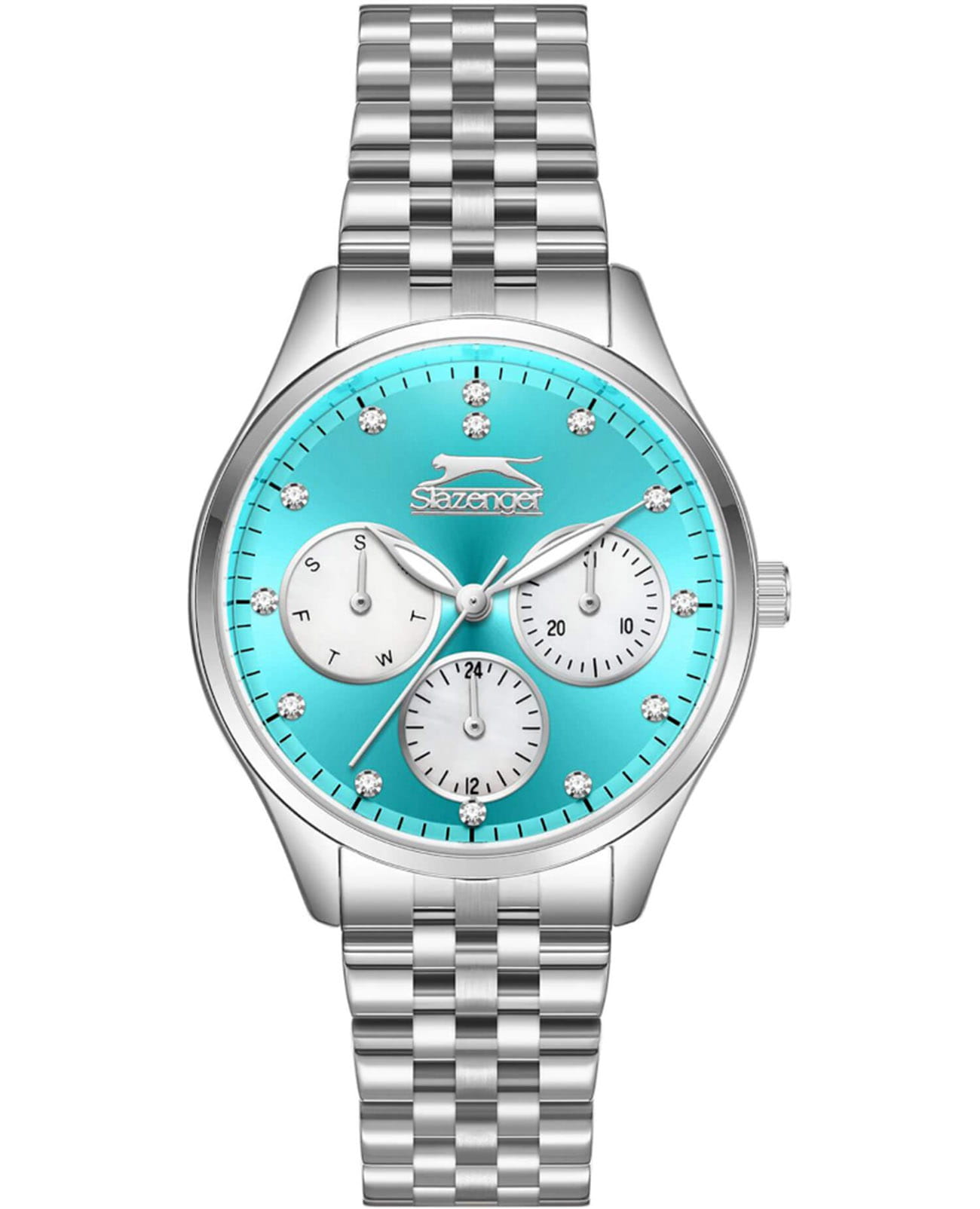 Женские кварцевые часы Slazenger — это элегантный и функциональный аксессуар. Корпус диаметром 34 мм и толщиной 11 мм выполнен из суперметалла. Циферблат голубого цвета оформлен индексами и стрелками, украшен фианитами. Циферблат защищён минеральным стекломМинеральное стеклоМинеральное стекло представляет собой искусственно выращенный минерал кварца. Такое стекло отличается особой устойчивостью к повреждениям и царапинам. Уступает по некоторым качествам сапфировому стеклу.. Механизм — кварцевый. Часы оснащены индикацией дня недели, даты и 12/24-часового формата времени. Часы оснащены браслетом из суперметалла с раскладной застёжкойРаскладная застёжкаТакой тип застёжки используется только на браслетах из металла. Она никогда не раскрывается полностью, происходит разделение на 2 и более частей. Раскладывающая застёжка снизит вероятность потери часов к минимуму.. Водонепроницаемость 50 м позволяет использовать часы в повседневных условиях. Гарантия — 12 месяцев. Идеальный выбор для тех, кто ценит стиль, функциональность и качество.