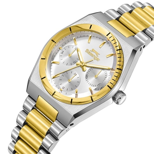 Женские кварцевые часы Slazenger — это элегантный и функциональный аксессуар. Корпус диаметром 33 мм и толщиной 10,5 мм выполнен из суперметалла. БезельБезельВнешний ободок, закрепляющий стекло. В спортивных часах так называется поворотное кольцо с делениями на циферблате, выполняет роль таймера – замеряет отрезки времени на шкале. Неподвижный безель – элемент декора. Однонаправленно вращающийся безель на дайверских часах позволяет фиксировать моменты погружения и выныривания на поверхность. с IP-покрытиемIP-покрытиеМетод ионного напыления. Демонстрирует повышенную устойчивость к истиранию, окислению и химическим веществам. Под воздействием высокого давления и температуры около 1500°C молекулы металла надёжно соединяются с частицами корпуса часов.. Циферблат серебристого цвета оформлен индексами и стрелками. Циферблат защищён минеральным стекломМинеральное стеклоМинеральное стекло представляет собой искусственно выращенный минерал кварца. Такое стекло отличается особой устойчивостью к повреждениям и царапинам. Уступает по некоторым качествам сапфировому стеклу.. Механизм — кварцевый. Часы оснащены индикацией дня недели, даты и 12/24-часового формата времени. Стрелки с люминесцентным покрытиемЛюминесцентное покрытиеПозволяет считывать показания времени в темноте. Производители наносят на стрелки, часовые индексы, безель или поверхность циферблата светонакопительный состав, дающий холодное свечение., обеспечивающим хорошую читаемость в темноте. Часы оснащены браслетом из суперметалла с IP-покрытиемIP-покрытиеМетод ионного напыления. Демонстрирует повышенную устойчивость к истиранию, окислению и химическим веществам. Под воздействием высокого давления и температуры около 1500°C молекулы металла надёжно соединяются с частицами корпуса часов. и раскладной застёжкойРаскладная застёжкаТакой тип застёжки используется только на браслетах из металла. Она никогда не раскрывается полностью, происходит разделение на 2 и более частей. Раскладывающая застёжка снизит вероятность потери часов к минимуму.. Водонепроницаемость 50 м позволяет использовать часы в повседневных условиях. Гарантия — 12 месяцев. Идеальный выбор для тех, кто ценит стиль, функциональность и качество.