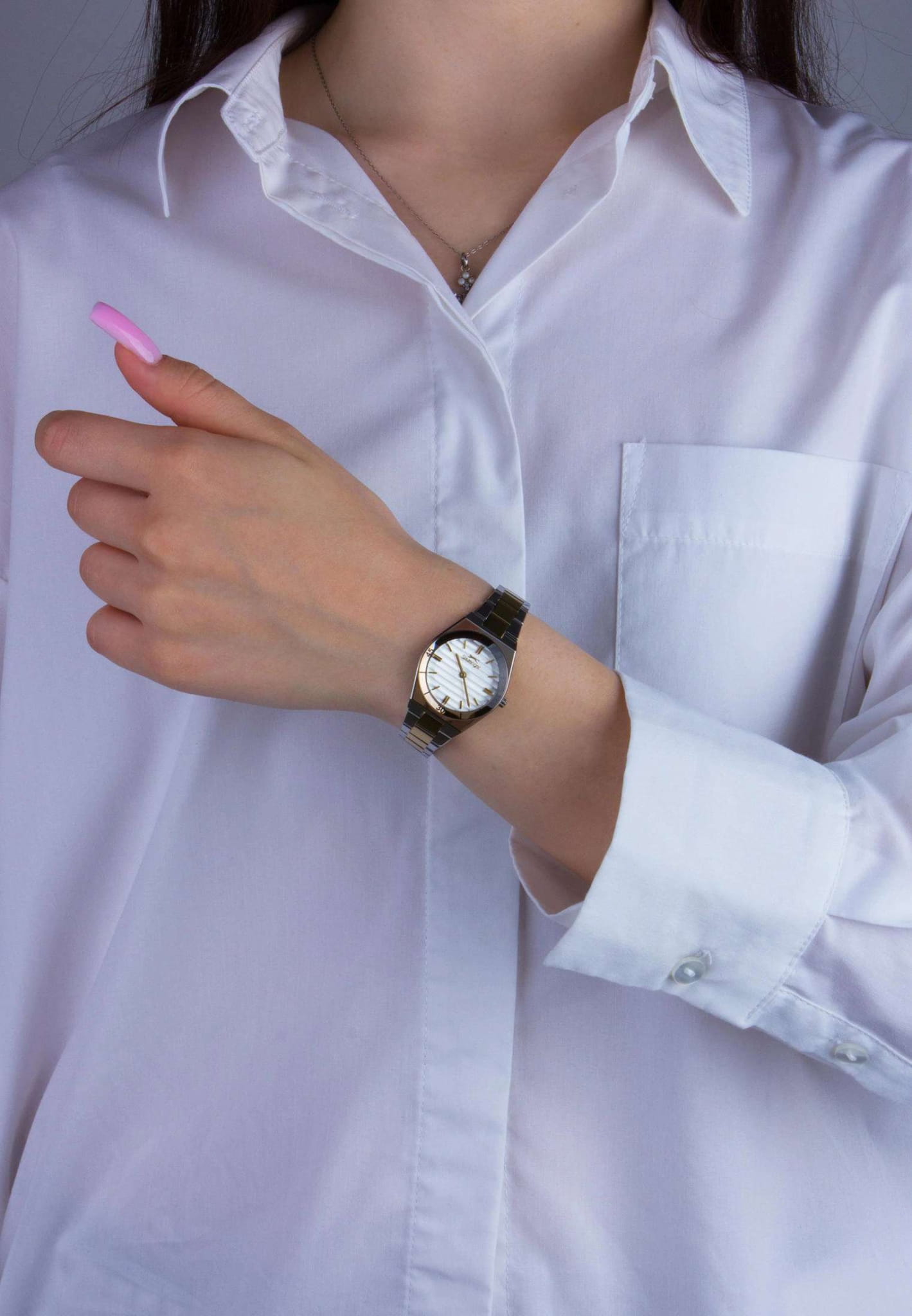 Женские кварцевые часы Slazenger — это элегантный аксессуар. Корпус диаметром 28 мм и толщиной 7,5 мм выполнен из суперметалла. БезельБезельВнешний ободок, закрепляющий стекло. В спортивных часах так называется поворотное кольцо с делениями на циферблате, выполняет роль таймера – замеряет отрезки времени на шкале. Неподвижный безель – элемент декора. Однонаправленно вращающийся безель на дайверских часах позволяет фиксировать моменты погружения и выныривания на поверхность. из суперметалла с IP-покрытиемIP-покрытиеМетод ионного напыления. Демонстрирует повышенную устойчивость к истиранию, окислению и химическим веществам. Под воздействием высокого давления и температуры около 1500°C молекулы металла надёжно соединяются с частицами корпуса часов.. Циферблат серебристого цвета оформлен индексами и стрелками. Циферблат защищён минеральным стекломМинеральное стеклоМинеральное стекло представляет собой искусственно выращенный минерал кварца. Такое стекло отличается особой устойчивостью к повреждениям и царапинам. Уступает по некоторым качествам сапфировому стеклу.. Механизм — кварцевый. Часы оснащены браслетом из суперметалла с IP-покрытиемIP-покрытиеМетод ионного напыления. Демонстрирует повышенную устойчивость к истиранию, окислению и химическим веществам. Под воздействием высокого давления и температуры около 1500°C молекулы металла надёжно соединяются с частицами корпуса часов. на раскладной застёжкеРаскладная застёжкаТакой тип застёжки используется только на браслетах из металла. Она никогда не раскрывается полностью, происходит разделение на 2 и более частей. Раскладывающая застёжка снизит вероятность потери часов к минимуму.. Водонепроницаемость 50 м позволяет использовать часы в повседневных условиях. Гарантия — 12 месяцев. Идеальный выбор для тех, кто ценит стиль и качество.