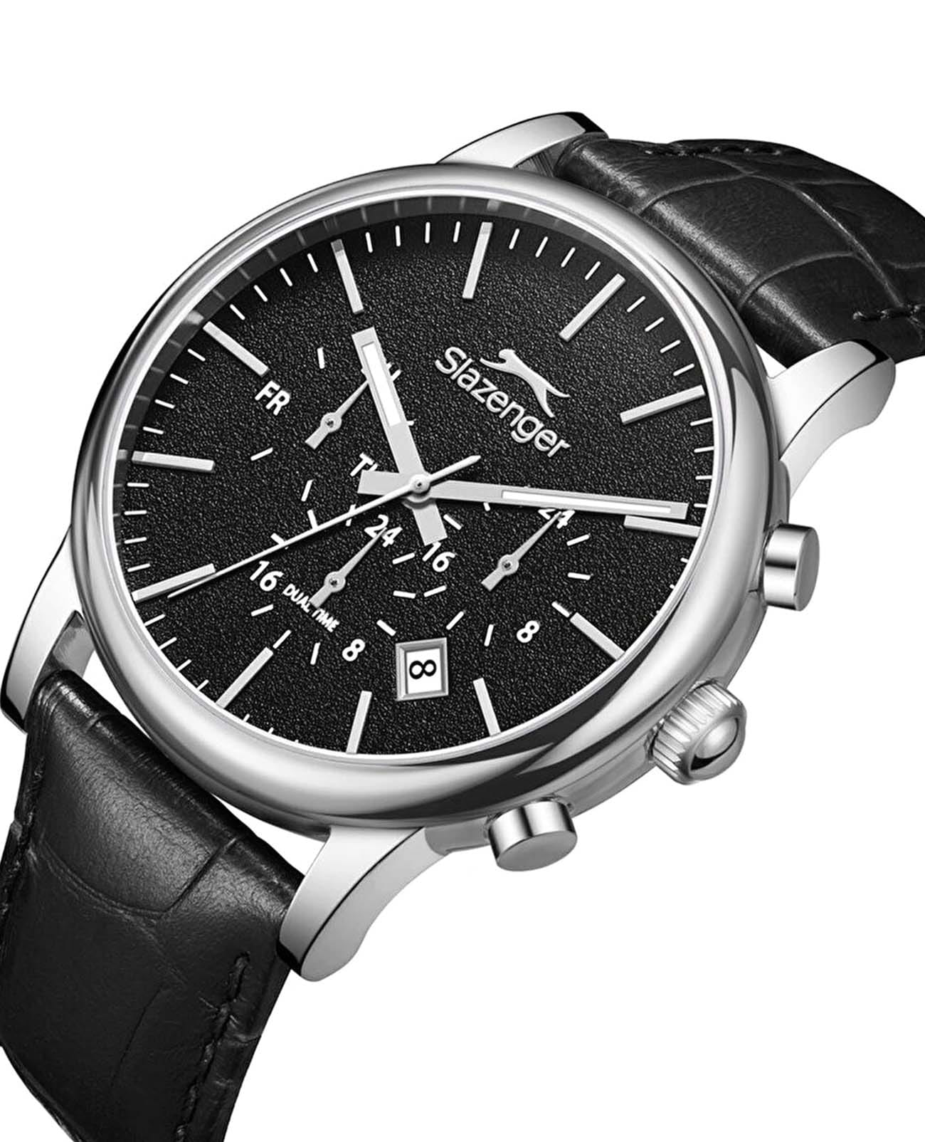 Мужские кварцевые часы Slazenger — это выразительный и функциональный аксессуар. Корпус диаметром 43 мм и толщиной 12 мм выполнен из нержавеющей стали 316L. Циферблат чёрного цвета оформлен индексами и стрелками. Циферблат защищён минеральным стекломМинеральное стеклоМинеральное стекло представляет собой искусственно выращенный минерал кварца. Такое стекло отличается особой устойчивостью к повреждениям и царапинам. Уступает по некоторым качествам сапфировому стеклу.. Стрелки с люминесцентным покрытиемЛюминесцентное покрытиеПозволяет считывать показания времени в темноте. Производители наносят на стрелки, часовые индексы, безель или поверхность циферблата светонакопительный состав, дающий холодное свечение., обеспечивающим хорошую читаемость в темноте. Механизм — кварцевый. Часы оснащены индикацией дня недели, даты, 12/24-часового формата времени и функцией второго часового пояса (GMT)Второй часовой поясФункция, позволяющая отображать время двух часовых поясов одновременно.. Окошко даты расположено между 4 и 5 часами. Часы оснащены кожаным ремешком с стандартной застёжкой. Водонепроницаемость 100 м позволяет использовать часы для плавания и повседневного ношения. Гарантия — 12 месяцев. Идеальный выбор для тех, кто ценит стиль, функциональность и качество.