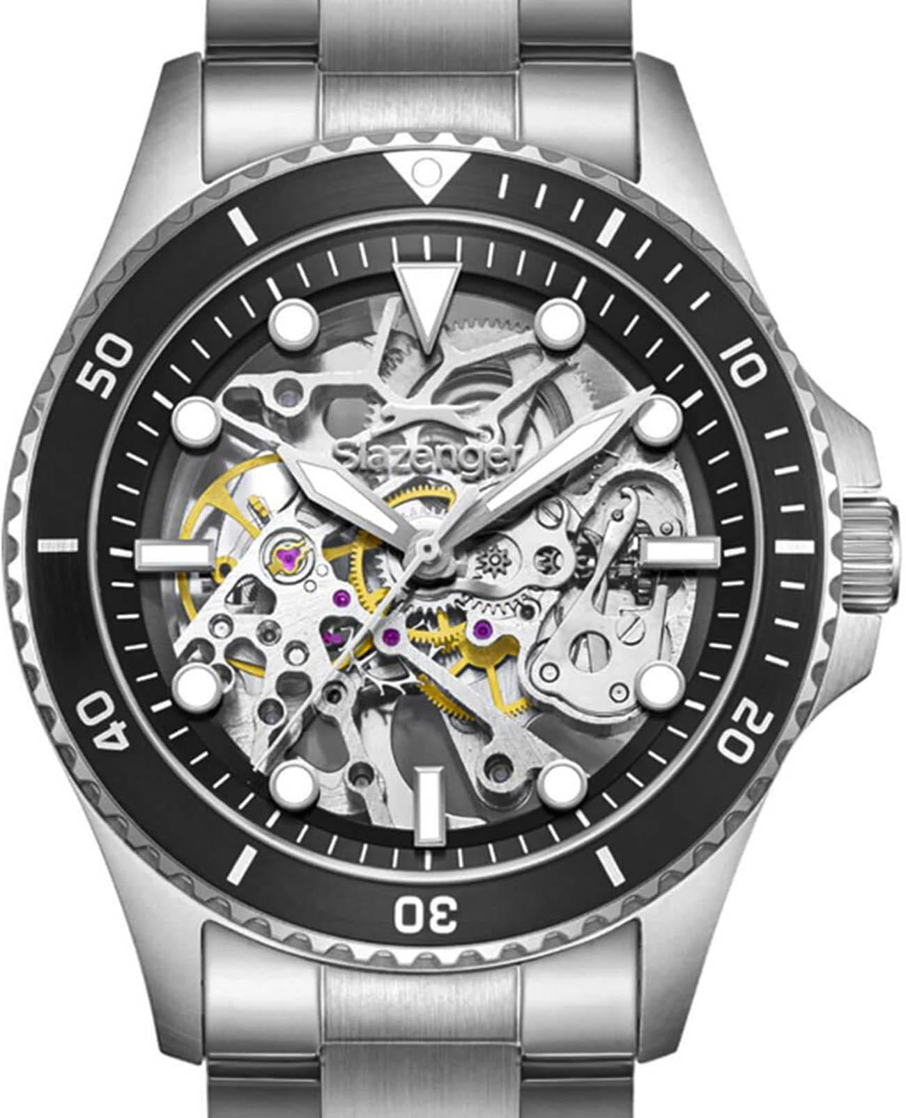 Мужские механические часы с автоподзаводом Slazenger — это выразительный и функциональный аксессуар. Корпус диаметром 42 мм и толщиной 15 мм выполнен из нержавеющей стали 316L. БезельБезельВнешний ободок, закрепляющий стекло. В спортивных часах так называется поворотное кольцо с делениями на циферблате, выполняет роль таймера – замеряет отрезки времени на шкале. Неподвижный безель – элемент декора. Однонаправленно вращающийся безель на дайверских часах позволяет фиксировать моменты погружения и выныривания на поверхность. — однонаправленный вращающийся. Циферблат чёрного цвета частично скелетонизирован, что позволяет наблюдать за работой механизма. Циферблат защищён минеральным стекломМинеральное стеклоМинеральное стекло представляет собой искусственно выращенный минерал кварца. Такое стекло отличается особой устойчивостью к повреждениям и царапинам. Уступает по некоторым качествам сапфировому стеклу.. Механизм — автоматический калибр. Прозрачная задняя крышка открывает вид на декорированный механизм. Стрелки и метки с люминесцентным покрытиемЛюминесцентное покрытиеПозволяет считывать показания времени в темноте. Производители наносят на стрелки, часовые индексы, безель или поверхность циферблата светонакопительный состав, дающий холодное свечение., обеспечивающим хорошую читаемость в темноте. Часы оснащены стальным браслетом с раскладной застёжкойРаскладная застёжкаТакой тип застёжки используется только на браслетах из металла. Она никогда не раскрывается полностью, происходит разделение на 2 и более частей. Раскладывающая застёжка снизит вероятность потери часов к минимуму.. Водонепроницаемость 100 м позволяет использовать часы для плавания и повседневного ношения. Гарантия — 12 месяцев. Идеальный выбор для тех, кто ценит стиль, технологичность и качество.
