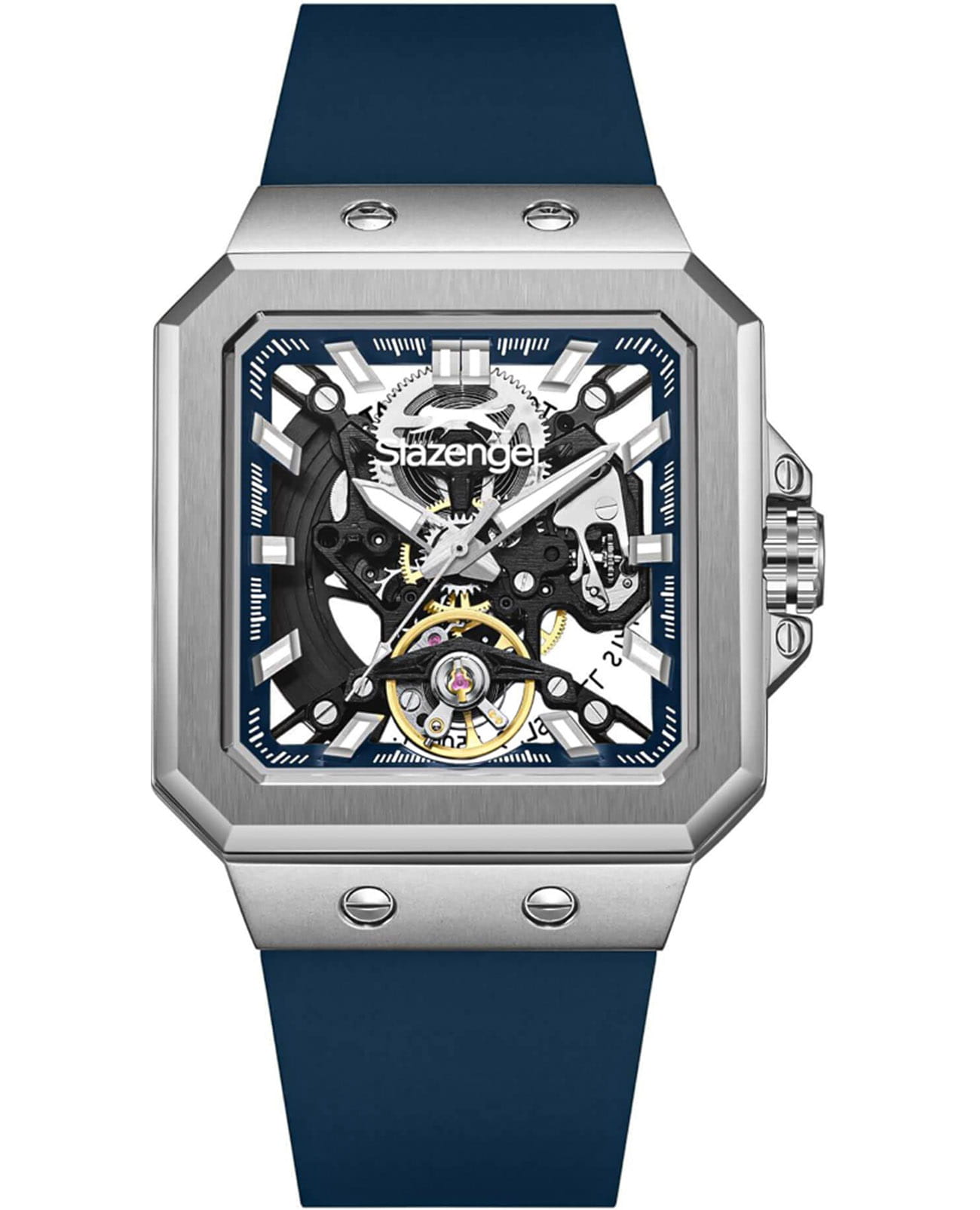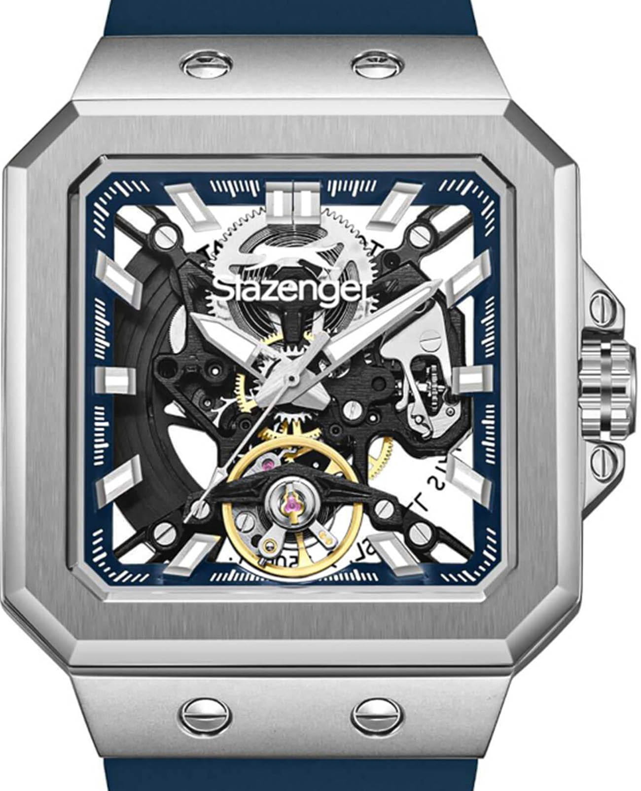 Мужские механические часы с автоподзаводом Slazenger — это выразительный и функциональный аксессуар. Корпус размером 40×51 мм и толщиной 14 мм выполнен из нержавеющей стали 316L. Циферблат синего цвета скелетонизирован, что позволяет наблюдать за работой механизма. Циферблат защищён минеральным стекломМинеральное стеклоМинеральное стекло представляет собой искусственно выращенный минерал кварца. Такое стекло отличается особой устойчивостью к повреждениям и царапинам. Уступает по некоторым качествам сапфировому стеклу.. Стрелки и метки с люминесцентным покрытиемЛюминесцентное покрытиеПозволяет считывать показания времени в темноте. Производители наносят на стрелки, часовые индексы, безель или поверхность циферблата светонакопительный состав, дающий холодное свечение., обеспечивающим хорошую читаемость в темноте. Часы оснащены силиконовым ремешком с стандартной застёжкой. Водонепроницаемость 100 м позволяет использовать часы для плавания и повседневного ношения. Гарантия — 12 месяцев. Идеальный выбор для тех, кто ценит стиль, технологичность и качество.