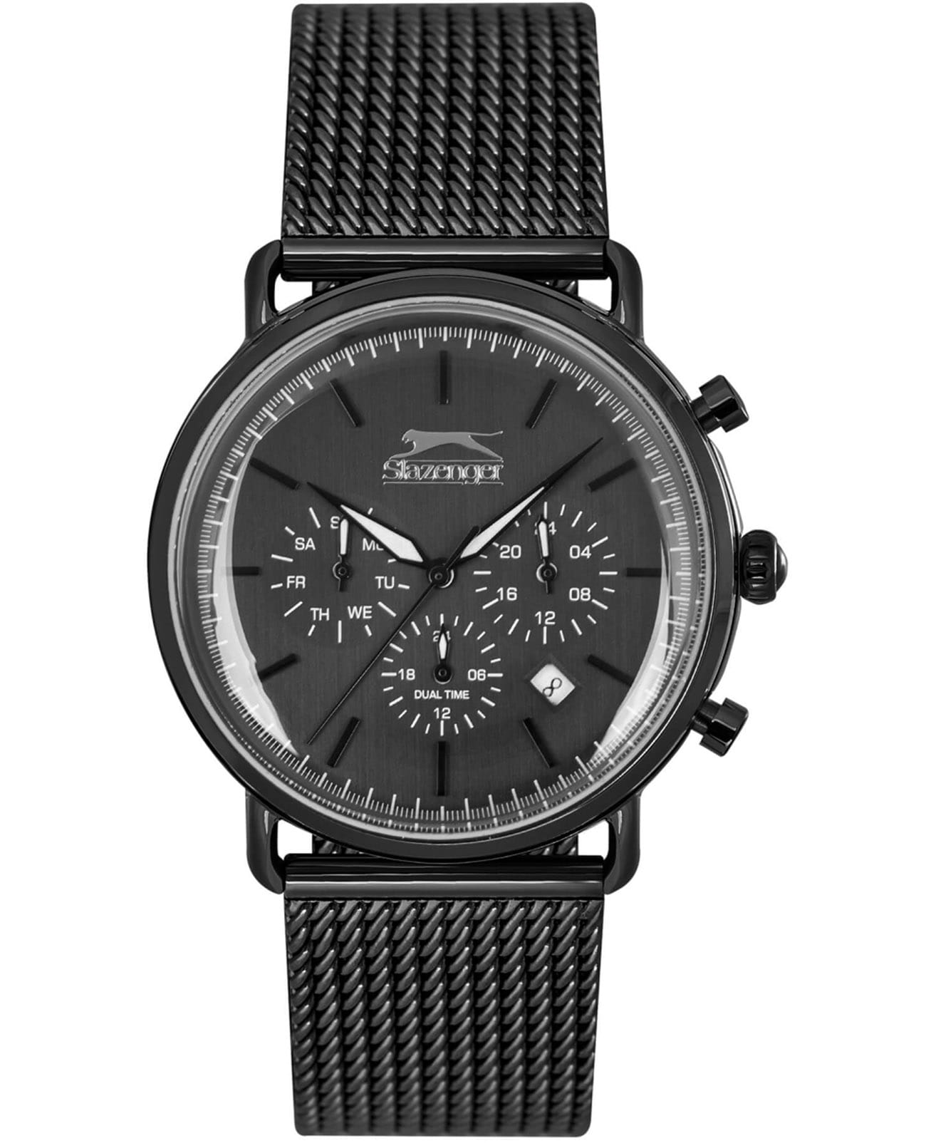 Мужские кварцевые часы Slazenger — стильный и функциональный аксессуар для современного мужчины. Корпус диаметром 43 мм выполнен из суперметалла с IP-покрытиемIP-покрытиеМетод ионного напыления. Демонстрирует повышенную устойчивость к истиранию, окислению и химическим веществам. Под воздействием высокого давления и температуры около 1500°C молекулы металла надёжно соединяются с частицами корпуса часов.. Циферблат чёрного цвета оформлен индексами и стрелками. Указатели дня недели и даты вынесены на отдельные субциферблаты, также присутствует индикация 24-часового формата времени. Стрелки с люминесцентным покрытиемЛюминесцентное покрытиеПозволяет считывать показания времени в темноте. Производители наносят на стрелки, часовые индексы, безель или поверхность циферблата светонакопительный состав, дающий холодное свечение., обеспечивающим хорошую читаемость в темноте. Циферблат защищён минеральным стекломМинеральное стеклоМинеральное стекло представляет собой искусственно выращенный минерал кварца. Такое стекло отличается особой устойчивостью к повреждениям и царапинам. Уступает по некоторым качествам сапфировому стеклу.. Механизм — кварцевый. Часы оснащены браслетом из суперметалла с раскладной застёжкойРаскладная застёжкаТакой тип застёжки используется только на браслетах из металла. Она никогда не раскрывается полностью, происходит разделение на 2 и более частей. Раскладывающая застёжка снизит вероятность потери часов к минимуму.. Водонепроницаемость 50 м позволяет использовать часы в повседневных условиях. Надёжный выбор для тех, кто ценит точность, технологии и уверенный стиль.