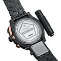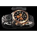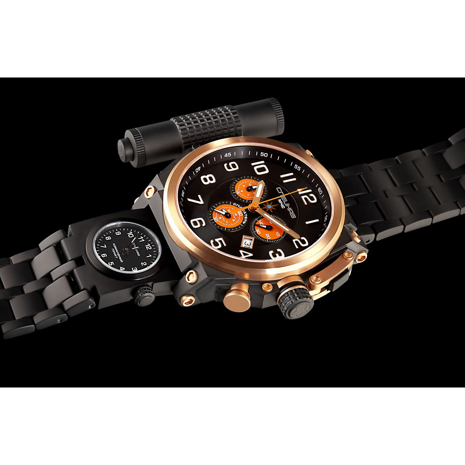 Внутри установлен швейцарский кварцевый механизм Ronda 5130.D, обеспечивающий высокую точность хода. Функции хронографаХронографФункция позволяет измерять отрезки времени с особой точностью: часы, минуты, секунды. Верным признаком хронографа является наличие на циферблате 3 дополнительных окошек-счётчиков. включают секундомер до 12 часов, отображение даты, 24-часовой формат времени и второй часовой пояс, расположенный на браслете.