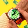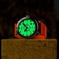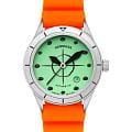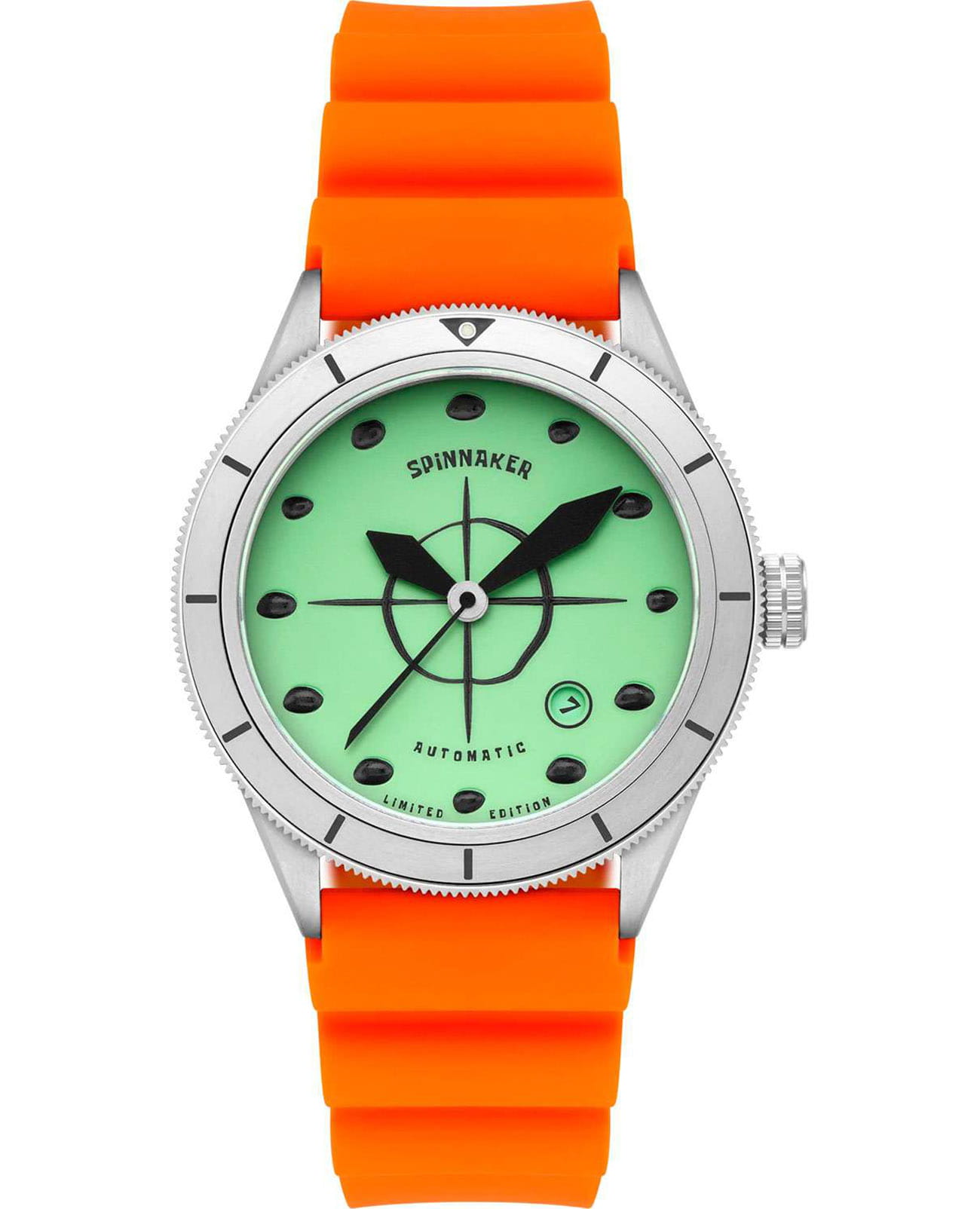 Мужские механические часы с автоподзаводом Spinnaker — это лимитированный и стильный аксессуар. Корпус размером 43×50 мм и толщиной 15 мм выполнен из нержавеющей стали. Циферблат зелёного цвета оформлен 3D-индексами и стрелками. Окошко даты расположено между 4 и 5 часами. Стрелки и метки с люминесцентным покрытиемЛюминесцентное покрытиеПозволяет считывать показания времени в темноте. Производители наносят на стрелки, часовые индексы, безель или поверхность циферблата светонакопительный состав, дающий холодное свечение. Super-LumiNova, обеспечивающим хорошую читаемость в темноте. Циферблат защищён сапфировым стекломСапфировое стеклоПрочный и надёжный материал из кристалла сапфира синтетического происхождения, характеризующийся особой твёрдостью и устойчивостью к царапинам и повреждениям.. Механизм — автоматический калибр Seiko TMI NH35 (24 камня, частота 21 600 полуколебаний в час) с запасом хода до 41 часов. Завинчивающаяся заводная головка повышает водонепроницаемость. Однонаправленный безельБезельВнешний ободок, закрепляющий стекло. В спортивных часах так называется поворотное кольцо с делениями на циферблате, выполняет роль таймера – замеряет отрезки времени на шкале. Неподвижный безель – элемент декора. Однонаправленно вращающийся безель на дайверских часах позволяет фиксировать моменты погружения и выныривания на поверхность. обеспечивает точный контроль времени погружения. Часы оснащены оранжевым каучуковым ремешком шириной 22 мм на стандартной пряжке. Водонепроницаемость 200 м позволяет использовать часы для плавания и дайвинга. Идеальный выбор для тех, кто ценит качество и нестандартный дизайн.