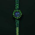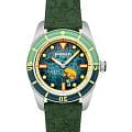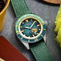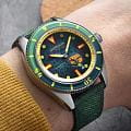 Мужские механические часы с автоподзаводом Spinnaker — это стильный и функциональный аксессуар. Корпус диаметром 43 мм и толщиной 13 мм выполнен из нержавеющей стали. БезельБезельВнешний ободок, закрепляющий стекло. В спортивных часах так называется поворотное кольцо с делениями на циферблате, выполняет роль таймера – замеряет отрезки времени на шкале. Неподвижный безель – элемент декора. Однонаправленно вращающийся безель на дайверских часах позволяет фиксировать моменты погружения и выныривания на поверхность. с IP-покрытиемIP-покрытиеМетод ионного напыления. Демонстрирует повышенную устойчивость к истиранию, окислению и химическим веществам. Под воздействием высокого давления и температуры около 1500°C молекулы металла надёжно соединяются с частицами корпуса часов.. Циферблат зелёного цвета оформлен штрихами, точками и стрелками. Присутствует малая секундная стрелка. Стрелки и метки с люминесцентным покрытиемЛюминесцентное покрытиеПозволяет считывать показания времени в темноте. Производители наносят на стрелки, часовые индексы, безель или поверхность циферблата светонакопительный состав, дающий холодное свечение. Super-LumiNova, обеспечивающим хорошую читаемость в темноте. Циферблат защищён сапфировым стекломСапфировое стеклоПрочный и надёжный материал из кристалла сапфира синтетического происхождения, характеризующийся особой твёрдостью и устойчивостью к царапинам и повреждениям. с антибликовым покрытиемАнтибликовое покрытиеСлой оксида металла в 0,13-0,3 микрон, благодаря которому стекло часов не бликует и не отражает свет. Антибликовое покрытие уменьшает отражение света в 10 раз, обеспечивая отличную читаемость показателей циферблата.. Завинчивающаяся заводная головка повышает водонепроницаемость. Часы оснащены зелёным нейлоновым ремешком на стандартной пряжке. Водонепроницаемость 150 м позволяет использовать часы для плавания. Идеальный выбор для тех, кто ценит качество и нестандартный дизайн.