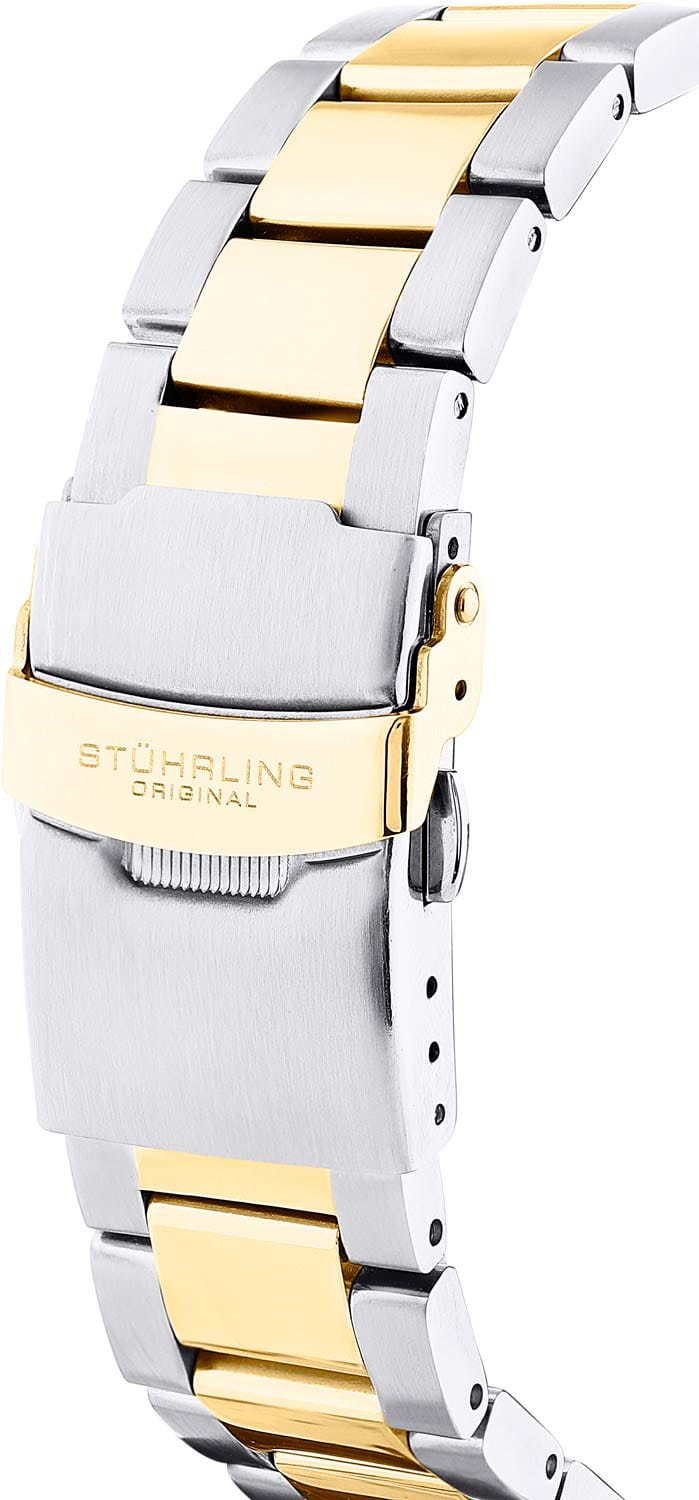 Stuhrling 4048.4 — стильные мужские часы в духе морского дайверского дизайна. Глубокий циферблат с радиальным переливом и крупные метки/стрелки с люминесцентным покрытиемЛюминесцентное покрытиеПозволяет считывать показания времени в темноте. Производители наносят на стрелки, часовые индексы, безель или поверхность циферблата светонакопительный состав, дающий холодное свечение. обеспечивают отличную читаемость, вращающийся безельБезельВнешний ободок, закрепляющий стекло. В спортивных часах так называется поворотное кольцо с делениями на циферблате, выполняет роль таймера – замеряет отрезки времени на шкале. Неподвижный безель – элемент декора. Однонаправленно вращающийся безель на дайверских часах позволяет фиксировать моменты погружения и выныривания на поверхность. с PVD-покрытиемPVDУльтратонкое покрытие наносится в технике вакуумного напыления, сочетает в себе нитрид титана особой прочности со слоем золота или оксида хрома. Несёт в себе декоративную или защитную функцию. подчёркивает спортивный характер. Браслет из нержавеющей стали с частичным PVD-покрытиемPVDУльтратонкое покрытие наносится в технике вакуумного напыления, сочетает в себе нитрид титана особой прочности со слоем золота или оксида хрома. Несёт в себе декоративную или защитную функцию., удобная раскладная застёжкаРаскладная застёжкаТакой тип застёжки используется только на браслетах из металла. Она никогда не раскрывается полностью, происходит разделение на 2 и более частей. Раскладывающая застёжка снизит вероятность потери часов к минимуму. фиксирует часы на запястье. Циферблат прикрыт стеклом KrysternaKrysternaKrysterna — инновационное стекло для наручных часов. Благодаря уникальной структуре, Krysterna объединяет ключевые преимущества двух материалов: твердость сапфира, защищающую от царапин, и гибкость минерального стекла, обеспечивающую устойчивость к деформациям. Такая комбинация делает его идеальным решением для часов, подверженных экстремальным нагрузкам, сохраняя при этом оптическую прозрачность. с высокой стойкостью к царапинам. Надёжный спутник для повседневной настроения и активного отдыха.