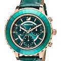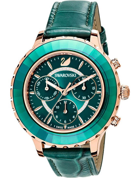 Женские часы Swarovski Octea Lux Chrono 5452498 – это роскошные часы с секундомеромСекундомерСекундоме́р — прибор, способный измерять интервалы времени с точностью до долей секунды. и хронографомХронографФункция позволяет измерять отрезки времени с особой точностью: часы, минуты, секунды. Верным признаком хронографа является наличие на циферблате 3 дополнительных окошек-счётчиков., поистине, образец точности и роскоши, ведь они сочетают в себе лучшие традиции швейцарского часового искусства и неповторимое мастерство Swarovski. Прекрасный аксессуар, подходящий к любому повседневному образу. Часы имеют функцию хронографаХронографФункция позволяет измерять отрезки времени с особой точностью: часы, минуты, секунды. Верным признаком хронографа является наличие на циферблате 3 дополнительных окошек-счётчиков., позволяющую запустить отсчет, остановить его и обнулить результаты. Корпус из нержавеющей стали с PVDPVDУльтратонкое покрытие наносится в технике вакуумного напыления, сочетает в себе нитрид титана особой прочности со слоем золота или оксида хрома. Несёт в себе декоративную или защитную функцию. покрытием оттенка розового золота гармонично сочетается с огранённым кристальным безелемБезельВнешний ободок, закрепляющий стекло. В спортивных часах так называется поворотное кольцо с делениями на циферблате, выполняет роль таймера – замеряет отрезки времени на шкале. Неподвижный безель – элемент декора. Однонаправленно вращающийся безель на дайверских часах позволяет фиксировать моменты погружения и выныривания на поверхность., который встречается только в коллекции часов Swarovski, циферблатом зеленого цвета с рисунком в виде солнечных лучей и ремешком из натуральной кожи с тиснением под крокодила сияют изумрудными оттенками зелёного. Надежное минеральное стеклоМинеральное стеклоМинеральное стекло представляет собой искусственно выращенный минерал кварца. Такое стекло отличается особой устойчивостью к повреждениям и царапинам. Уступает по некоторым качествам сапфировому стеклу. защищает часы от царапин и долго сохраняет первоначальный внешний вид. На часовую, минутную стрелки нанесено люминесцентное покрытиеЛюминесцентное покрытиеПозволяет считывать показания времени в темноте. Производители наносят на стрелки, часовые индексы, безель или поверхность циферблата светонакопительный состав, дающий холодное свечение., которое светится в темноте, создавая необычное изображение.