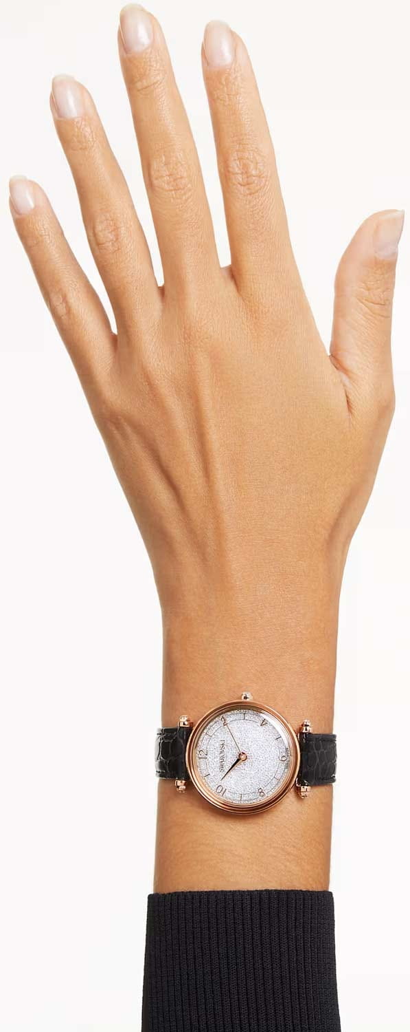 Часы Swarovski 5653359 представляют собой идеальное сочетание роскоши и изысканности, которые подчеркнут вашу индивидуальность и стиль. Эти швейцарские часы оснащены надежным кварцевым механизмом, гарантирующим точность времени. Круглый корпус из нержавеющей стали с PVDPVDУльтратонкое покрытие наносится в технике вакуумного напыления, сочетает в себе нитрид титана особой прочности со слоем золота или оксида хрома. Несёт в себе декоративную или защитную функцию. покрытием оттенка розового золота создает элегантный и утонченный образ. Под куполообразным минеральным стекломМинеральное стеклоМинеральное стекло представляет собой искусственно выращенный минерал кварца. Такое стекло отличается особой устойчивостью к повреждениям и царапинам. Уступает по некоторым качествам сапфировому стеклу. расположен серебристый циферблат, декорированный примерно тысячью сверкающих кристаллов Swarovski. Метки в виде штрихов и арабских цифр добавляют классический акцент, а граненая заводная головка украшена кристаллом круглой огранки. Ремешок из натуральной итальянской телячьей кожи черного цвета, с тиснением под кожу ящерицы, обеспечивает комфорт и стиль, а стандартная застежка гарантирует надежную фиксацию на запястье. Водозащита 50WR позволяет носить часы в различных условиях, защищая их от воздействия влаги. С диаметром корпуса 35 мм и длиной ремешка 16,5 см, эти часы идеально подходят для любого случая, создавая выразительный и эффектный образ.