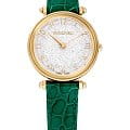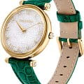 Часы Swarovski 5656893 представляют собой идеальное сочетание роскоши и изысканности, которые подчеркнут вашу индивидуальность и стиль. Эти швейцарские часы оснащены надежным кварцевым механизмом, гарантирующим точность времени. Круглый корпус из нержавеющей стали с PVDPVDУльтратонкое покрытие наносится в технике вакуумного напыления, сочетает в себе нитрид титана особой прочности со слоем золота или оксида хрома. Несёт в себе декоративную или защитную функцию. покрытием оттенка желтого золота создает элегантный и утонченный образ. Под куполообразным минеральным стекломМинеральное стеклоМинеральное стекло представляет собой искусственно выращенный минерал кварца. Такое стекло отличается особой устойчивостью к повреждениям и царапинам. Уступает по некоторым качествам сапфировому стеклу. расположен серебристый циферблат, декорированный примерно тысячью сверкающих кристаллов Swarovski. Метки в виде римских и арабских цифр добавляют классический акцент, а граненая заводная головка украшена кристаллом круглой огранки. Ремешок из натуральной итальянской телячьей кожи зеленого цвета, с тиснением под кожу ящерицы, обеспечивает комфорт и стиль, а стандартная застежка гарантирует надежную фиксацию на запястье. Водозащита 50WR позволяет носить часы в различных условиях, защищая их от воздействия влаги. С диаметром корпуса 35 мм и длиной ремешка 16,5 см, эти часы идеально подходят для любого случая, создавая выразительный и эффектный образ.