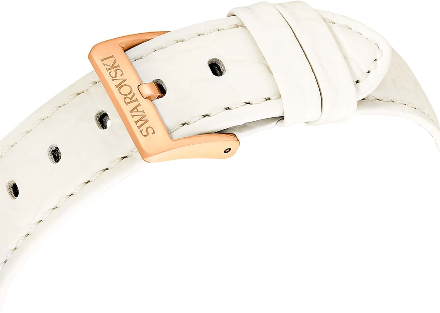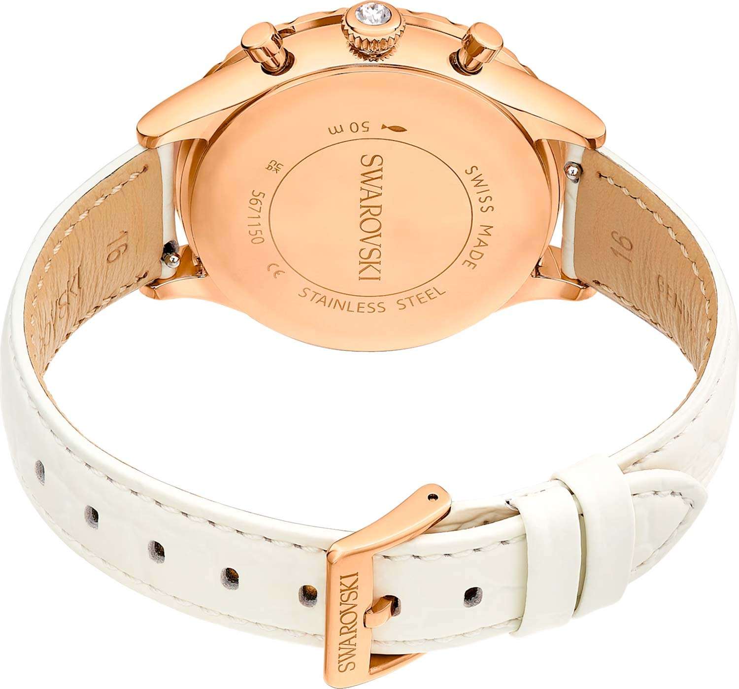Часы Swarovski 5671150 представляют собой изысканное сочетание стиля и функциональности, идеально подходящее для ценителей элегантных аксессуаров. Эти швейцарские кварцевые часы с хронографомХронографФункция позволяет измерять отрезки времени с особой точностью: часы, минуты, секунды. Верным признаком хронографа является наличие на циферблате 3 дополнительных окошек-счётчиков. и секундомеромСекундомерСекундоме́р — прибор, способный измерять интервалы времени с точностью до долей секунды. заключены в корпус из стали с розовым PVDPVDУльтратонкое покрытие наносится в технике вакуумного напыления, сочетает в себе нитрид титана особой прочности со слоем золота или оксида хрома. Несёт в себе декоративную или защитную функцию. покрытием, который дополнен белым циферблатом. Особое внимание привлекает инкрустация кристаллами Swarovski, украшающими корпус и циферблат, создавая эффектный блеск и подчеркивая роскошь изделия. Минеральное стеклоМинеральное стеклоМинеральное стекло представляет собой искусственно выращенный минерал кварца. Такое стекло отличается особой устойчивостью к повреждениям и царапинам. Уступает по некоторым качествам сапфировому стеклу. надежно защищает циферблат, а водозащита 50 WR позволяет не беспокоиться о контакте с водой в повседневных ситуациях. Эти часы не только точные и надежные, благодаря кварцевому механизму, но и невероятно стильные, благодаря кристальному безелюБезельВнешний ободок, закрепляющий стекло. В спортивных часах так называется поворотное кольцо с делениями на циферблате, выполняет роль таймера – замеряет отрезки времени на шкале. Неподвижный безель – элемент декора. Однонаправленно вращающийся безель на дайверских часах позволяет фиксировать моменты погружения и выныривания на поверхность. и белому ремешку из натуральной итальянской телячьей кожи с тиснением под крокодила, что обеспечивает комфортное ношение и стильный внешний вид. Заводная головка дополнительно украшена кристаллом круглой огранки, придающим часам завершенность и изящество. Люминесцентное покрытиеЛюминесцентное покрытиеПозволяет считывать показания времени в темноте. Производители наносят на стрелки, часовые индексы, безель или поверхность циферблата светонакопительный состав, дающий холодное свечение. на стрелках обеспечивает отличную видимость в темноте. Эти часы не просто аксессуар, а настоящее произведение искусства, способное стать ярким акцентом любого образа.