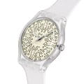 Часы Swatch SO29Z146-5300 — стильный и удобный аксессуар. Часы поддерживают функцию бесконтактной оплаты SwatchPAY!. Матовый светло-бежевый циферблат этих часов украшен серыми рисунками, подписью и авторскими правами художника Кита Харинга, а также интерпретацией логотипа Swatch. Серебристые часовая, минутная и секундная стрелки защищены стеклом из биоматериала. Матовый прозрачный корпус из биоматериала, а также матовые прозрачные ремешок, петля и пряжка завершают дизайн этих часов. Ремешок силиконовый на стандартной застёжке. Внутри часов установлен надежный кварцевый механизм, который обеспечивает точность хода. Эти часы водонепроницаемы до 30 метров, что позволяет не беспокоиться о случайных брызгах или дождевых каплях. Swatch SO29Z146-5300 — это идеальный выбор для тех, кто ценит сочетание стиля, комфорта и функциональности в одном аксессуаре.