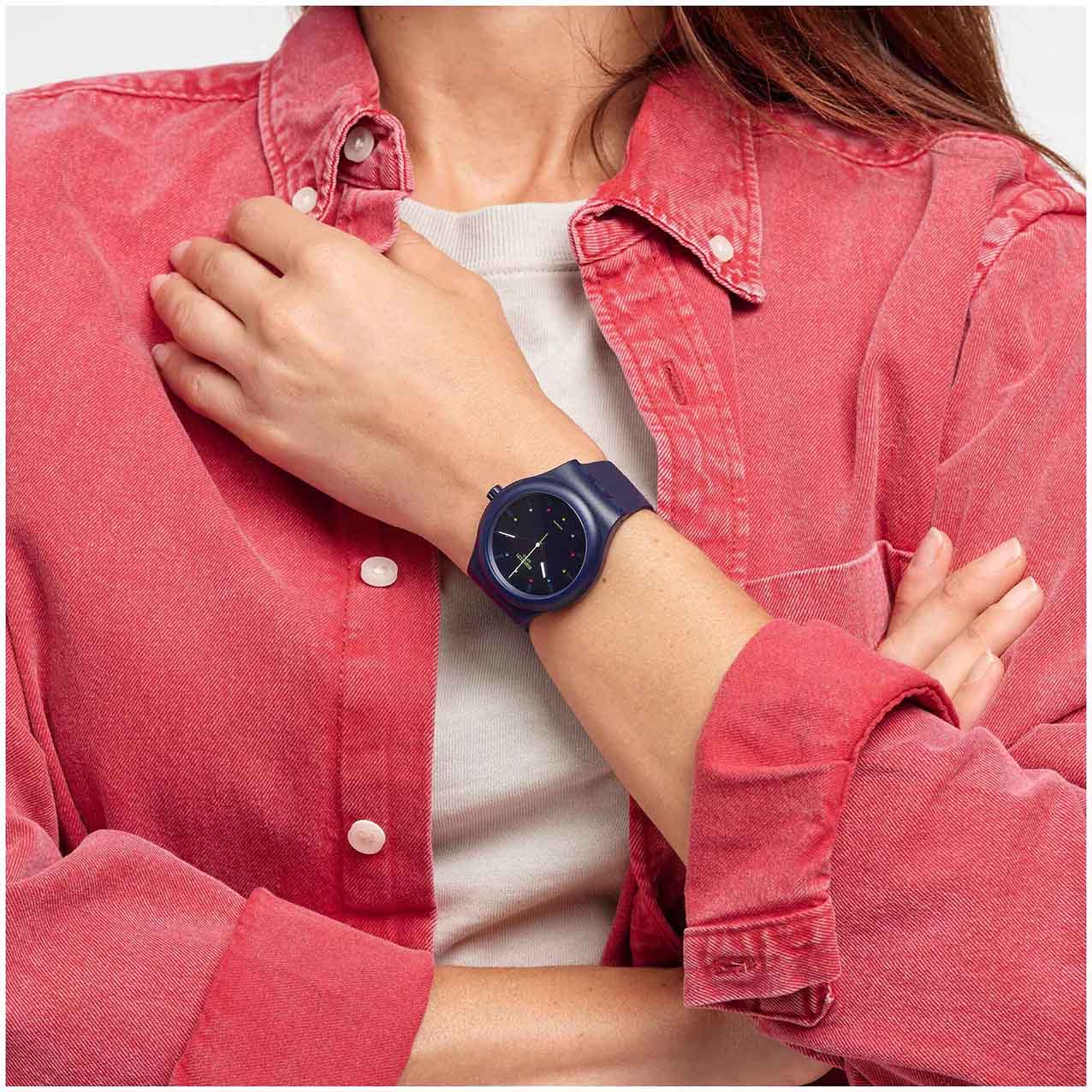 Часы Swatch SO30N400 — стильный и удобный аксессуар. Новейшее дополнение к коллекции 1983 года — это SISTEM51 из биоматериалов. Темно-синий цвет часов украшен цветными индексами, оттенки которых перекликаются с декорированным механизмом, который можно увидеть с задней стороны корпуса часов. На нем написано сообщение, которое является настоящим призывом к действию: "не опаздывай" — в соответствии с моделями Gent и New Gent, уже представленными на рынке. Часы выполнены в темно-синем цвете с ярко-зелеными надписями на циферблате и черно-белыми стрелками. Часовая и минутная стрелки - с люминесцентным покрытиемЛюминесцентное покрытиеПозволяет считывать показания времени в темноте. Производители наносят на стрелки, часовые индексы, безель или поверхность циферблата светонакопительный состав, дающий холодное свечение., светятся в темноте. Ремешок из биоматериала на стандартной застёжке. Эти часы водонепроницаемы до 30 метров, что позволяет не беспокоиться о случайных брызгах или дождевых каплях. Swatch SO30N400 — это идеальный выбор для тех, кто ценит сочетание стиля, комфорта и функциональности в одном аксессуаре.