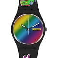 Часы Swatch SO31B101 — стильный и удобный аксессуар. Кварцевые часы с корпусом из биокерамики. Эти часы с радужным градиентом полностью вдохновлены стилем 60-х годов: они имеют корпус из черной биокерамики, стекло из биоматериала, черный силиконовый ремешок с многоцветными напечатанными символами и циферблат с радужным принтом. Слово "Мир" заменяет окно даты на этих часах. Часовая и минутная стрелки - с люминесцентным покрытиемЛюминесцентное покрытиеПозволяет считывать показания времени в темноте. Производители наносят на стрелки, часовые индексы, безель или поверхность циферблата светонакопительный состав, дающий холодное свечение., светятся в темноте. Ремешок силиконовый на стандартной застёжке. Внутри часов установлен надежный кварцевый механизм, который обеспечивает точность хода. Эти часы водонепроницаемы до 30 метров, что позволяет не беспокоиться о случайных брызгах или дождевых каплях. Swatch SO31B101 — это идеальный выбор для тех, кто ценит сочетание стиля, комфорта и функциональности в одном аксессуаре.