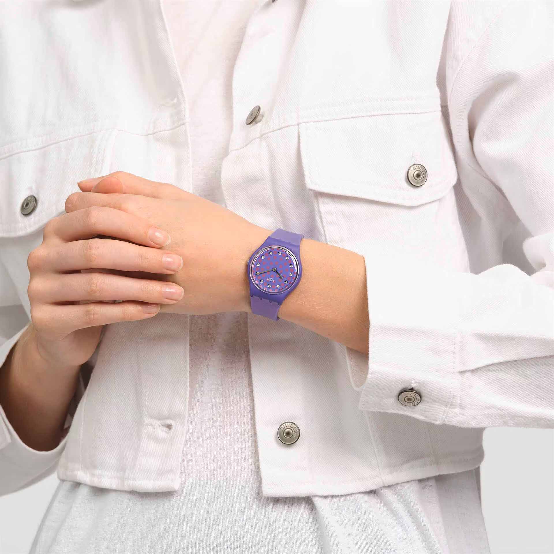 Часы Swatch SO31V100 — стильный и удобный аксессуар. Кварцевые часы с корпусом из биокерамики. Фиолетовые часы, декорированные 12 кристаллами вместо индексов, розовым принтом на циферблате и серебристыми стрелками. Ремешок силиконовый на стандартной застёжке. Внутри часов установлен надежный кварцевый механизм, который обеспечивает точность хода. Эти часы водонепроницаемы до 30 метров, что позволяет не беспокоиться о случайных брызгах или дождевых каплях. Swatch SO31V100 — это идеальный выбор для тех, кто ценит сочетание стиля, комфорта и функциональности в одном аксессуаре.