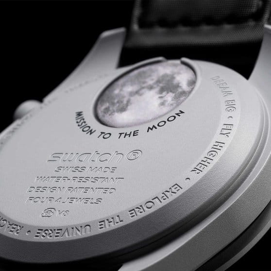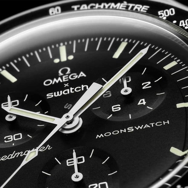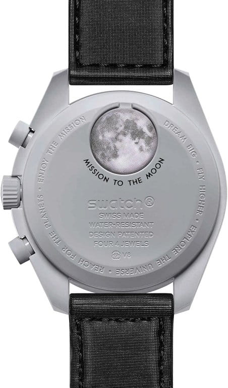 Часы Swatch Bioceramic Moonswatch MISSION TO THE MOON SO33M100 — это стильный и современный аксессуар для тех, кто ценит лёгкость и комфорт. Корпус диаметром 42 мм и пряжка этих уникальных часов изготовлены из биокерамикиБиокерамикаБиокерамика — это материал, который на две трети состоит из керамики, на одну треть — из биопластика. Он сочетает в себе лучшие качества обоих материалов и обладает прочностью и шелковистой на ощупь текстурой., а также ремешок VELCRO®. Модель оснащена черным циферблатом и черным биокерамическим безелемБезельВнешний ободок, закрепляющий стекло. В спортивных часах так называется поворотное кольцо с делениями на циферблате, выполняет роль таймера – замеряет отрезки времени на шкале. Неподвижный безель – элемент декора. Однонаправленно вращающийся безель на дайверских часах позволяет фиксировать моменты погружения и выныривания на поверхность. на который нанесена шкала тахиметраТахиметрРазмеченная шкала, располагается на ободке или безеле часов. Тахиметр позволяет рассчитать скорость на определённом участке пути, расстояние измеряется в километрах или милях.. Общими характеристиками всех часов в данной коллекции являются конструкция стекла из биоматериала, «скрытая» в центре кристалла буква "S", тонкий и изящный круговой узор на внешнем кольце циферблата и заглубленных мини-циферблатах, гладкие ушки с заостренными концами, культовая точка над отметкой 90 на тахиметрической шкале безеля и, конечно же, уникальный материал – биокерамика. Индексы, часовая, минутная и секундная стрелки хронографаХронографФункция позволяет измерять отрезки времени с особой точностью: часы, минуты, секунды. Верным признаком хронографа является наличие на циферблате 3 дополнительных окошек-счётчиков. покрыты люминесцентным покрытиемЛюминесцентное покрытиеПозволяет считывать показания времени в темноте. Производители наносят на стрелки, часовые индексы, безель или поверхность циферблата светонакопительный состав, дающий холодное свечение. Super-LumiNova® класса А, благодаря чему они светятся в темноте. Циферблаты каждых часов в данной коллекции украшены фирменным знаком OMEGA X Swatch, культовым логотипом Speedmaster и логотипом MoonSwatch.
