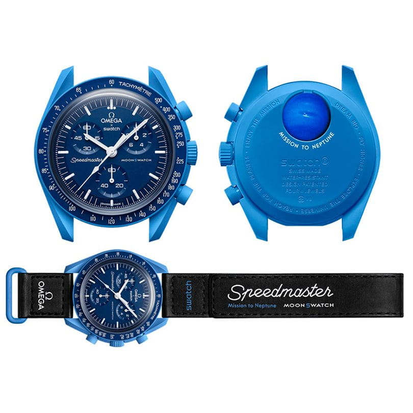 Часы Swatch Bioceramic Moonswatch MISSION TO NEPTUNE SO33N100 — это стильный и современный аксессуар для тех, кто ценит лёгкость и комфорт. Корпус диаметром 42 мм и пряжка этих уникальных часов изготовлены из биокерамикиБиокерамикаБиокерамика — это материал, который на две трети состоит из керамики, на одну треть — из биопластика. Он сочетает в себе лучшие качества обоих материалов и обладает прочностью и шелковистой на ощупь текстурой., а также ремешок VELCRO®. Модель оснащена синим циферблатом и биокерамическим безелемБезельВнешний ободок, закрепляющий стекло. В спортивных часах так называется поворотное кольцо с делениями на циферблате, выполняет роль таймера – замеряет отрезки времени на шкале. Неподвижный безель – элемент декора. Однонаправленно вращающийся безель на дайверских часах позволяет фиксировать моменты погружения и выныривания на поверхность. на который нанесена шкала тахиметраТахиметрРазмеченная шкала, располагается на ободке или безеле часов. Тахиметр позволяет рассчитать скорость на определённом участке пути, расстояние измеряется в километрах или милях.. Общими характеристиками всех часов в данной коллекции являются конструкция стекла из биоматериала, «скрытая» в центре кристалла буква "S", тонкий и изящный круговой узор на внешнем кольце циферблата и заглубленных мини-циферблатах, гладкие ушки с заостренными концами, культовая точка над отметкой 90 на тахиметрической шкале безеля и, конечно же, уникальный материал – биокерамика. Индексы, часовая, минутная и секундная стрелки хронографаХронографФункция позволяет измерять отрезки времени с особой точностью: часы, минуты, секунды. Верным признаком хронографа является наличие на циферблате 3 дополнительных окошек-счётчиков. покрыты люминесцентным покрытиемЛюминесцентное покрытиеПозволяет считывать показания времени в темноте. Производители наносят на стрелки, часовые индексы, безель или поверхность циферблата светонакопительный состав, дающий холодное свечение. Super-LumiNova® класса А, благодаря чему они светятся в темноте. Циферблаты каждых часов в данной коллекции украшены фирменным знаком OMEGA X Swatch, культовым логотипом Speedmaster и логотипом MoonSwatch.