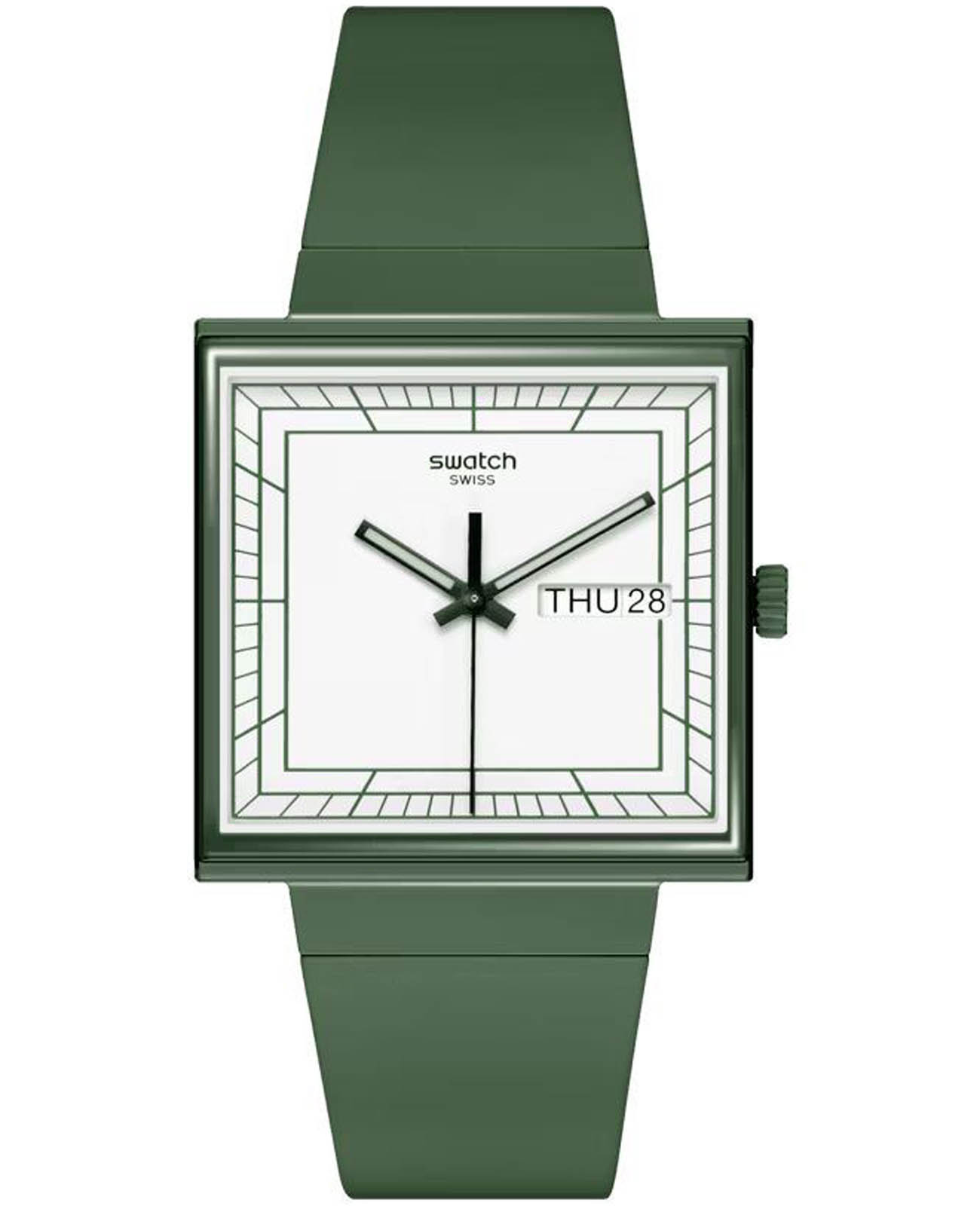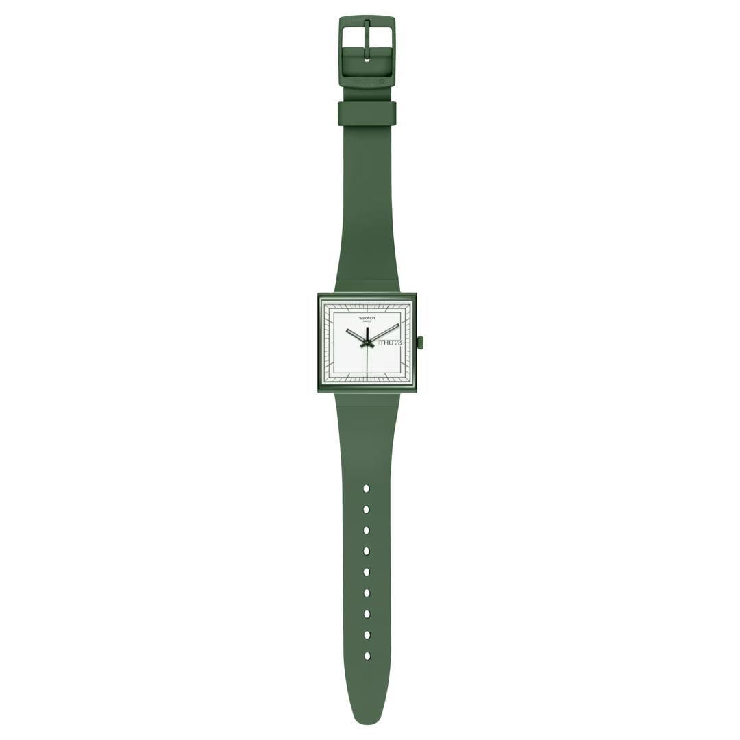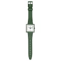 Swatch New Gent Bioceramic Standard SO34G700 "WHAT IF...GREEN?" - это стильные квадратные часы с корпусом 41.8 x 41.8 мм из зеленой матовой биокерамики и белым циферблатом. Модель оснащена кварцевым механизмом, окошком даты и дня недели, водонепроницаемостью до 20 метров. Часы имеют зеленый матовый ремешок из биоматериала и стекло из биоматериала. Стрелки с люминесцентным покрытиемЛюминесцентное покрытиеПозволяет считывать показания времени в темноте. Производители наносят на стрелки, часовые индексы, безель или поверхность циферблата светонакопительный состав, дающий холодное свечение.. Эта экологичная модель унисекс сочетает инновационные материалы с необычным зелено-белым дизайном, вдохновленным оригинальным Swatch 1983 года, и подходит для тех, кто ценит минимализм и заботу об окружающей среде.