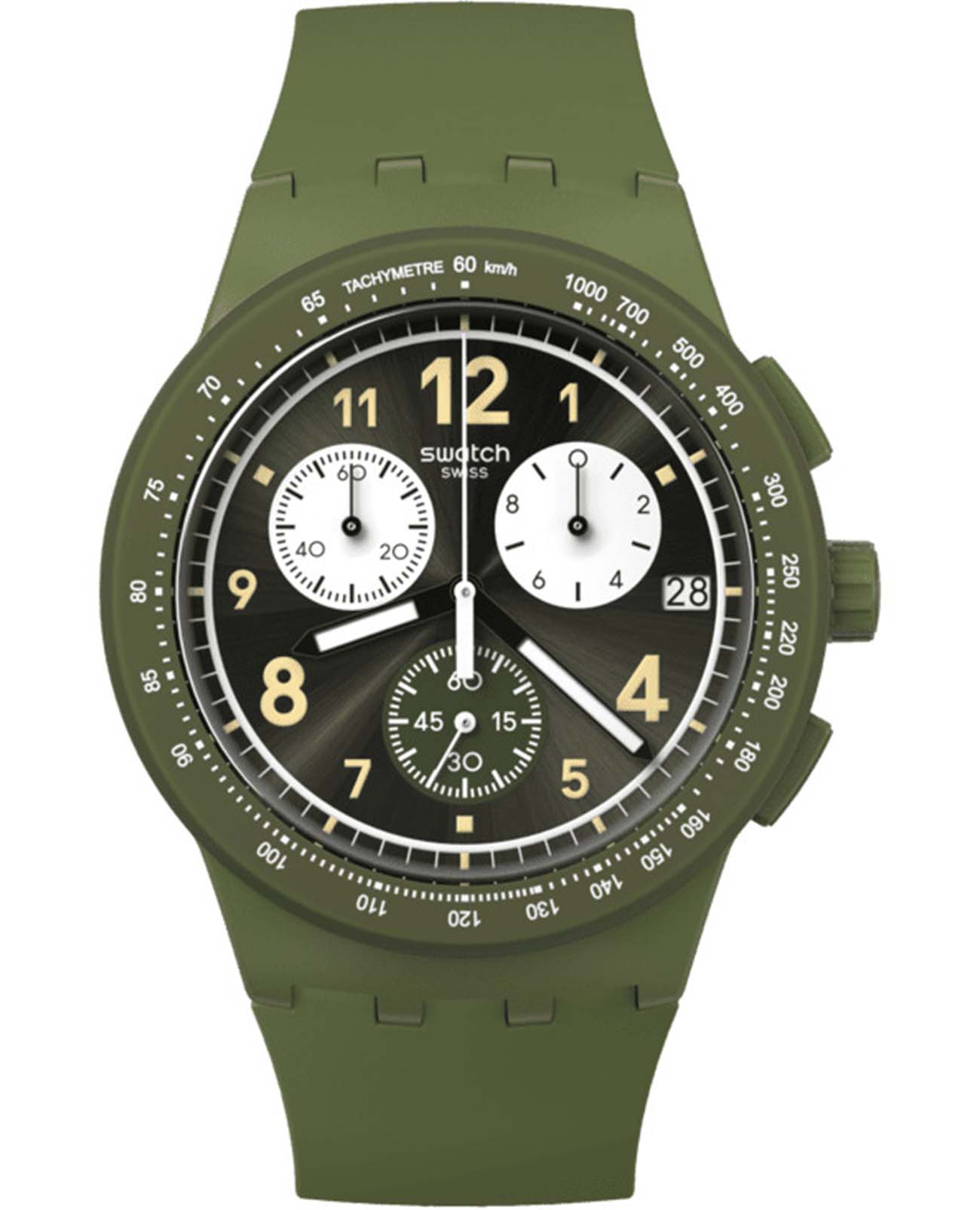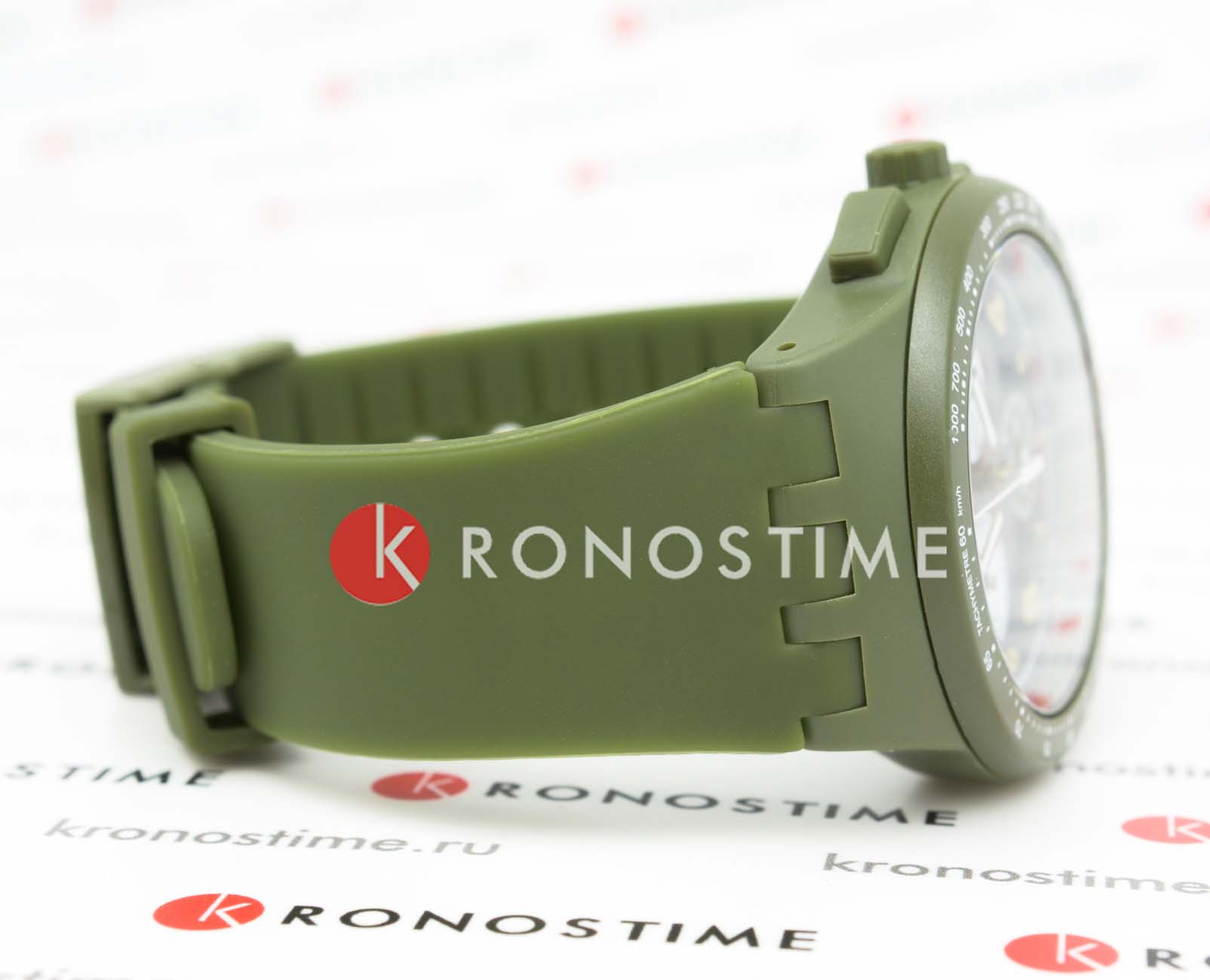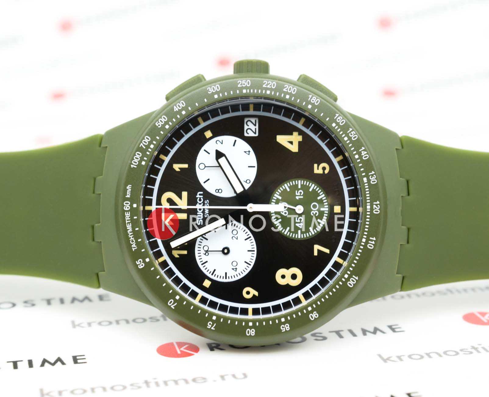 Часы Swatch SUSG406 — это стильный и современный аксессуар для тех, кто ценит лёгкость и комфорт. Часы идеально подойдут как для мужчин, так и для женщин. Этот хронографХронографФункция позволяет измерять отрезки времени с особой точностью: часы, минуты, секунды. Верным признаком хронографа является наличие на циферблате 3 дополнительных окошек-счётчиков. темно-зеленой расцветки хаки имеет черно-зеленый циферблат с радиальной полировкой, часовую и минутную стрелки черного цвета с люминесцентным покрытиемЛюминесцентное покрытиеПозволяет считывать показания времени в темноте. Производители наносят на стрелки, часовые индексы, безель или поверхность циферблата светонакопительный состав, дающий холодное свечение., светящиеся в темноте, белую секундную стрелку и окошко календаря на уровне 3-часовой отметки. На фоне матового корпуса и такого же ремешка с тренчиком и пряжкой в тон рельефно выделяется зеленый безельБезельВнешний ободок, закрепляющий стекло. В спортивных часах так называется поворотное кольцо с делениями на циферблате, выполняет роль таймера – замеряет отрезки времени на шкале. Неподвижный безель – элемент декора. Однонаправленно вращающийся безель на дайверских часах позволяет фиксировать моменты погружения и выныривания на поверхность. с белым принтом. Водозащита 30 метров делает часы практичными для повседневного использования. Эти часы подойдут для повседневного ношения и станут ярким акцентом в вашем наряде.