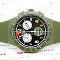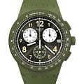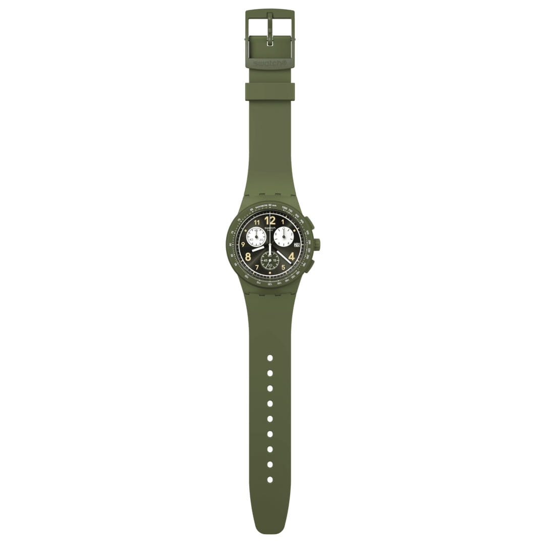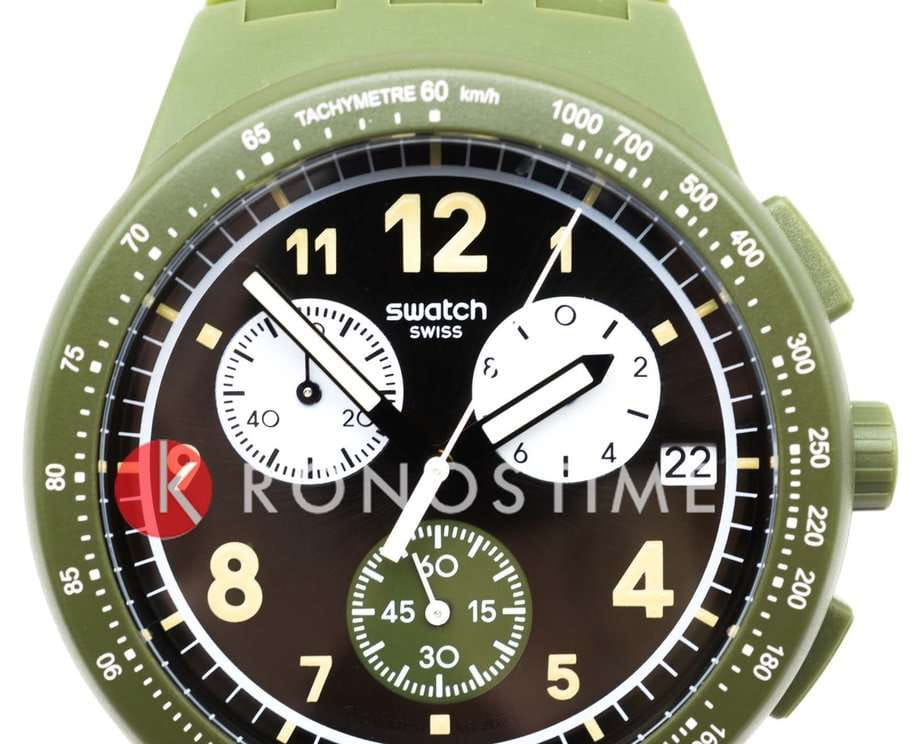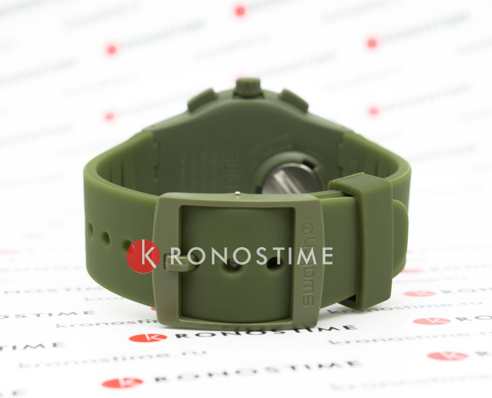 Часы Swatch SUSG406 — это стильный и современный аксессуар для тех, кто ценит лёгкость и комфорт. Часы идеально подойдут как для мужчин, так и для женщин. Этот хронографХронографФункция позволяет измерять отрезки времени с особой точностью: часы, минуты, секунды. Верным признаком хронографа является наличие на циферблате 3 дополнительных окошек-счётчиков. темно-зеленой расцветки хаки имеет черно-зеленый циферблат с радиальной полировкой, часовую и минутную стрелки черного цвета с люминесцентным покрытиемЛюминесцентное покрытиеПозволяет считывать показания времени в темноте. Производители наносят на стрелки, часовые индексы, безель или поверхность циферблата светонакопительный состав, дающий холодное свечение., светящиеся в темноте, белую секундную стрелку и окошко календаря на уровне 3-часовой отметки. На фоне матового корпуса и такого же ремешка с тренчиком и пряжкой в тон рельефно выделяется зеленый безельБезельВнешний ободок, закрепляющий стекло. В спортивных часах так называется поворотное кольцо с делениями на циферблате, выполняет роль таймера – замеряет отрезки времени на шкале. Неподвижный безель – элемент декора. Однонаправленно вращающийся безель на дайверских часах позволяет фиксировать моменты погружения и выныривания на поверхность. с белым принтом. Водозащита 30 метров делает часы практичными для повседневного использования. Эти часы подойдут для повседневного ношения и станут ярким акцентом в вашем наряде.
