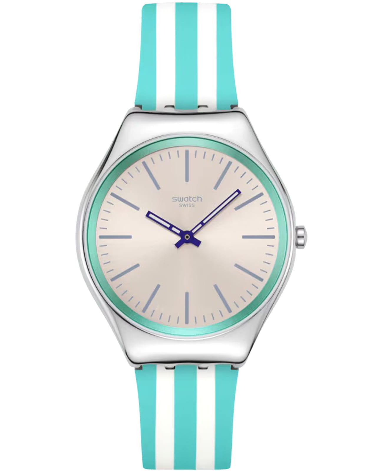 Женские наручные ультратонкие часы Swatch BEACH HOUR SYXS160 — это стильный и современный аксессуар для тех, кто ценит лёгкость и комфорт. Блестящий корпус и пряжка выполнены из нержавеющей стали серебристого цвета, диаметром 38 мм и толщиной 5.8 мм, что обеспечивает долговечность и утончённый внешний вид. Циферблат защищён органическим стеклом, устойчивым к повреждениям. Модель оснащена кварцевым механизмом, обеспечивающим высокую точность хода. Стрелки с люминесцентным покрытиемЛюминесцентное покрытиеПозволяет считывать показания времени в темноте. Производители наносят на стрелки, часовые индексы, безель или поверхность циферблата светонакопительный состав, дающий холодное свечение.. Матовым силиконовый ремешок на стандартной застёжке гармонично дополняет корпус и обеспечивает комфортное ношение. Водозащита 30 метров делает часы практичными для повседневного использования. Эти часы подойдут для повседневного ношения и станут ярким акцентом в вашем наряде.