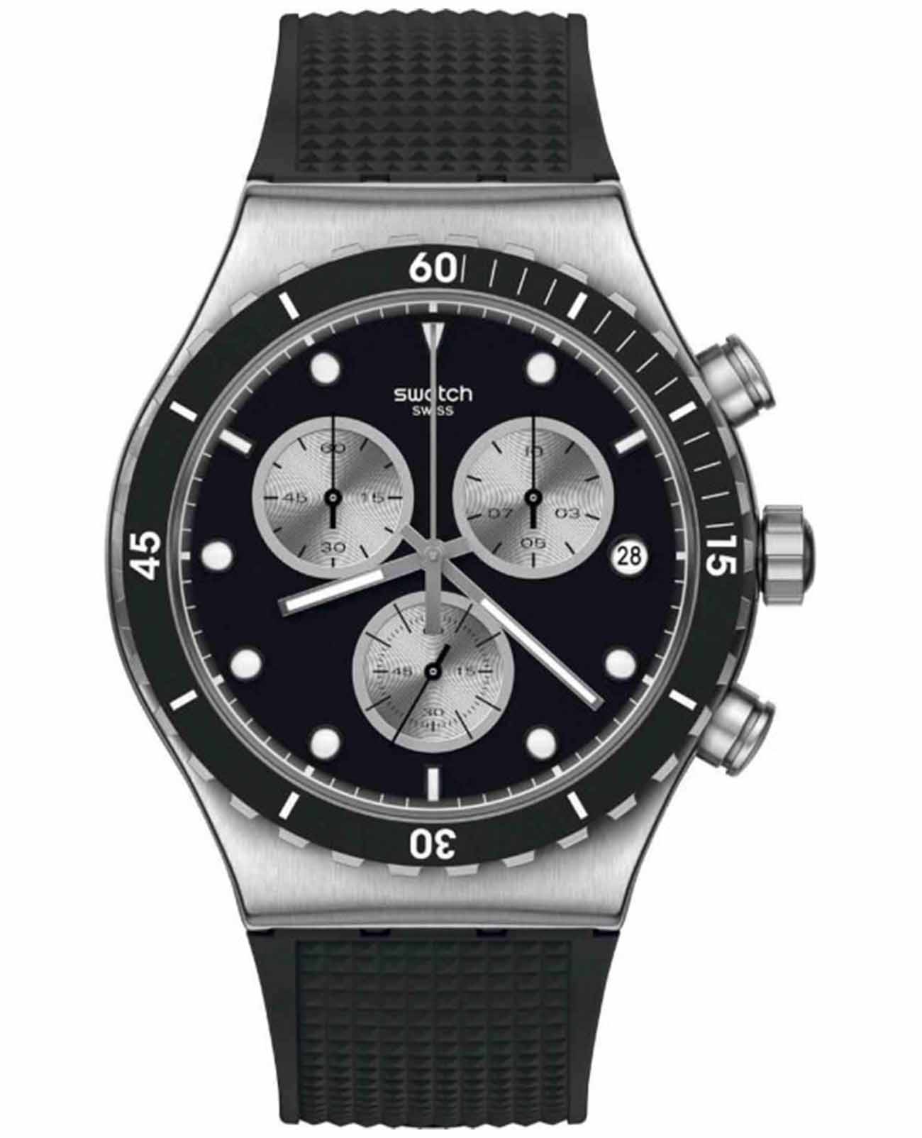 Часы Swatch YVS487 — это стильный и современный аксессуар для тех, кто ценит лёгкость и комфорт. Эта стильная модель часов из нержавеющей стали дополнена черным каучуковым ремешкомс фактурным верхом и матовой застежкой из нержавеющей стали. Но изюминка этих часов — матовый черный циферблат с серебристыми счетчиками хронографаХронографФункция позволяет измерять отрезки времени с особой точностью: часы, минуты, секунды. Верным признаком хронографа является наличие на циферблате 3 дополнительных окошек-счётчиков. и серебристыми индексами, и стрелками с люминесцентным покрытиемЛюминесцентное покрытиеПозволяет считывать показания времени в темноте. Производители наносят на стрелки, часовые индексы, безель или поверхность циферблата светонакопительный состав, дающий холодное свечение.. Завершают образ индикатор даты в положении «3 часа» на циферблате, а также серебристые цифры и индексы на безелеБезельВнешний ободок, закрепляющий стекло. В спортивных часах так называется поворотное кольцо с делениями на циферблате, выполняет роль таймера – замеряет отрезки времени на шкале. Неподвижный безель – элемент декора. Однонаправленно вращающийся безель на дайверских часах позволяет фиксировать моменты погружения и выныривания на поверхность. из нержавеющей стали с черным PVDPVDУльтратонкое покрытие наносится в технике вакуумного напыления, сочетает в себе нитрид титана особой прочности со слоем золота или оксида хрома. Несёт в себе декоративную или защитную функцию. покрытием. Водозащита 30 метров делает часы практичными для повседневного использования. Эти часы подойдут для повседневного ношения и станут ярким акцентом в вашем наряде.