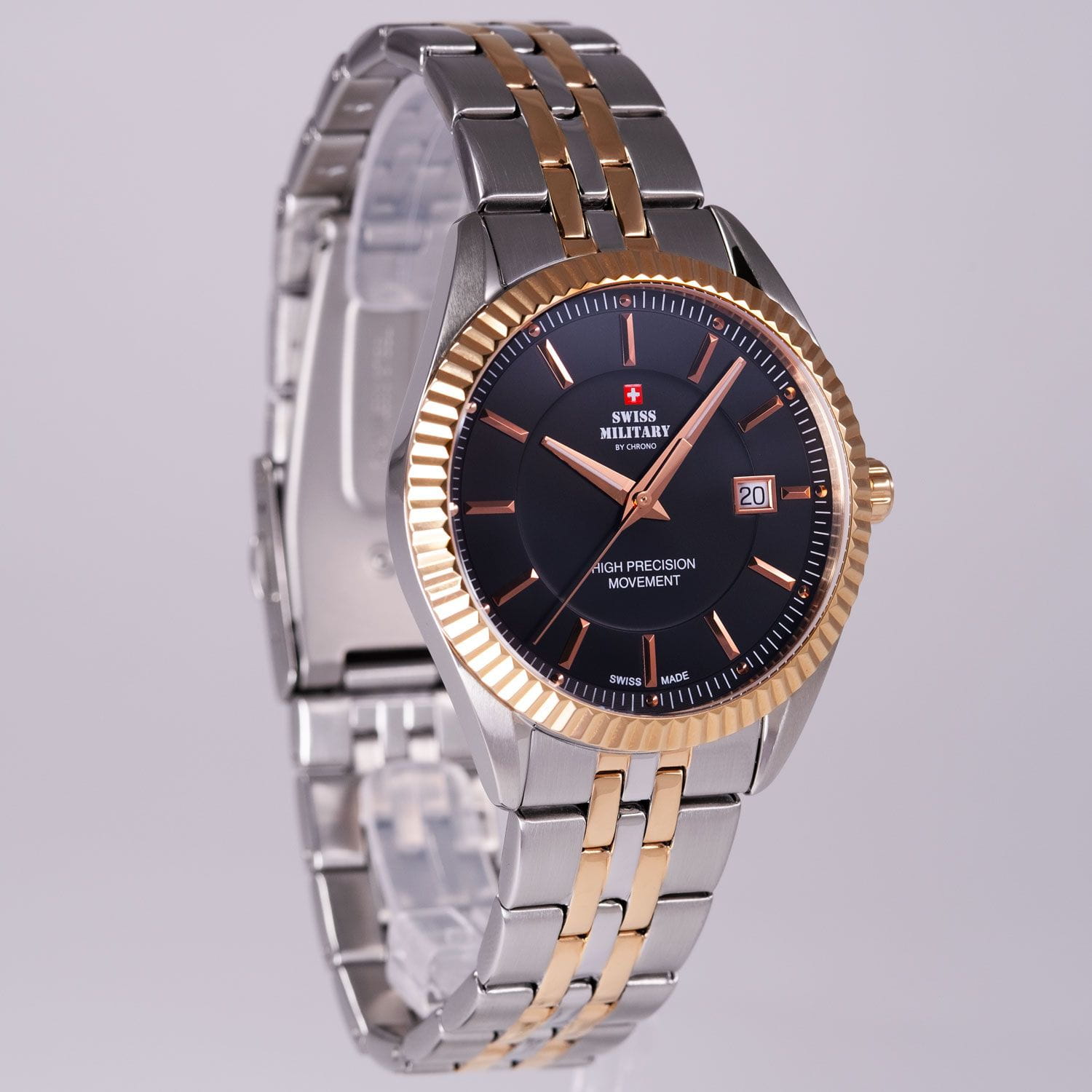 Мужские швейцарские наручные часы Swiss Military by Chrono SM34065.06, кварцевый механизм с высокой точностью. Класс водозащиты: 50 метров, позволит защитить корпус от случайных брызг или капель дождя. Корпус и браслет часов изготовлены из стали с частичным PVDPVDУльтратонкое покрытие наносится в технике вакуумного напыления, сочетает в себе нитрид титана особой прочности со слоем золота или оксида хрома. Несёт в себе декоративную или защитную функцию. цвета розовое золото. Стальной браслет с раскладывающейся застёжкойРаскладная застёжкаТакой тип застёжки используется только на браслетах из металла. Она никогда не раскрывается полностью, происходит разделение на 2 и более частей. Раскладывающая застёжка снизит вероятность потери часов к минимуму..