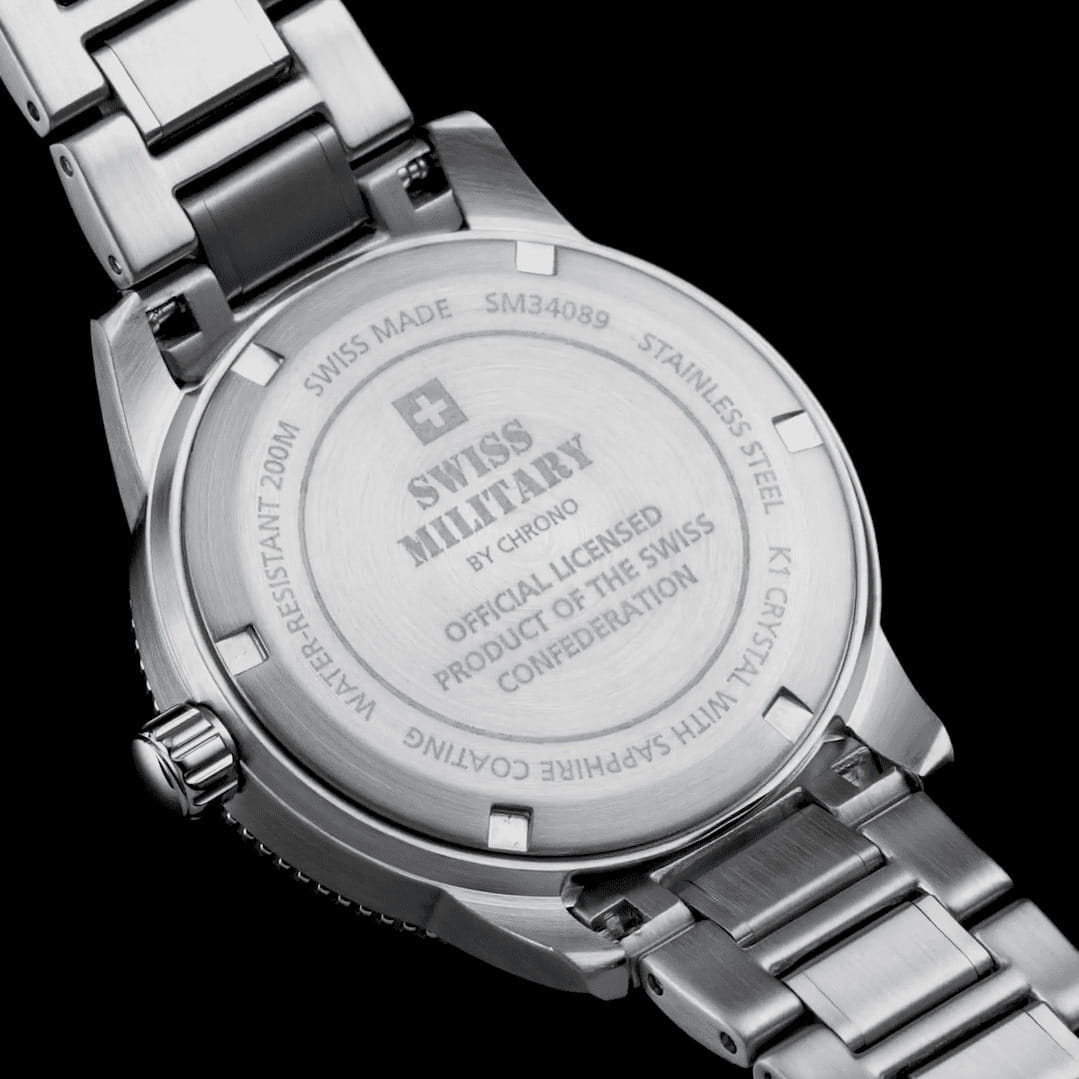 Швейцарский кварцевый механизм. Центральные часовая, минутная и секундная стрелки, окошко даты. Часы оснащены функцией EOL - индикация низкого уровня заряда батареи. Стекло K1 - уникальный материал, сочетающий в себе твёрдость сапфирового стекла и прочность минерального. На стрелки и маркеры часов нанесен светонакопительный состав. Однонаправленный поворотный безель. Завинчивающаяся заводная головка. Регулируемый по длине литой браслет из нержавеющей стали. Браслетный замок с тройным сгибом, расстегиваемый одним касанием. Часы имеют маркировку Swiss Made являющуюся гарантом, что все комплектующие и сборка часов произведены на территории Швейцарии. Право нанесения данной маркировки на наручные часы регулируется швейцарскими и международными законами.