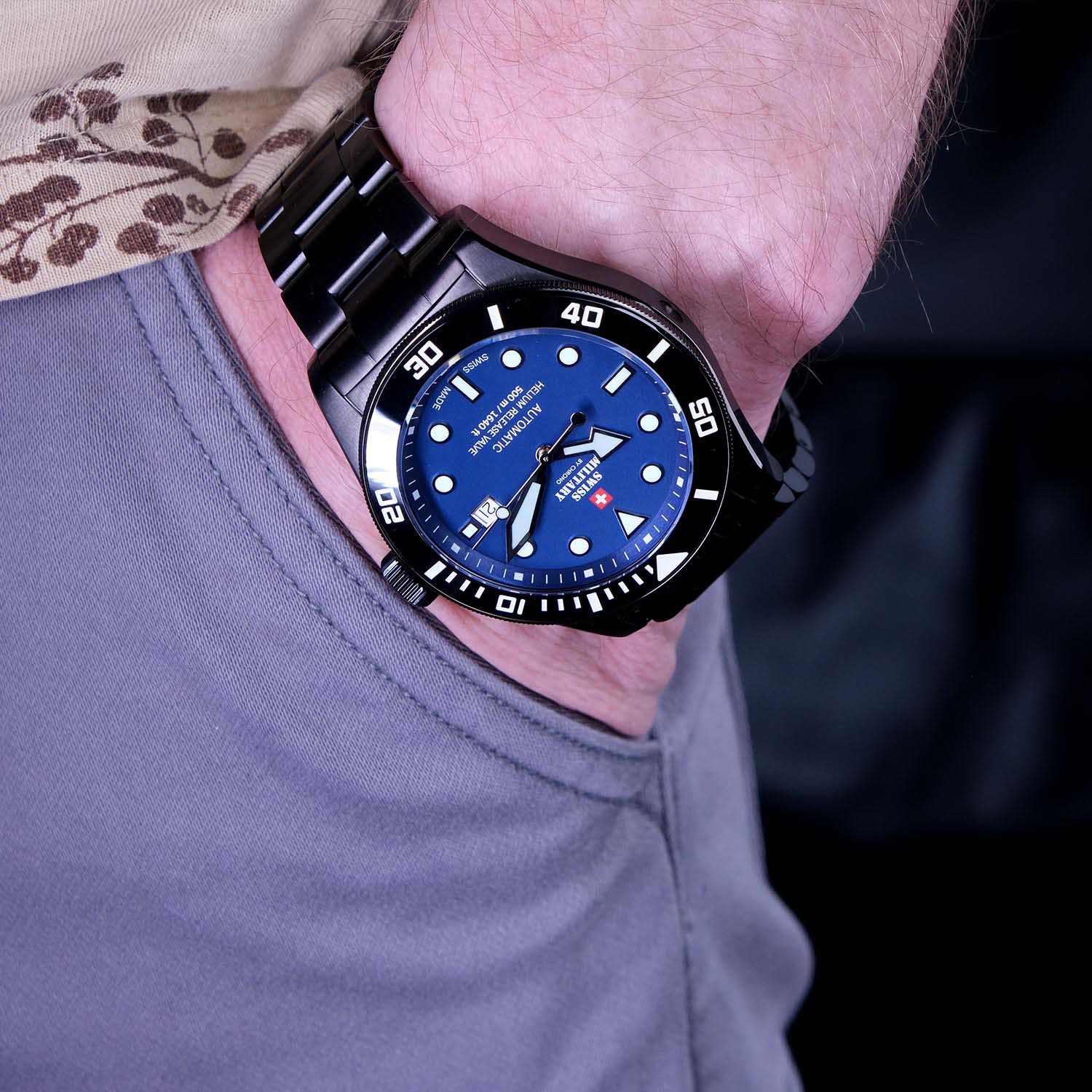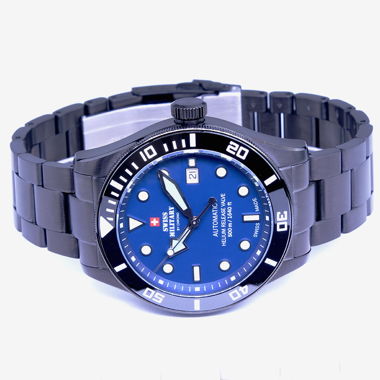 Мужские швейцарские механические часы с автоподзаводом Swiss Military by Chrono Diver SMA34075.09, механический механизм (автоматический калибр) с высокой точностью. Сапфировое стеклоСапфировое стеклоПрочный и надёжный материал из кристалла сапфира синтетического происхождения, характеризующийся особой твёрдостью и устойчивостью к царапинам и повреждениям. устойчивое к появлению царапин, обладающее высокой прозрачностью. Корпус часов изготовлен из стали с PVD-покрытиемPVDУльтратонкое покрытие наносится в технике вакуумного напыления, сочетает в себе нитрид титана особой прочности со слоем золота или оксида хрома. Несёт в себе декоративную или защитную функцию. матового черного цвета, который обрамляет керамический безельБезельВнешний ободок, закрепляющий стекло. В спортивных часах так называется поворотное кольцо с делениями на циферблате, выполняет роль таймера – замеряет отрезки времени на шкале. Неподвижный безель – элемент декора. Однонаправленно вращающийся безель на дайверских часах позволяет фиксировать моменты погружения и выныривания на поверхность.. На синем циферблате центральные часовая, минутная и секундная стрелки и апертура даты в позиции 3 часов. Стальной браслет с PVD-покрытиемPVDУльтратонкое покрытие наносится в технике вакуумного напыления, сочетает в себе нитрид титана особой прочности со слоем золота или оксида хрома. Несёт в себе декоративную или защитную функцию. матового черного цвета, раскладывающаяся застёжкаРаскладная застёжкаТакой тип застёжки используется только на браслетах из металла. Она никогда не раскрывается полностью, происходит разделение на 2 и более частей. Раскладывающая застёжка снизит вероятность потери часов к минимуму..